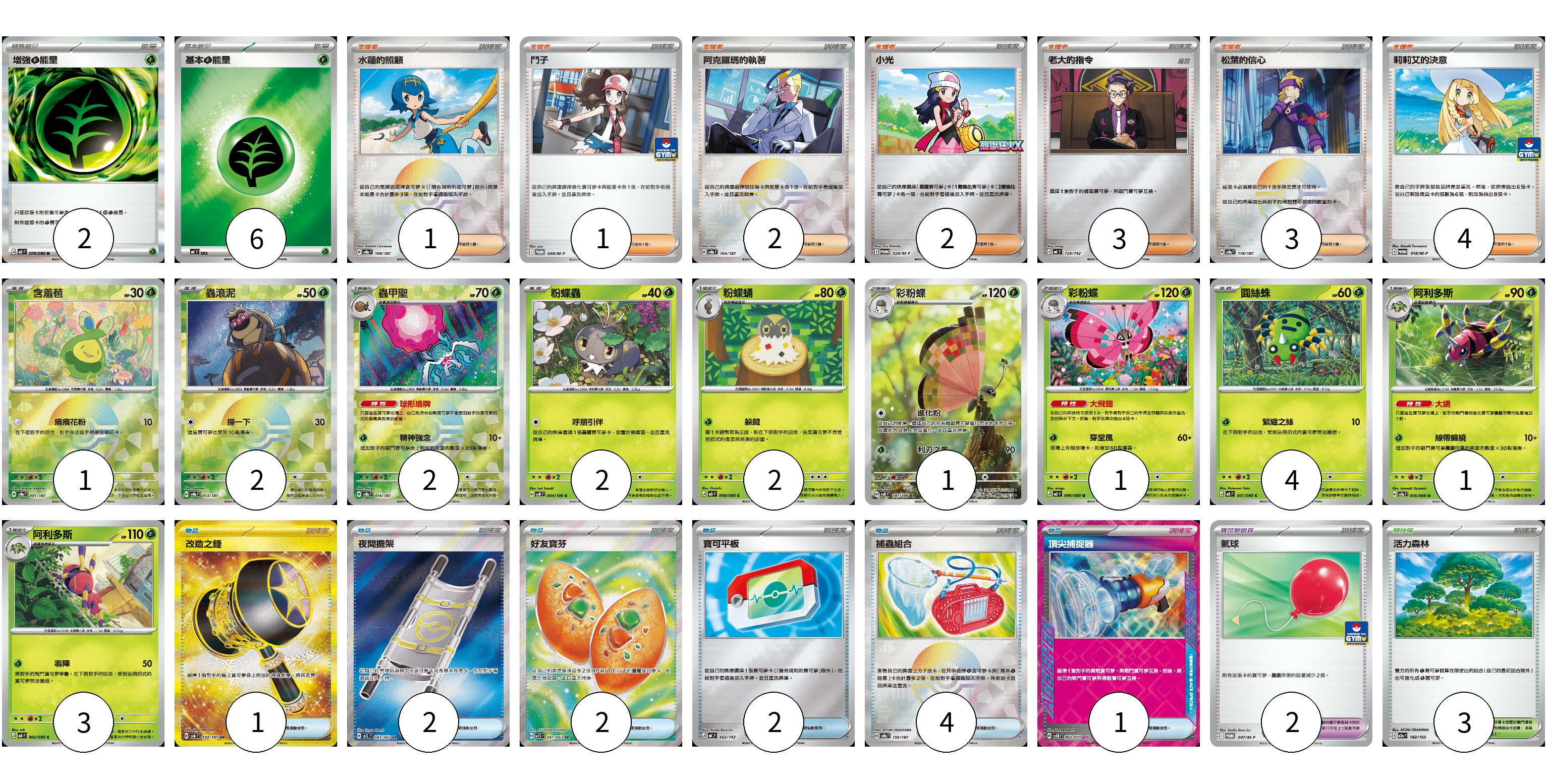 牌組構築方案 以此牌組為基礎新構築牌組 顯示卡面 顯示列表 寶可夢卡(19) 1 2 2 2 2 1 1 4 1 3 寶可夢道具(2) 2 物品卡(12) 1 2 2 2 4 1 支援者卡(16) 1 1 2 2 3 3 4 競技場卡(3) 3 能量卡(8) 2 6 寶可夢卡(19) 卡牌名稱 張數 卡牌名稱 張數 含羞苞 SV8a 001/187 01 蟲滾泥 SV8a 013/187 02 蟲甲聖 SV8a 014/187 02 粉蝶蟲 SV8 004/106 02 粉蝶蛹 M3 008/080 02 彩粉蝶 SV8 107/106 01 彩粉蝶 M3 009/080 01 圓絲蛛 M3 001/080 04 阿利多斯 SV5a 005/066 01 阿利多斯 M3 002/080 03 寶可夢道具(2) 卡牌名稱 張數 卡牌名稱 張數 氣球 M-P 047/M-P 02 物品卡(12) 卡牌名稱 張數 卡牌名稱 張數 改造之錘 SV6 132/101 01 夜間擔架 M1L 083/063 02 好友寶芬 M1S 081/063 02 寶可平板 MC 662/742 02 捕蟲組合 SV8a 150/187 04 頂尖捕捉器 SV5M 062/071 01 支援者卡(16) 卡牌名稱 張數 卡牌名稱 張數 水蓮的照顧 SV8a 168/187 01 鬥子 M-P 048/M-P 01 阿克羅瑪的執著 SV8a 164/187 02 小光 M-P 028/M-P 02 老大的指令 MC 724/742 03 松葉的信心 SV8a 178/187 03 莉莉艾的決意 M-P 018/M-P 04 競技場卡(3) 卡牌名稱 張數 卡牌名稱 張數 活力森林 M2a 182/193 03 能量卡(8) 卡牌名稱 張數 卡牌名稱 張數 增強【草】能量 M3 078/080 02 基本【草】能量 MC GRA 06 以此牌組為基礎新構築牌組 牌組編碼 bOKKeY-qKWMxy-BvMqGA copy 列印牌組單 牌組編碼已複製 分享至SNS