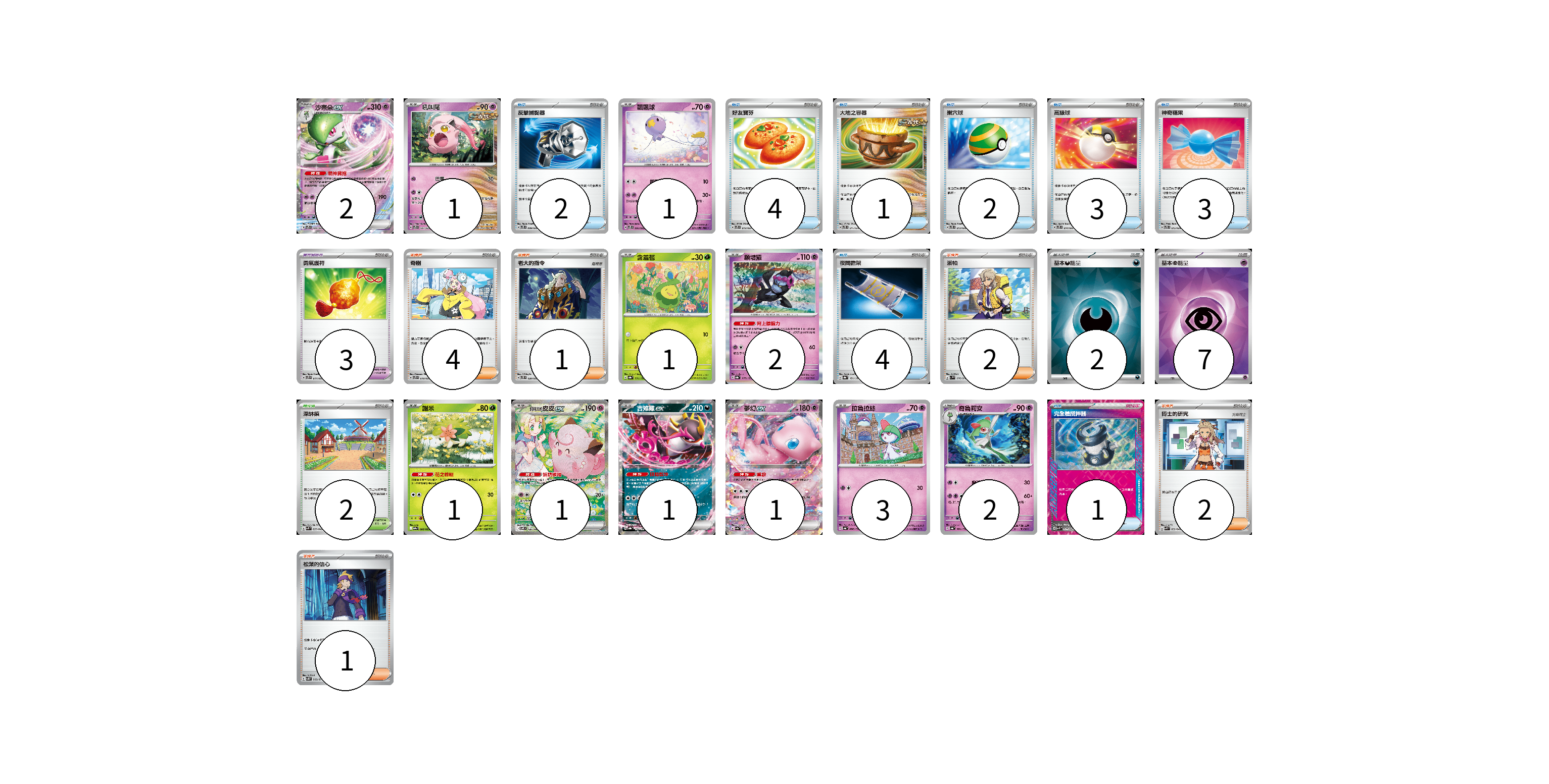 牌組構築方案 以此牌組為基礎新構築牌組 顯示卡面 顯示列表 寶可夢卡(16) 2 1 1 1 2 1 1 1 1 3 2 寶可夢道具(3) 3 物品卡(20) 2 4 1 2 3 3 4 1 支援者卡(10) 4 1 2 2 1 競技場卡(2) 2 能量卡(9) 2 7 寶可夢卡(16) 卡牌名稱 張數 卡牌名稱 張數 沙奈朵ex SVTS 004/022 02 吼叫尾 SVTS 007/022 01 飄飄球 SVTS 005/022 01 含羞苞 SV8a 001/187 01 願增猿 SV8a 075/187 02 謝米 SV9a 006/063 01 莉莉艾的皮皮ex SV9 126/100 01 吉雉雞ex SV8a 104/187 01 夢幻ex SV4a 076/190 01 拉魯拉絲 SV4a 080/190 03 奇魯莉安 SV4a 081/190 02 寶可夢道具(3) 卡牌名稱 張數 卡牌名稱 張數 勇氣護符 SVTS 017/022 03 物品卡(20) 卡牌名稱 張數 卡牌名稱 張數 反擊捕捉器 SVTS 009/022 02 好友寶芬 SVTS 012/022 04 大地之容器 SVTS 011/022 01 巢穴球 SVTS 013/022 02 高級球 SVTS 014/022 03 神奇糖果 SVTS 015/022 03 夜間擔架 SV8a 151/187 04 完全體攪拌器 SVK 017/042 01 支援者卡(10) 卡牌名稱 張數 卡牌名稱 張數 奇樹 SVTS 018/022 04 老大的指令 SVTS 020/022 01 派帕 SV1V 076/078 02 博士的研究 SVK 032/042 02 松葉的信心 SV5K 069/071 01 競技場卡(2) 卡牌名稱 張數 卡牌名稱 張數 深缽鎮 SVK 039/042 02 能量卡(9) 卡牌名稱 張數 卡牌名稱 張數 基本【惡】能量 SVK DAR 02 基本【超】能量 SVK PSY 07 以此牌組為基礎新構築牌組 牌組編碼 bWyYHo-VWlWNE-HQgoyK copy 列印牌組單 牌組編碼已複製 分享至SNS