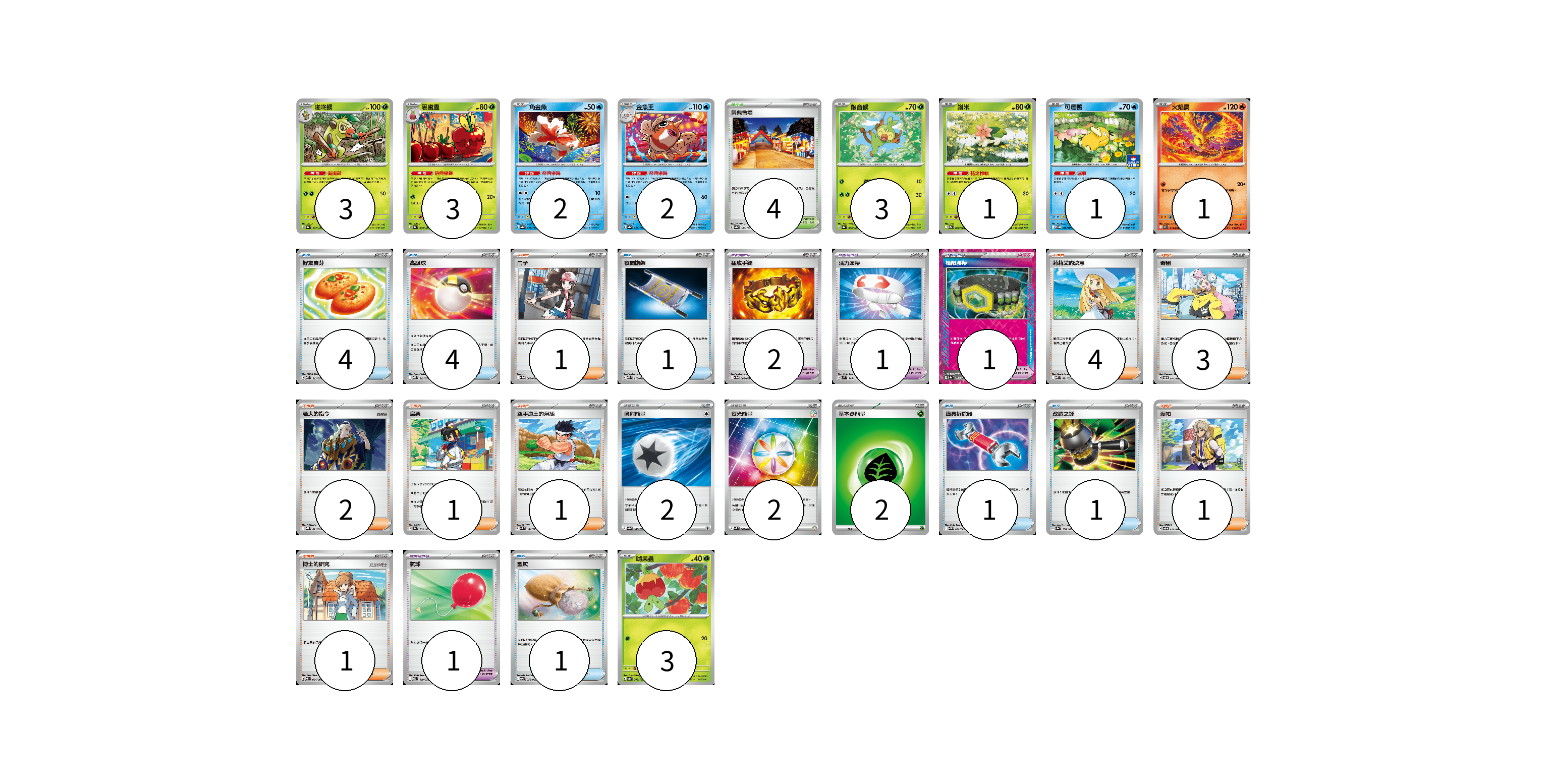 牌組構築方案 以此牌組為基礎新構築牌組 顯示卡面 顯示列表 寶可夢卡(19) 3 3 2 2 3 1 1 1 3 寶可夢道具(4) 2 1 1 物品卡(13) 4 4 1 1 1 1 1 支援者卡(14) 1 4 3 2 1 1 1 1 競技場卡(4) 4 能量卡(6) 2 2 2 寶可夢卡(19) 卡牌名稱 張數 卡牌名稱 張數 啪咚猴 SV8a 007/187 03 裹蜜蟲 SV8a 009/187 03 角金魚 SV8a 028/187 02 金魚王 SV8a 029/187 02 敲音猴 SV8a 006/187 03 謝米 SV9a 006/063 01 可達鴨 SV-P 220/SV-P 01 火焰鳥 M2 014/080 01 啃果蟲 SV8a 008/187 03 寶可夢道具(4) 卡牌名稱 張數 卡牌名稱 張數 猛攻手鐲 SV11W 082/086 02 活力頭帶 SVM 140/175 01 極限腰帶 SV8a 159/187 01 物品卡(13) 卡牌名稱 張數 卡牌名稱 張數 好友寶芬 MBD 013/022 04 高級球 MBG 012/022 04 夜間擔架 MBD 016/022 01 道具拆除器 SV11W 080/086 01 改造之錘 SV8a 138/187 01 氣球 MBD 018/022 01 聖灰 SV9a 056/063 01 支援者卡(14) 卡牌名稱 張數 卡牌名稱 張數 鬥子 SV11W 085/086 01 莉莉艾的決意 MBD 021/022 04 奇樹 SVOD 016/020 03 老大的指令 MBG 021/022 02 烏栗 SV8a 169/187 01 空手道王的演練 SVM 144/175 01 派帕 SVOD 018/020 01 博士的研究 SV11B 084/086 01 競技場卡(4) 卡牌名稱 張數 卡牌名稱 張數 祭典會場 SV8a 180/187 04 能量卡(6) 卡牌名稱 張數 卡牌名稱 張數 噴射能量 SV8a 185/187 02 夜光能量 SVK 042/042 02 基本草能量 sv-p GRA 02 以此牌組為基礎新構築牌組 牌組編碼 bXAqOs-flBClL-NzxYiX copy 列印牌組單 牌組編碼已複製 分享至SNS