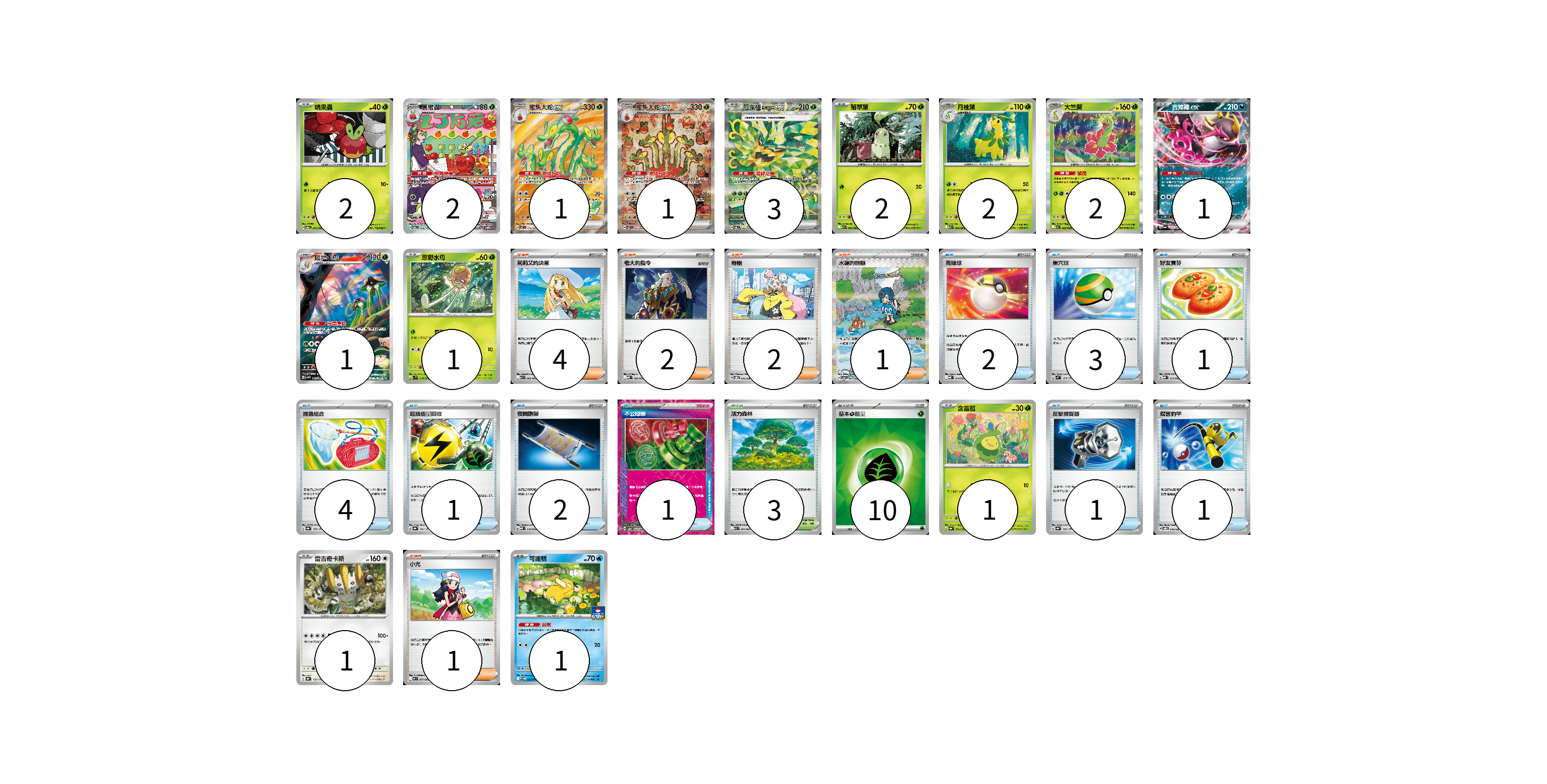 牌組構築方案 以此牌組為基礎新構築牌組 顯示卡面 顯示列表 寶可夢卡(21) 2 2 1 1 3 2 2 2 1 1 1 1 1 1 物品卡(16) 2 3 1 4 1 2 1 1 1 支援者卡(10) 4 2 2 1 1 競技場卡(3) 3 能量卡(10) 10 寶可夢卡(21) 卡牌名稱 張數 卡牌名稱 張數 啃果蟲 SV6 011/101 02 裹蜜蟲 SV6 103/101 02 蜜集大蛇ex SV7 115/102 01 蜜集大蛇ex SV7 127/102 01 厄鬼椪 碧草面具ex SV6 125/101 03 菊草葉 M1S 003/063 02 月桂葉 M1S 004/063 02 大竺葵 M1S 005/063 02 吉雉雞ex SV6a 038/064 01 陸地水母 SV4M 068/066 01 原野水母 SV1V 010/078 01 含羞苞 SV8a 001/187 01 雷吉奇卡斯 SV8a 132/187 01 可達鴨 SV-P 220/SV-P 01 物品卡(16) 卡牌名稱 張數 卡牌名稱 張數 高級球 MBD 014/022 02 巢穴球 SVM 133/175 03 好友寶芬 MBD 013/022 01 捕蟲組合 SV8a 150/187 04 超級能量回收 SV8a 141/187 01 夜間擔架 MBD 016/022 02 不公印章 SV5a 053/066 01 反擊捕捉器 SV8a 139/187 01 厲害釣竿 SVOD 010/020 01 支援者卡(10) 卡牌名稱 張數 卡牌名稱 張數 莉莉艾的決意 M1L 062/063 04 老大的指令 MBD 020/022 02 奇樹 SVOD 016/020 02 水蓮的照顧 SV5a 093/066 01 小光 M2 077/080 01 競技場卡(3) 卡牌名稱 張數 卡牌名稱 張數 活力森林 M1S 061/063 03 能量卡(10) 卡牌名稱 張數 卡牌名稱 張數 基本【草】能量 SVM GRA 10 以此牌組為基礎新構築牌組 牌組編碼 bYESro-EAdQGZ-jUzpdZ copy 列印牌組單 牌組編碼已複製 分享至SNS