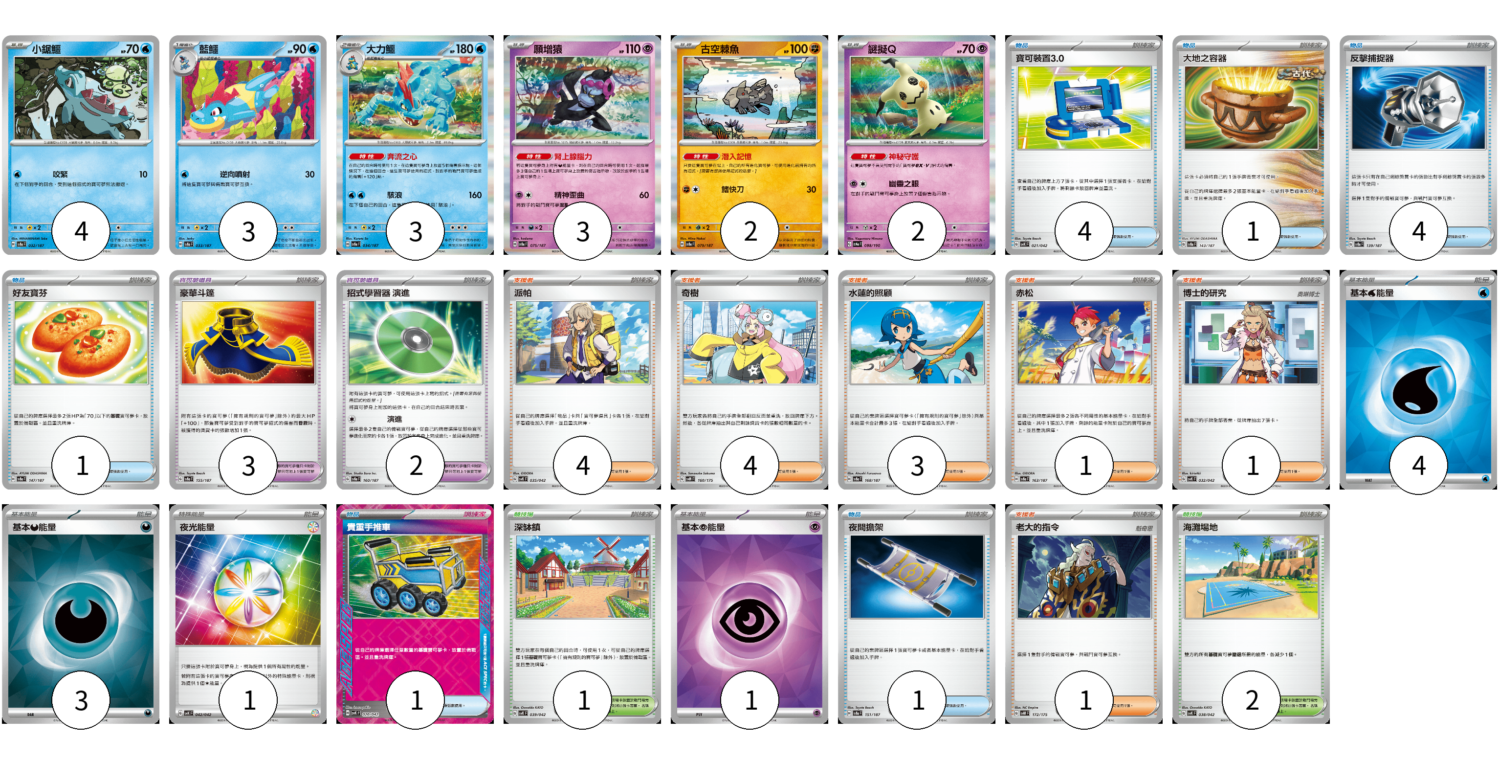 牌組構築方案 以此牌組為基礎新構築牌組 顯示卡面 顯示列表 寶可夢卡(17) 4 3 3 3 2 2 寶可夢道具(5) 3 2 物品卡(12) 4 1 4 1 1 1 支援者卡(14) 4 4 3 1 1 1 競技場卡(3) 1 2 能量卡(9) 4 3 1 1 寶可夢卡(17) 卡牌名稱 張數 卡牌名稱 張數 小鋸鱷 SV8a 032/187 04 藍鱷 SV8a 033/187 03 大力鱷 SV8a 034/187 03 願增猿 SV8a 075/187 03 古空棘魚 SV8a 079/187 02 謎擬Q SV4a 088/190 02 寶可夢道具(5) 卡牌名稱 張數 卡牌名稱 張數 豪華斗篷 SV8a 155/187 03 招式學習器 演進 SV8a 160/187 02 物品卡(12) 卡牌名稱 張數 卡牌名稱 張數 寶可裝置3.0 SVK 021/042 04 大地之容器 SV8a 143/187 01 反擊捕捉器 SV8a 139/187 04 好友寶芬 SV8a 147/187 01 貴重手推車 SVK 020/042 01 夜間擔架 SV8a 151/187 01 支援者卡(14) 卡牌名稱 張數 卡牌名稱 張數 派帕 SVK 035/042 04 奇樹 SVM 160/175 04 水蓮的照顧 SV8a 168/187 03 赤松 SV8a 163/187 01 博士的研究 SVK 032/042 01 老大的指令 SVM 172/175 01 競技場卡(3) 卡牌名稱 張數 卡牌名稱 張數 深缽鎮 SVK 039/042 01 海灘場地 SVK 038/042 02 能量卡(9) 卡牌名稱 張數 卡牌名稱 張數 基本【水】能量 SVK WAT 04 基本【惡】能量 SVK DAR 03 夜光能量 SVK 042/042 01 基本【超】能量 SVK PSY 01 以此牌組為基礎新構築牌組 牌組編碼 batlGs-WrJhEb-XFBiJq copy 列印牌組單 牌組編碼已複製 分享至SNS