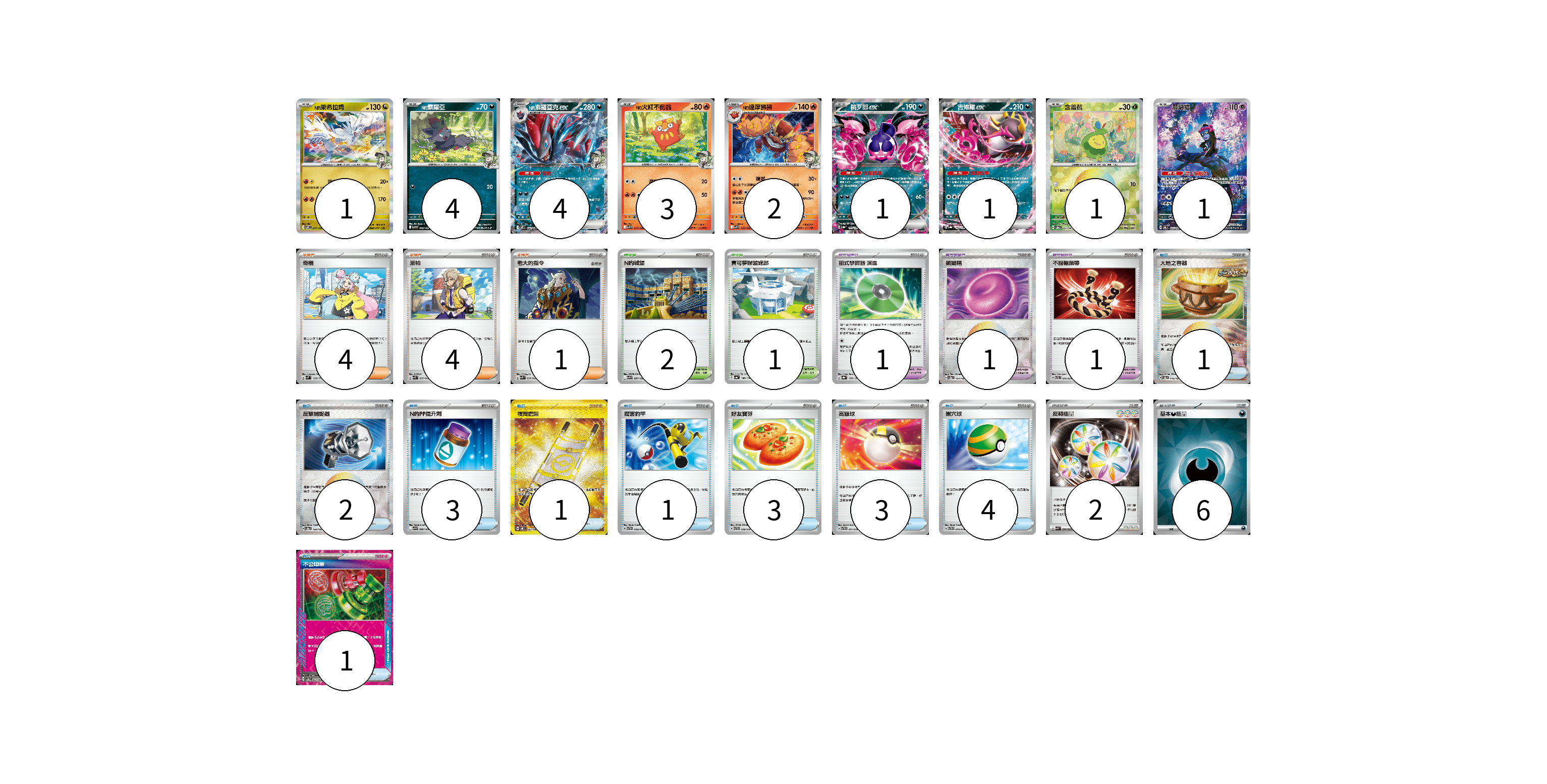 牌組構築方案 以此牌組為基礎新構築牌組 顯示卡面 顯示列表 寶可夢卡(18) 1 4 4 3 2 1 1 1 1 寶可夢道具(3) 1 1 1 物品卡(19) 1 2 3 1 1 3 3 4 1 支援者卡(9) 4 4 1 競技場卡(3) 2 1 能量卡(8) 2 6 寶可夢卡(18) 卡牌名稱 張數 卡牌名稱 張數 N的萊希拉姆 SV9 074/100 01 N的索羅亞 SV9 060/100 04 N的索羅亞克ex SV9 061/100 04 N的火紅不倒翁 SV9 015/100 03 N的達摩狒狒 SV9 016/100 02 桃歹郎ex SV8a 105/187 01 吉雉雞ex SV8a 104/187 01 含羞苞 SV8a 001/187 01 願增猿 SV6 107/101 01 寶可夢道具(3) 卡牌名稱 張數 卡牌名稱 張數 招式學習器 演進 SV8a 160/187 01 鎖鏈糬 SV8a 154/187 01 不服輸頭帶 SVTL 016/021 01 物品卡(19) 卡牌名稱 張數 卡牌名稱 張數 大地之容器 SV8a 143/187 01 反擊捕捉器 SV8a 139/187 02 N的PP提升劑 SV9 089/100 03 夜間擔架 SV8 137/106 01 厲害釣竿 SVTH 008/018 01 好友寶芬 SVTH 009/018 03 高級球 SVTH 011/018 03 巢穴球 SVTH 010/018 04 不公印章 SV5a 053/066 01 支援者卡(9) 卡牌名稱 張數 卡牌名稱 張數 奇樹 SVM 160/175 04 派帕 SVK 035/042 04 老大的指令 SVK 036/042 01 競技場卡(3) 卡牌名稱 張數 卡牌名稱 張數 N的城堡 SV9 097/100 02 寶可夢聯盟總部 SV4a 186/190 01 能量卡(8) 卡牌名稱 張數 卡牌名稱 張數 反轉能量 SVK 041/042 02 基本【惡】能量 SVM DAR 06 以此牌組為基礎新構築牌組 牌組編碼 bchmOe-YPNYYj-vEjmPF copy 列印牌組單 牌組編碼已複製 分享至SNS