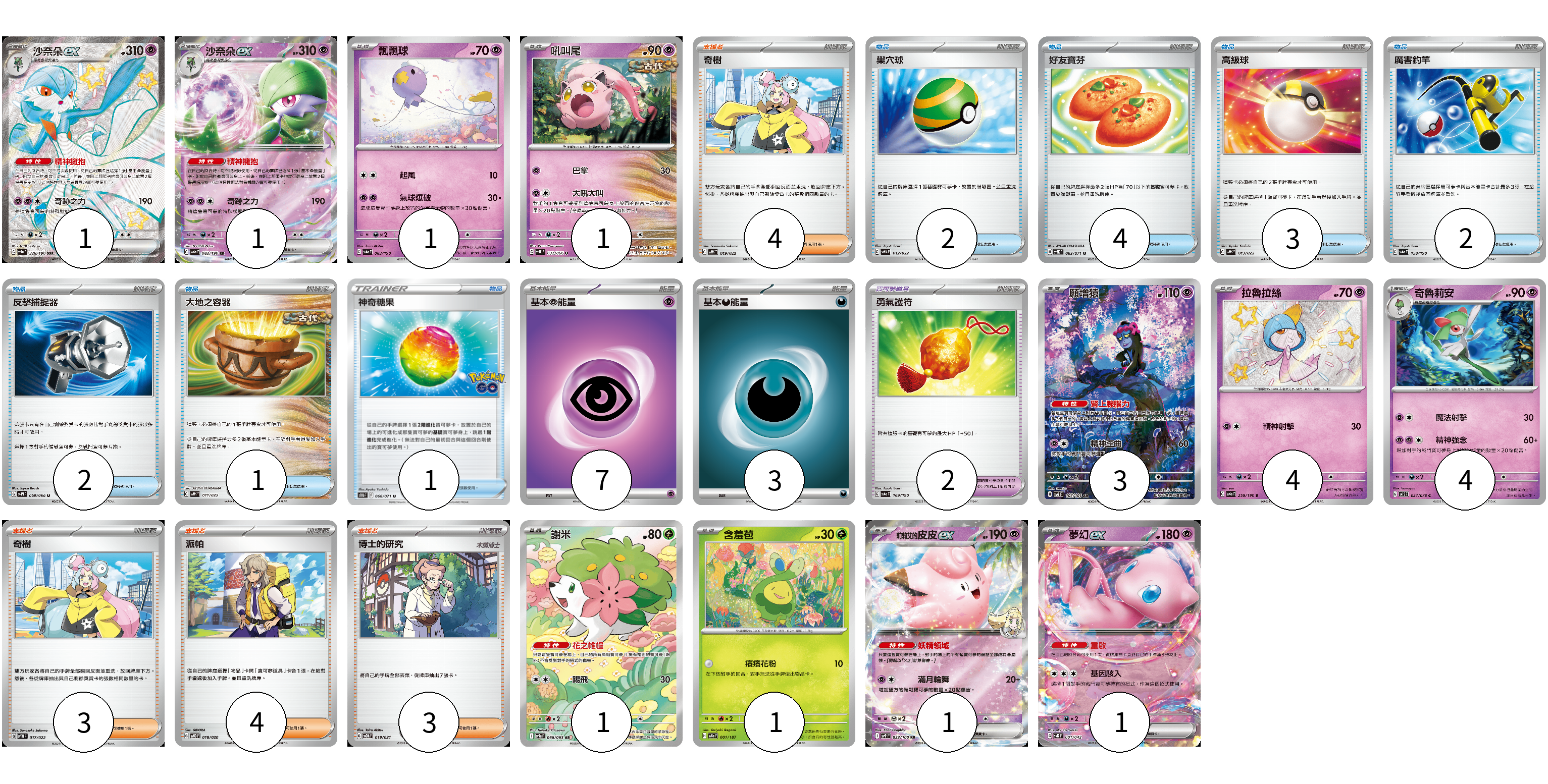 牌組構築方案 以此牌組為基礎新構築牌組 顯示卡面 顯示列表 寶可夢卡(19) 1 1 1 1 3 4 4 1 1 1 1 寶可夢道具(2) 2 物品卡(15) 2 4 3 2 2 1 1 支援者卡(14) 4 3 4 3 能量卡(10) 7 3 寶可夢卡(19) 卡牌名稱 張數 卡牌名稱 張數 沙奈朵ex SV4a 328/190 01 沙奈朵ex SV4a 082/190 01 飄飄球 SV4a 083/190 01 吼叫尾 SV4K 032/066 01 願增猿 SV6 107/101 03 拉魯拉絲 SV4a 258/190 04 奇魯莉安 SV1S 027/078 04 謝米 SV9a 066/063 01 含羞苞 SV8a 001/187 01 莉莉艾的皮皮ex SV9 033/100 01 夢幻ex SVK 001/042 01 寶可夢道具(2) 卡牌名稱 張數 卡牌名稱 張數 勇氣護符 SV4a 169/190 02 物品卡(15) 卡牌名稱 張數 卡牌名稱 張數 巢穴球 SVHM 012/022 02 好友寶芬 SV5K 063/071 04 高級球 SVHK 013/022 03 厲害釣竿 SV4a 158/190 02 反擊捕捉器 SV4M 059/066 02 大地之容器 SVHK 011/022 01 神奇糖果 S10b 066/071 01 支援者卡(14) 卡牌名稱 張數 卡牌名稱 張數 奇樹 SVHK 019/022 04 奇樹 SVTM 017/022 03 派帕 SVOD 018/020 04 博士的研究 SVOM 019/021 03 能量卡(10) 卡牌名稱 張數 卡牌名稱 張數 基本【超】能量 SVF PSY 07 基本【惡】能量 SVB DAR 03 以此牌組為基礎新構築牌組 牌組編碼 bdoUJb-rsiqoR-OYGSID copy 列印牌組單 牌組編碼已複製 分享至SNS