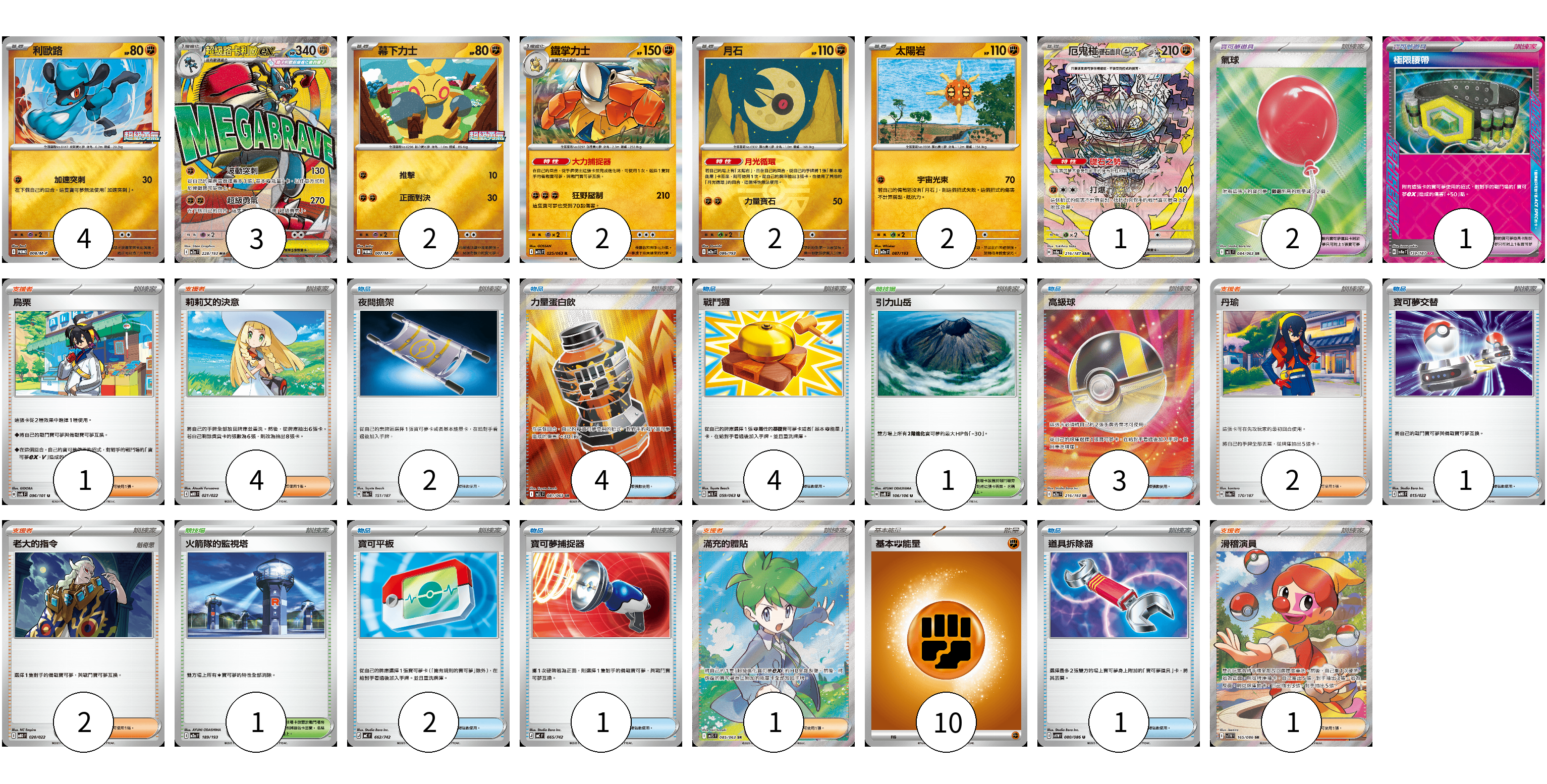 牌組構築方案 以此牌組為基礎新構築牌組 顯示卡面 顯示列表 寶可夢卡(16) 4 3 2 2 2 2 1 寶可夢道具(3) 2 1 物品卡(18) 2 4 4 3 1 2 1 1 支援者卡(11) 1 4 2 2 1 1 競技場卡(2) 1 1 能量卡(10) 10 寶可夢卡(16) 卡牌名稱 張數 卡牌名稱 張數 利歐路 M-P 008/M-P 04 超級路卡利歐ex M2a 228/193 03 幕下力士 M-P 007/M-P 02 鐵掌力士 M1L 025/063 02 月石 M2a 086/193 02 太陽岩 M2a 087/193 02 厄鬼椪 礎石面具ex SV8a 216/187 01 寶可夢道具(3) 卡牌名稱 張數 卡牌名稱 張數 氣球 M1L 084/063 02 極限腰帶 SV8a 159/187 01 物品卡(18) 卡牌名稱 張數 卡牌名稱 張數 夜間擔架 SV8a 151/187 02 力量蛋白飲 M1L 081/063 04 戰鬥鑼 M1L 059/063 04 高級球 M2a 216/193 03 寶可夢交替 MBG 015/022 01 寶可平板 MC 662/742 02 寶可夢捕捉器 MC 665/742 01 道具拆除器 SV11W 080/086 01 支援者卡(11) 卡牌名稱 張數 卡牌名稱 張數 烏栗 SV6 096/101 01 莉莉艾的決意 MBD 021/022 04 丹瑜 SV8a 170/187 02 老大的指令 MBD 020/022 02 滿充的體貼 M1S 085/063 01 滑稽演員 SV11W 165/086 01 競技場卡(2) 卡牌名稱 張數 卡牌名稱 張數 引力山岳 SV8 106/106 01 火箭隊的監視塔 M2a 189/193 01 能量卡(10) 卡牌名稱 張數 卡牌名稱 張數 基本【鬥】能量 MC FIG 10 以此牌組為基礎新構築牌組 牌組編碼 beefeW-ApQRlx-uYMERS copy 列印牌組單 牌組編碼已複製 分享至SNS