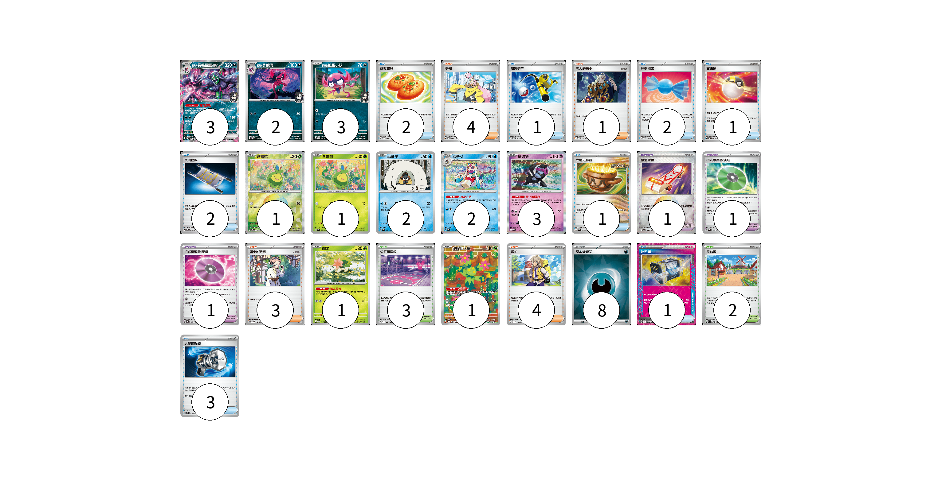 牌組構築方案 以此牌組為基礎新構築牌組 顯示卡面 顯示列表 寶可夢卡(19) 3 2 3 1 1 2 2 3 1 1 寶可夢道具(3) 1 1 1 物品卡(13) 2 1 2 1 2 1 1 3 支援者卡(12) 4 1 3 4 競技場卡(5) 3 2 能量卡(8) 8 寶可夢卡(19) 卡牌名稱 張數 卡牌名稱 張數 <瑪俐的>長毛巨魔ex SVOM 007/021 03 <瑪俐的>詐唬魔 SVOM 006/021 02 <瑪俐的>搗蛋小妖 SVOM 005/021 03 含羞苞 SV8a 001/187 01 含羞苞 SV8a 001/187 01 雪童子 SV8a 037/187 02 雪妖女 SV8a 038/187 02 願增猿 SV8a 075/187 03 謝米 SV9a 006/063 01 沙鈴仙人掌 SV9 101/100 01 寶可夢道具(3) 卡牌名稱 張數 卡牌名稱 張數 緊急滑板 SV8a 153/187 01 招式學習器 演進 SV8a 160/187 01 招式學習器 衰退 SV8a 161/187 01 物品卡(13) 卡牌名稱 張數 卡牌名稱 張數 好友寶芬 SVOM 012/021 02 厲害釣竿 SVOM 011/021 01 神奇糖果 SVOM 014/021 02 高級球 SVOM 013/021 01 夜間擔架 SVOM 016/021 02 大地之容器 SV8a 143/187 01 秘密箱 SV6 092/101 01 反擊捕捉器 SVTS 009/022 03 支援者卡(12) 卡牌名稱 張數 卡牌名稱 張數 奇樹 SVOM 018/021 04 老大的指令 SVOM 020/021 01 博士的研究 SVOM 019/021 03 派帕 SVOD 018/020 04 競技場卡(5) 卡牌名稱 張數 卡牌名稱 張數 尖釘鎮道館 SVOM 021/021 03 深缽鎮 SV1a 070/073 02 能量卡(8) 卡牌名稱 張數 卡牌名稱 張數 基本【惡】能量 SVOM DAR 08 以此牌組為基礎新構築牌組 牌組編碼 bhwFkv-juvPnk-zRmWFK copy 列印牌組單 牌組編碼已複製 分享至SNS