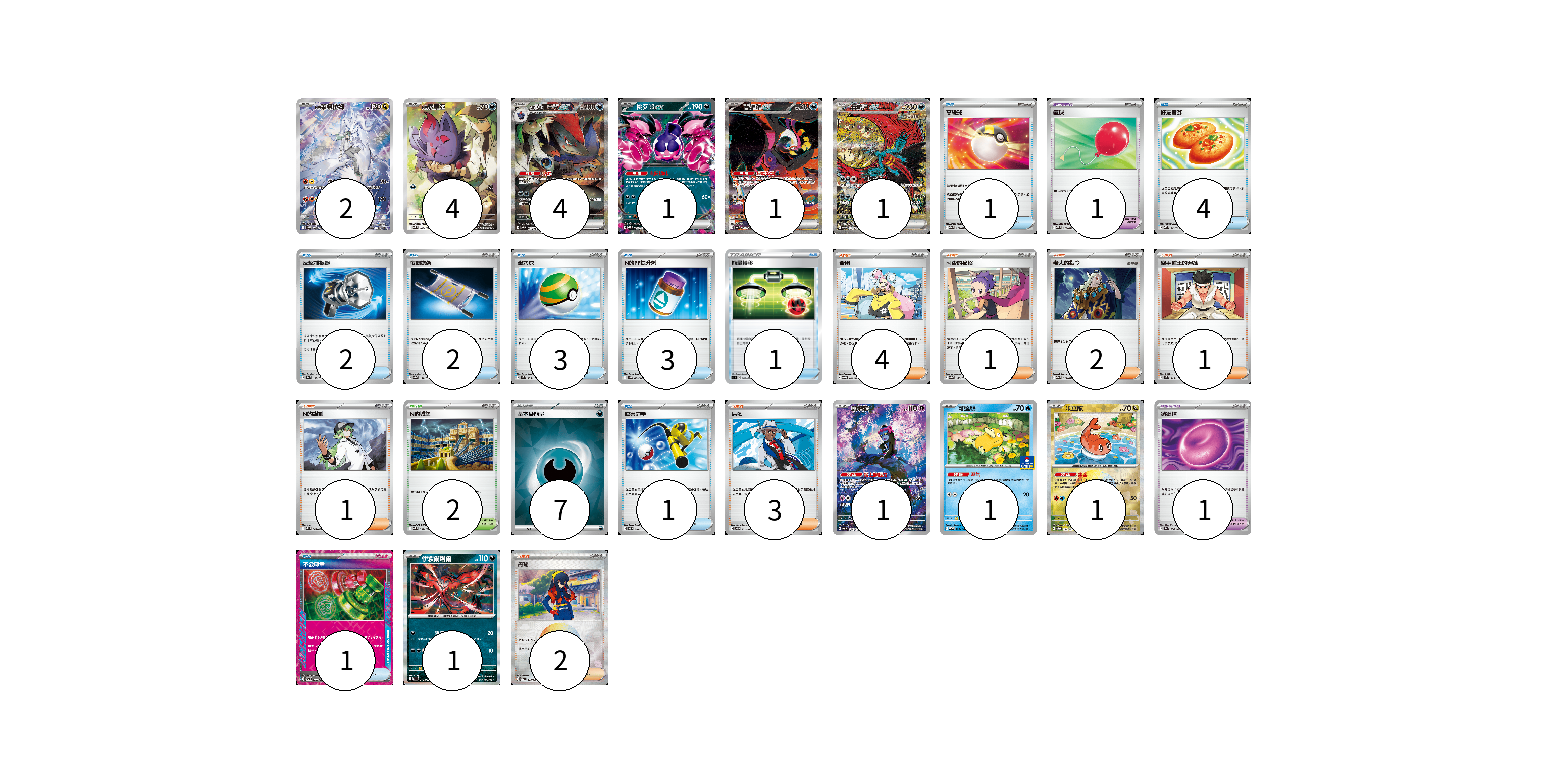 牌組構築方案 以此牌組為基礎新構築牌組 顯示卡面 顯示列表 寶可夢卡(17) 2 4 4 1 1 1 1 1 1 1 寶可夢道具(1) 1 物品卡(19) 1 1 4 2 2 3 3 1 1 1 支援者卡(14) 4 1 2 1 1 3 2 競技場卡(2) 2 能量卡(7) 7 寶可夢卡(17) 卡牌名稱 張數 卡牌名稱 張數 N的萊希拉姆 SV9 109/100 02 N的索羅亞 SV9 108/100 04 N的索羅亞克ex SV9 127/100 04 桃歹郎ex MBG 009/022 01 吉雉雞ex SV6a 089/064 01 轟鳴月ex SV8a 218/187 01 願增猿 SV6 107/101 01 可達鴨 SV-P 220/SV-P 01 米立龍 SV8a 121/187 01 伊裴爾塔爾 M1L 040/063 01 寶可夢道具(1) 卡牌名稱 張數 卡牌名稱 張數 鎖鏈糬 SV8a 154/187 01 物品卡(19) 卡牌名稱 張數 卡牌名稱 張數 高級球 MBG 012/022 01 氣球 MBD 018/022 01 好友寶芬 MBD 013/022 04 反擊捕捉器 SV8a 139/187 02 夜間擔架 SV8a 151/187 02 巢穴球 SVM 133/175 03 N的PP提升劑 SV9 089/100 03 能量轉移 SI 366/414 01 厲害釣竿 SVOD 010/020 01 不公印章 SV5a 053/066 01 支援者卡(14) 卡牌名稱 張數 卡牌名稱 張數 奇樹 SVOM 018/021 04 阿杏的秘招 SV8a 166/187 01 老大的指令 MBG 021/022 02 空手道王的演練 SVM 143/175 01 N的謀劃 SV11B 083/086 01 席藍 SV8 102/106 03 丹瑜 SV8a 170/187 02 競技場卡(2) 卡牌名稱 張數 卡牌名稱 張數 N的城堡 SV9 097/100 02 能量卡(7) 卡牌名稱 張數 卡牌名稱 張數 基本【惡】能量 SVOM DAR 07 以此牌組為基礎新構築牌組 牌組編碼 bjoBAk-FkKXIy-GLeMfO copy 列印牌組單 牌組編碼已複製 分享至SNS