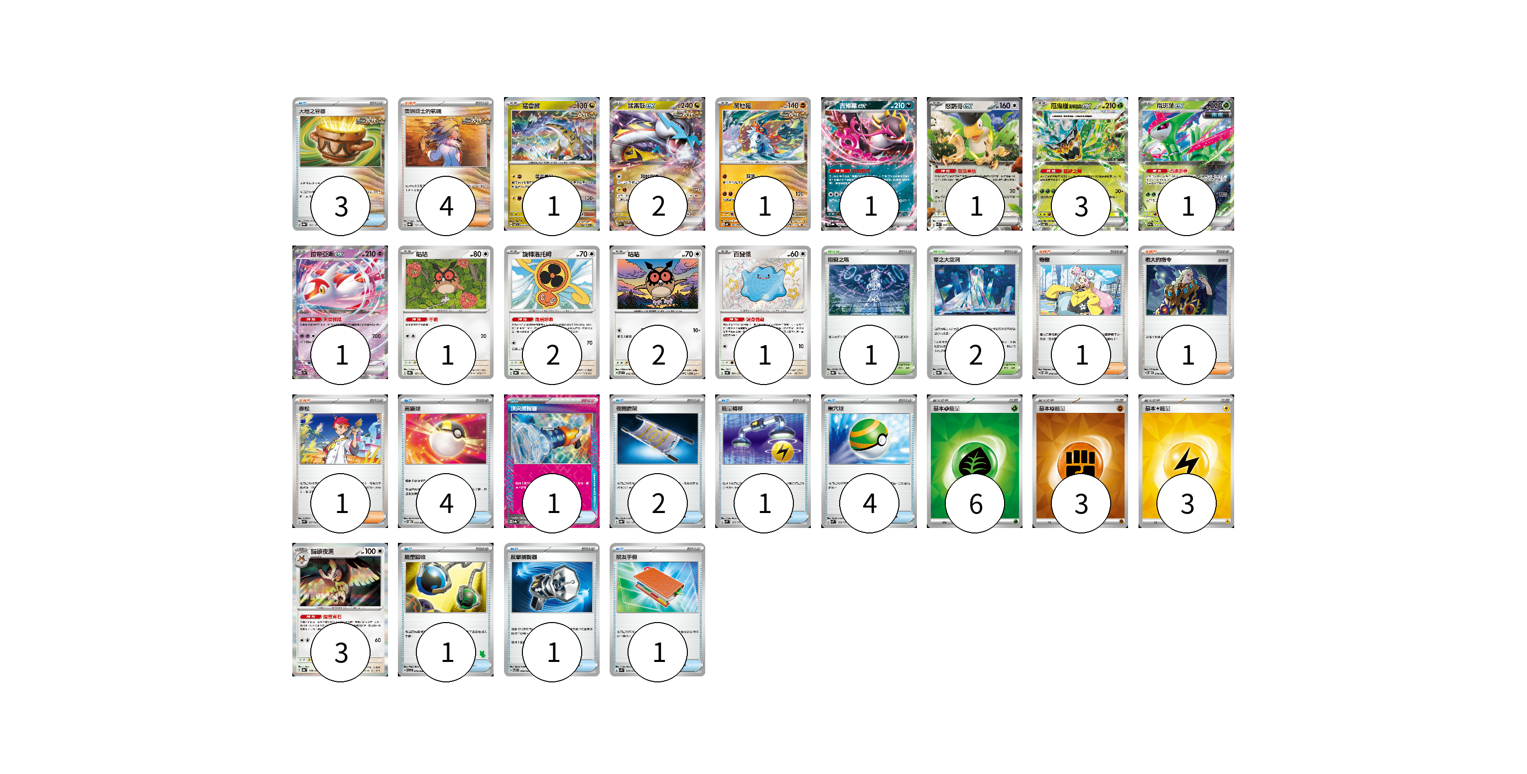 牌組構築方案 以此牌組為基礎新構築牌組 顯示卡面 顯示列表 寶可夢卡(20) 1 2 1 1 1 3 1 1 1 2 2 1 3 物品卡(18) 3 4 1 2 1 4 1 1 1 支援者卡(7) 4 1 1 1 競技場卡(3) 1 2 能量卡(12) 6 3 3 寶可夢卡(20) 卡牌名稱 張數 卡牌名稱 張數 猛雷鼓 SV7 075/102 01 猛雷鼓ex SV5K 053/071 02 爬地翅 SV4K 041/066 01 吉雉雞ex SV8a 104/187 01 怒鸚哥ex SVK 006/042 01 厄鬼椪 碧草面具ex SV6 016/101 03 鐵斑葉ex SV5M 016/071 01 拉帝亞斯ex SV7a 019/064 01 咕咕 SV8a 127/187 01 旋轉洛托姆 SV8a 131/187 02 咕咕 SV7 076/102 02 百變怪 SV4a 309/190 01 貓頭夜鷹 SV8a 128/187 03 物品卡(18) 卡牌名稱 張數 卡牌名稱 張數 大地之容器 SV8a 143/187 03 高級球 SVOD 012/020 04 頂尖捕捉器 SV8a 148/187 01 夜間擔架 SV8a 151/187 02 能量轉移 SVM 127/175 01 巢穴球 SVM 133/175 04 能量回收 SVI 049/066 01 反擊捕捉器 SVTS 009/022 01 朋友手冊 SV1S 069/078 01 支援者卡(7) 卡牌名稱 張數 卡牌名稱 張數 奧琳博士的氣魄 SV8a 167/187 04 奇樹 SVOM 018/021 01 老大的指令 SVOD 019/020 01 赤松 SVK 027/042 01 競技場卡(3) 卡牌名稱 張數 卡牌名稱 張數 阻礙之塔 SV8a 181/187 01 零之大空洞 SV8a 182/187 02 能量卡(12) 卡牌名稱 張數 卡牌名稱 張數 基本【草】能量 SVM GRA 06 基本【鬥】能量 SVM FIG 03 基本【雷】能量 SVM LIG 03 以此牌組為基礎新構築牌組 牌組編碼 bmaDmp-SYcTap-rJaxqQ copy 列印牌組單 牌組編碼已複製 分享至SNS