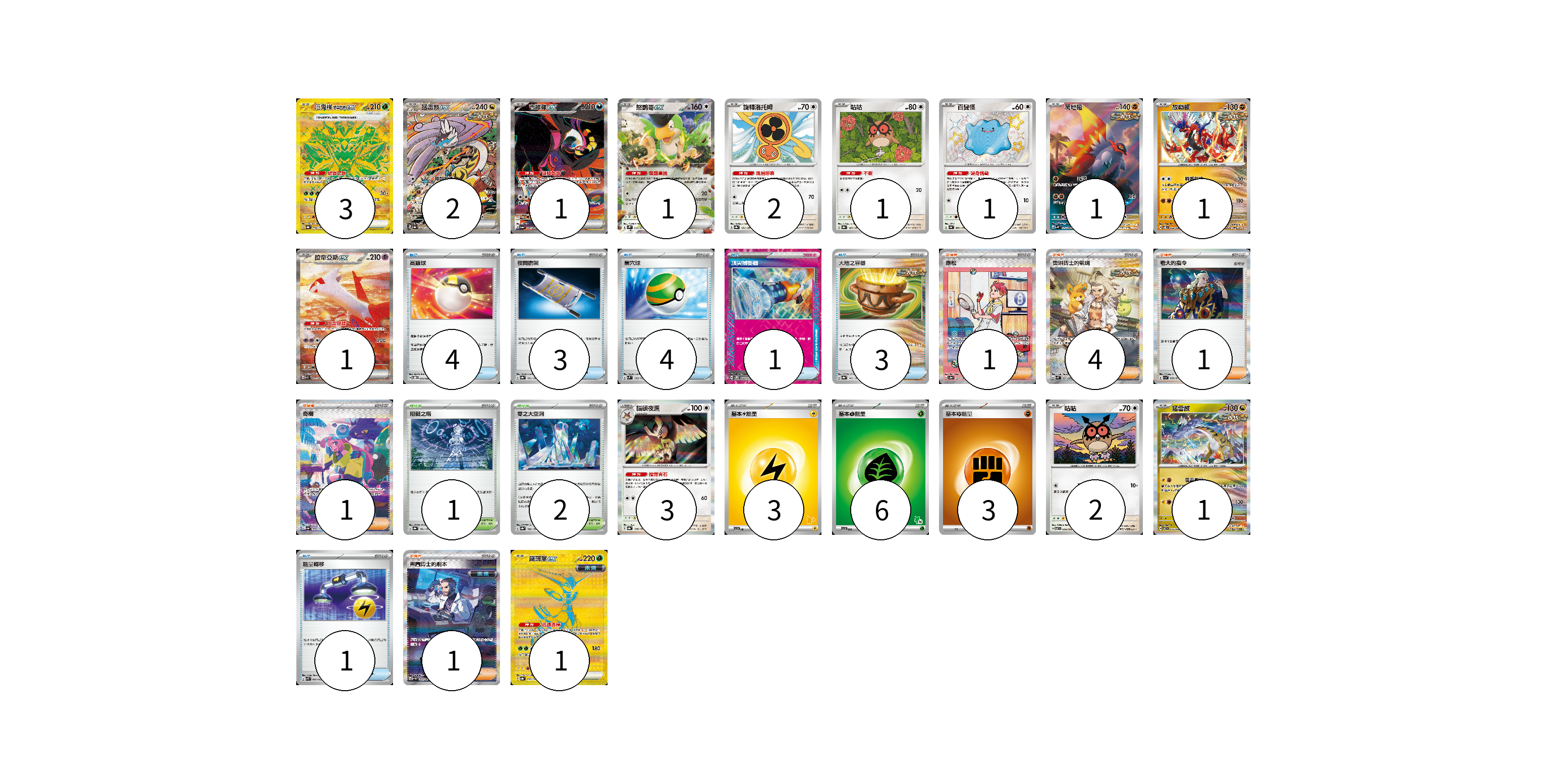 牌組構築方案 以此牌組為基礎新構築牌組 顯示卡面 顯示列表 寶可夢卡(21) 3 2 1 1 2 1 1 1 1 1 3 2 1 1 物品卡(16) 4 3 4 1 3 1 支援者卡(8) 1 4 1 1 1 競技場卡(3) 1 2 能量卡(12) 3 6 3 寶可夢卡(21) 卡牌名稱 張數 卡牌名稱 張數 厄鬼椪 碧草面具ex SV8a 234/187 03 猛雷鼓ex SV8a 222/187 02 吉雉雞ex SV6a 089/064 01 怒鸚哥ex SV2P 065/071 01 旋轉洛托姆 SV8a 131/187 02 咕咕 SV8a 127/187 01 百變怪 SV4a 309/190 01 爬地翅 SV4K 074/066 01 故勒頓 SV8 069/106 01 拉帝亞斯ex SV7a 087/064 01 貓頭夜鷹 SV8a 128/187 03 咕咕 SV7 076/102 02 猛雷鼓 SV7 075/102 01 鐵斑葉ex SV8a 233/187 01 物品卡(16) 卡牌名稱 張數 卡牌名稱 張數 高級球 SVOD 012/020 04 夜間擔架 SV8a 151/187 03 巢穴球 SVM 133/175 04 頂尖捕捉器 SV5M 062/071 01 大地之容器 SV8a 143/187 03 能量轉移 SVK 008/042 01 支援者卡(8) 卡牌名稱 張數 卡牌名稱 張數 赤松 SV8a 227/187 01 奧琳博士的氣魄 SV4K 091/066 04 老大的指令 SV1a 069/073 01 奇樹 SV4a 350/190 01 弗圖博士的劇本 SV4M 091/066 01 競技場卡(3) 卡牌名稱 張數 卡牌名稱 張數 阻礙之塔 SV8a 181/187 01 零之大空洞 SV8a 182/187 02 能量卡(12) 卡牌名稱 張數 卡牌名稱 張數 基本【雷】能量 SVI LIG 03 基本【草】能量 SVI GRA 06 基本【鬥】能量 SVTG FIG 03 以此牌組為基礎新構築牌組 牌組編碼 btuODf-KSpkEE-OZqUZs copy 列印牌組單 牌組編碼已複製 分享至SNS