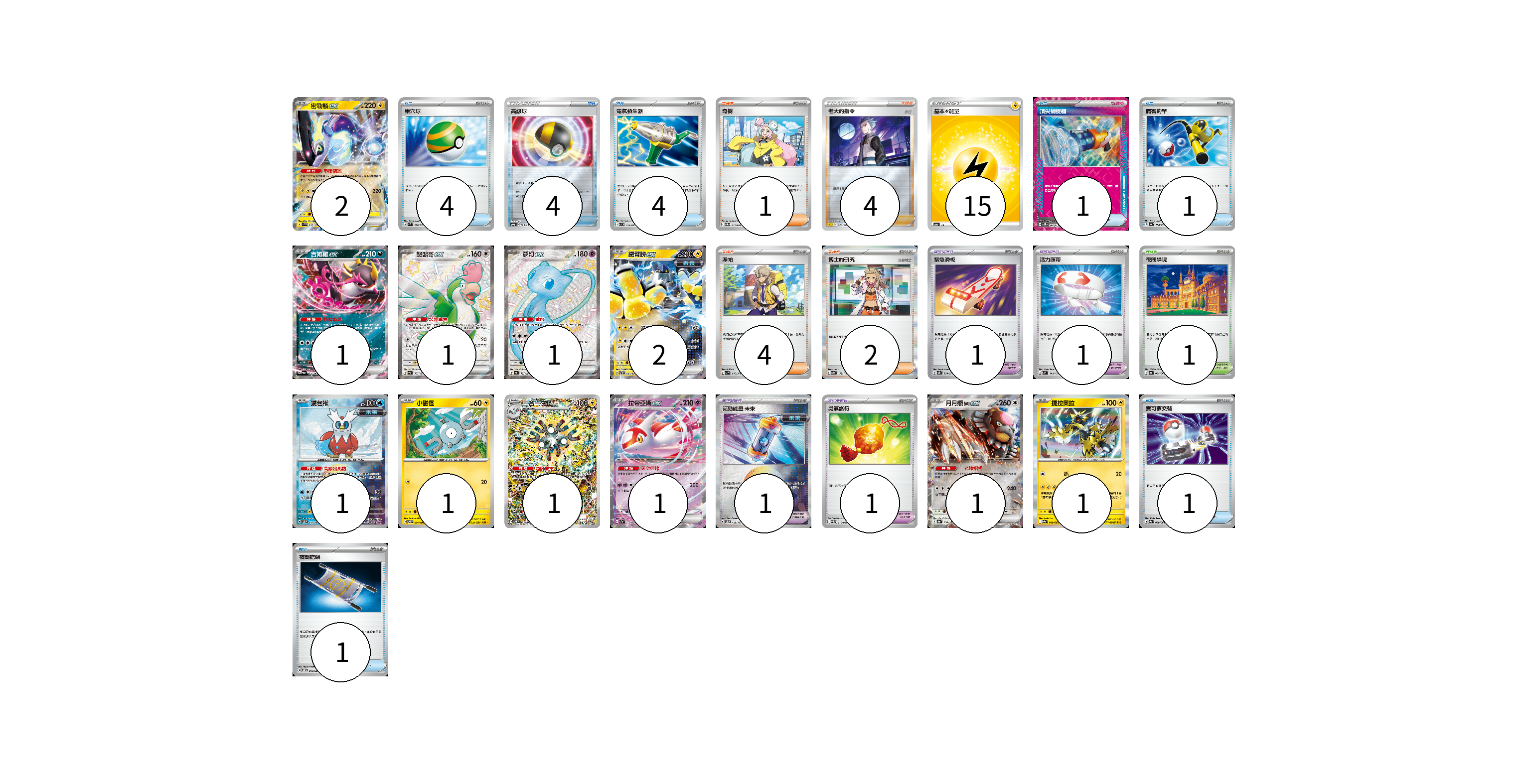 牌組構築方案 以此牌組為基礎新構築牌組 顯示卡面 顯示列表 寶可夢卡(13) 2 1 1 1 2 1 1 1 1 1 1 寶可夢道具(4) 1 1 1 1 物品卡(16) 4 4 4 1 1 1 1 支援者卡(11) 1 4 4 2 競技場卡(1) 1 能量卡(15) 15 寶可夢卡(13) 卡牌名稱 張數 卡牌名稱 張數 密勒頓ex SV1V 037/078 02 吉雉雞ex SV6a 038/064 01 怒鸚哥ex SV4a 337/190 01 夢幻ex SV4a 327/190 01 鐵臂膀ex SVTR 007/021 02 鐵包袱 SV8a 047/187 01 小磁怪 SV8 034/106 01 三合一磁怪 SV8 112/106 01 拉帝亞斯ex SV7a 019/064 01 月月熊 赫月ex SV8a 134/187 01 捷拉奧拉 SV9a 040/063 01 寶可夢道具(4) 卡牌名稱 張數 卡牌名稱 張數 緊急滑板 SV5K 064/071 01 活力頭帶 SVM 140/175 01 驅勁能量 未來 SV8a 158/187 01 勇氣護符 SVEM 016/020 01 物品卡(16) 卡牌名稱 張數 卡牌名稱 張數 巢穴球 SV1S 070/078 04 高級球 SO 020/030 04 電氣發生器 SVC 012/021 04 頂尖捕捉器 SV5M 062/071 01 厲害釣竿 SV4a 158/190 01 寶可夢交替 SV9a 058/063 01 夜間擔架 SVOM 016/021 01 支援者卡(11) 卡牌名稱 張數 卡牌名稱 張數 奇樹 SVEM 017/020 01 老大的指令(赤日) SPZ 020/020 04 派帕 SV1V 076/078 04 博士的研究 SV4a 176/190 02 競技場卡(1) 卡牌名稱 張數 卡牌名稱 張數 夜間學院 SV6a 064/064 01 能量卡(15) 卡牌名稱 張數 卡牌名稱 張數 基本雷能量 SN LIG 15 以此牌組為基礎新構築牌組 牌組編碼 burRwQ-eQSDwh-VYSmyp copy 列印牌組單 牌組編碼已複製 分享至SNS