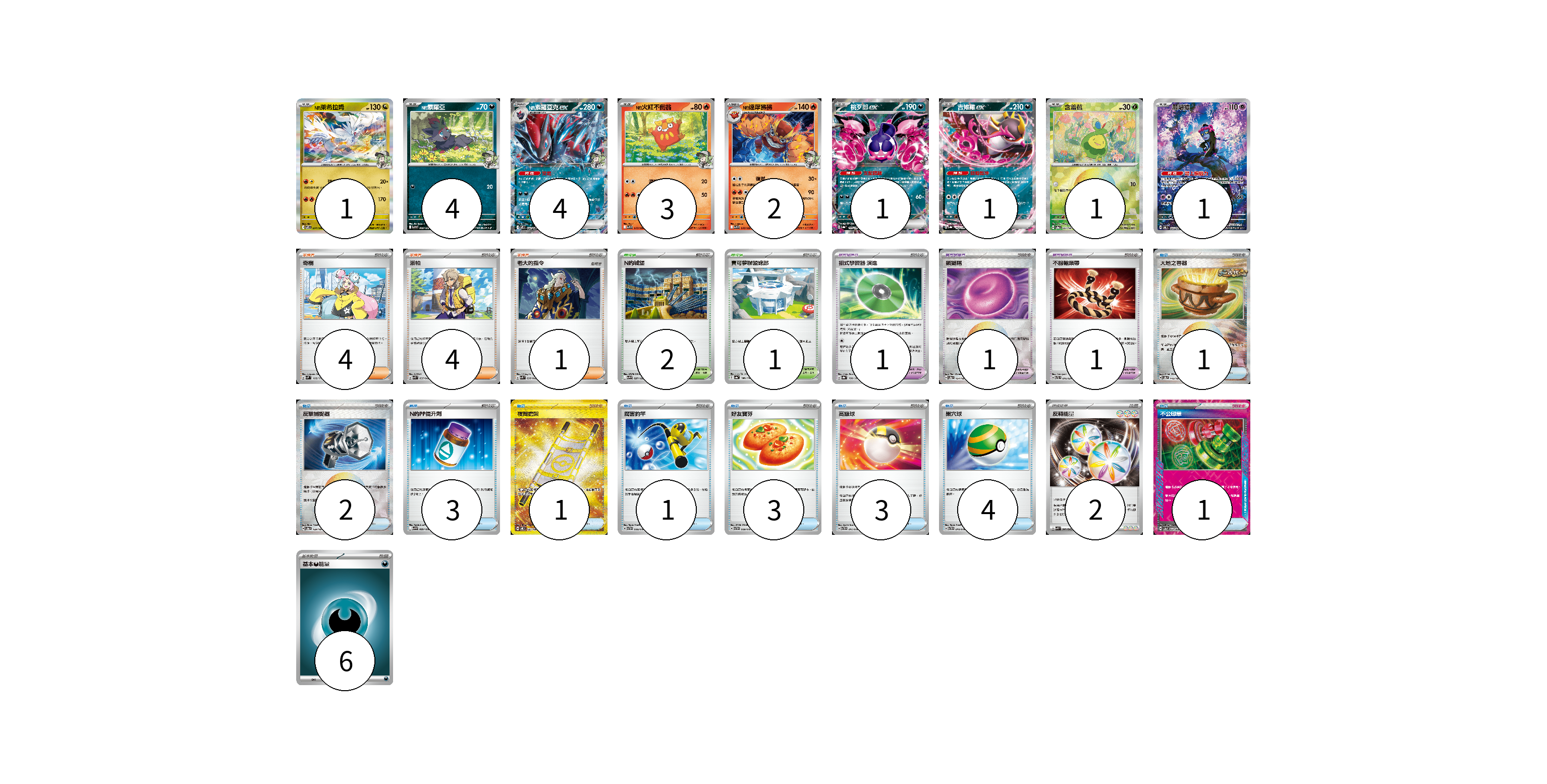 牌組構築方案 以此牌組為基礎新構築牌組 顯示卡面 顯示列表 寶可夢卡(18) 1 4 4 3 2 1 1 1 1 寶可夢道具(3) 1 1 1 物品卡(19) 1 2 3 1 1 3 3 4 1 支援者卡(9) 4 4 1 競技場卡(3) 2 1 能量卡(8) 2 6 寶可夢卡(18) 卡牌名稱 張數 卡牌名稱 張數 N的萊希拉姆 SV9 074/100 01 N的索羅亞 SV9 060/100 04 N的索羅亞克ex SV9 061/100 04 N的火紅不倒翁 SV9 015/100 03 N的達摩狒狒 SV9 016/100 02 桃歹郎ex SV8a 105/187 01 吉雉雞ex SV8a 104/187 01 含羞苞 SV8a 001/187 01 願增猿 SV6 107/101 01 寶可夢道具(3) 卡牌名稱 張數 卡牌名稱 張數 招式學習器 演進 SV8a 160/187 01 鎖鏈糬 SV8a 154/187 01 不服輸頭帶 SVTL 016/021 01 物品卡(19) 卡牌名稱 張數 卡牌名稱 張數 大地之容器 SV8a 143/187 01 反擊捕捉器 SV8a 139/187 02 N的PP提升劑 SV9 089/100 03 夜間擔架 SV8 137/106 01 厲害釣竿 SVTH 008/018 01 好友寶芬 SVTH 009/018 03 高級球 SVTH 011/018 03 巢穴球 SVTH 010/018 04 不公印章 SV5a 053/066 01 支援者卡(9) 卡牌名稱 張數 卡牌名稱 張數 奇樹 SVM 160/175 04 派帕 SVK 035/042 04 老大的指令 SVK 036/042 01 競技場卡(3) 卡牌名稱 張數 卡牌名稱 張數 N的城堡 SV9 097/100 02 寶可夢聯盟總部 SV4a 186/190 01 能量卡(8) 卡牌名稱 張數 卡牌名稱 張數 反轉能量 SVK 041/042 02 基本【惡】能量 SVF DAR 06 以此牌組為基礎新構築牌組 牌組編碼 buvTKq-JmSWYK-ZyXCDJ copy 列印牌組單 牌組編碼已複製 分享至SNS