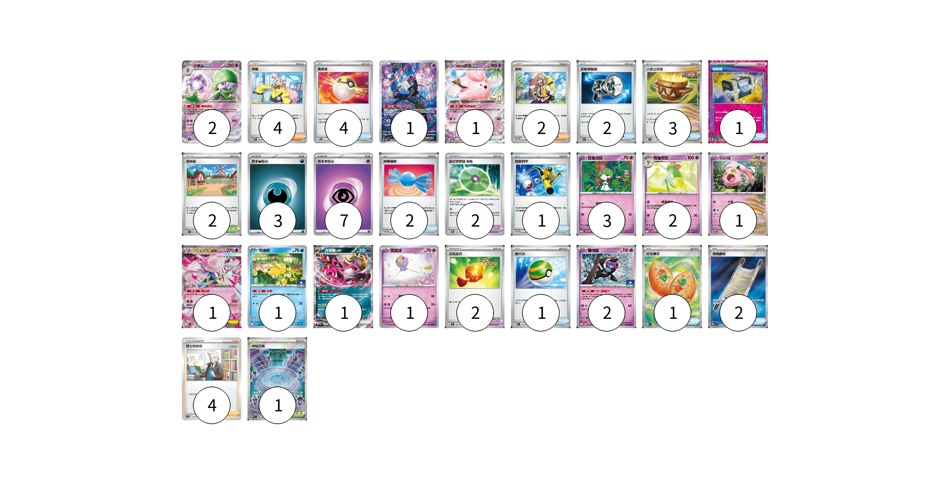 牌組構築方案 以此牌組為基礎新構築牌組 顯示卡面 顯示列表 寶可夢卡(16) 2 1 1 3 2 1 1 1 1 1 2 寶可夢道具(4) 2 2 物品卡(17) 4 2 3 1 2 1 1 1 2 支援者卡(10) 4 2 4 競技場卡(3) 2 1 能量卡(10) 3 7 寶可夢卡(16) 卡牌名稱 張數 卡牌名稱 張數 沙奈朵ex SV1S 028/078 02 願增猿 SV6 107/101 01 莉莉艾的皮皮ex SV9 033/100 01 拉魯拉絲 M1S 040/063 03 奇魯莉安 M1S 041/063 02 吼叫尾 SVTS 007/022 01 超級蒂安希ex MBD 006/022 01 可達鴨 SV-P 220/SV-P 01 吉雉雞ex SV8a 104/187 01 飄飄球 SVTS 005/022 01 願增猿 M-P 014/M-P 02 寶可夢道具(4) 卡牌名稱 張數 卡牌名稱 張數 招式學習器 演進 SV8a 160/187 02 勇氣護符 SVM 142/175 02 物品卡(17) 卡牌名稱 張數 卡牌名稱 張數 高級球 SVC 014/021 04 反擊捕捉器 SVK 009/042 02 大地之容器 SVK 012/042 03 秘密箱 SV6 092/101 01 神奇糖果 SVOM 014/021 02 厲害釣竿 SVOD 010/020 01 巢穴球 SVM 133/175 01 好友寶芬 M1S 081/063 01 夜間擔架 M1L 083/063 02 支援者卡(10) 卡牌名稱 張數 卡牌名稱 張數 奇樹 SV2D 069/071 04 派帕 SVOD 018/020 02 博士的研究(山梨博士) SK 024/030 04 競技場卡(3) 卡牌名稱 張數 卡牌名稱 張數 深缽鎮 SVK 039/042 02 神秘花園 M1S 086/063 01 能量卡(10) 卡牌名稱 張數 卡牌名稱 張數 基本【惡】能量 SVD DAR 03 基本【超】能量 SVF PSY 07 以此牌組為基礎新構築牌組 牌組編碼 bzWMAr-JRfrpy-VBQWTr copy 列印牌組單 牌組編碼已複製 分享至SNS