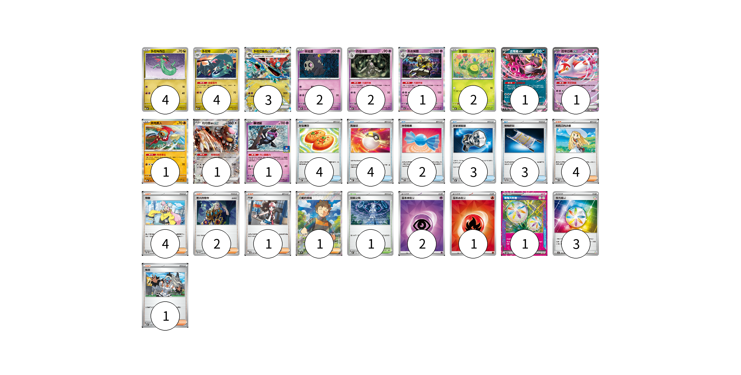 牌組構築方案 以此牌組為基礎新構築牌組 顯示卡面 顯示列表 寶可夢卡(23) 4 4 3 2 2 1 2 1 1 1 1 1 物品卡(16) 4 4 2 3 3 支援者卡(13) 4 4 2 1 1 1 競技場卡(1) 1 能量卡(7) 2 1 1 3 寶可夢卡(23) 卡牌名稱 張數 卡牌名稱 張數 多龍梅西亞 SV8a 118/187 04 多龍奇 SV8a 119/187 04 多龍巴魯托ex SV8a 120/187 03 夜巡靈 SV8a 064/187 02 彷徨夜靈 SV8a 065/187 02 黑夜魔靈 SV8a 066/187 01 含羞苞 SV8a 001/187 02 吉雉雞ex SVOD 004/020 01 拉帝亞斯ex MBD 003/022 01 摔角鷹人 SV8a 084/187 01 月月熊 赫月ex SV8a 134/187 01 願增猿 M-P 014/M-P 01 物品卡(16) 卡牌名稱 張數 卡牌名稱 張數 好友寶芬 MBD 013/022 04 高級球 MBD 014/022 04 神奇糖果 MBG 013/022 02 反擊捕捉器 SV8a 139/187 03 夜間擔架 SVOM 016/021 03 支援者卡(13) 卡牌名稱 張數 卡牌名稱 張數 莉莉艾的決意 MBG 022/022 04 奇樹 SVOD 016/020 04 老大的指令 SVOD 019/020 02 鬥子 SV11W 085/086 01 小剛的發掘 SV9 123/100 01 枇琶 SV5K 068/071 01 競技場卡(1) 卡牌名稱 張數 卡牌名稱 張數 阻礙之塔 SV8a 181/187 01 能量卡(7) 卡牌名稱 張數 卡牌名稱 張數 基本【超】能量 SVOD PSY 02 基本【火】能量 SVQL FIR 01 新衝天能量 SV5K 071/071 01 夜光能量 SV4a 190/190 03 以此牌組為基礎新構築牌組 牌組編碼 cBlwCN-tPYfxR-GOVQCB copy 列印牌組單 牌組編碼已複製 分享至SNS