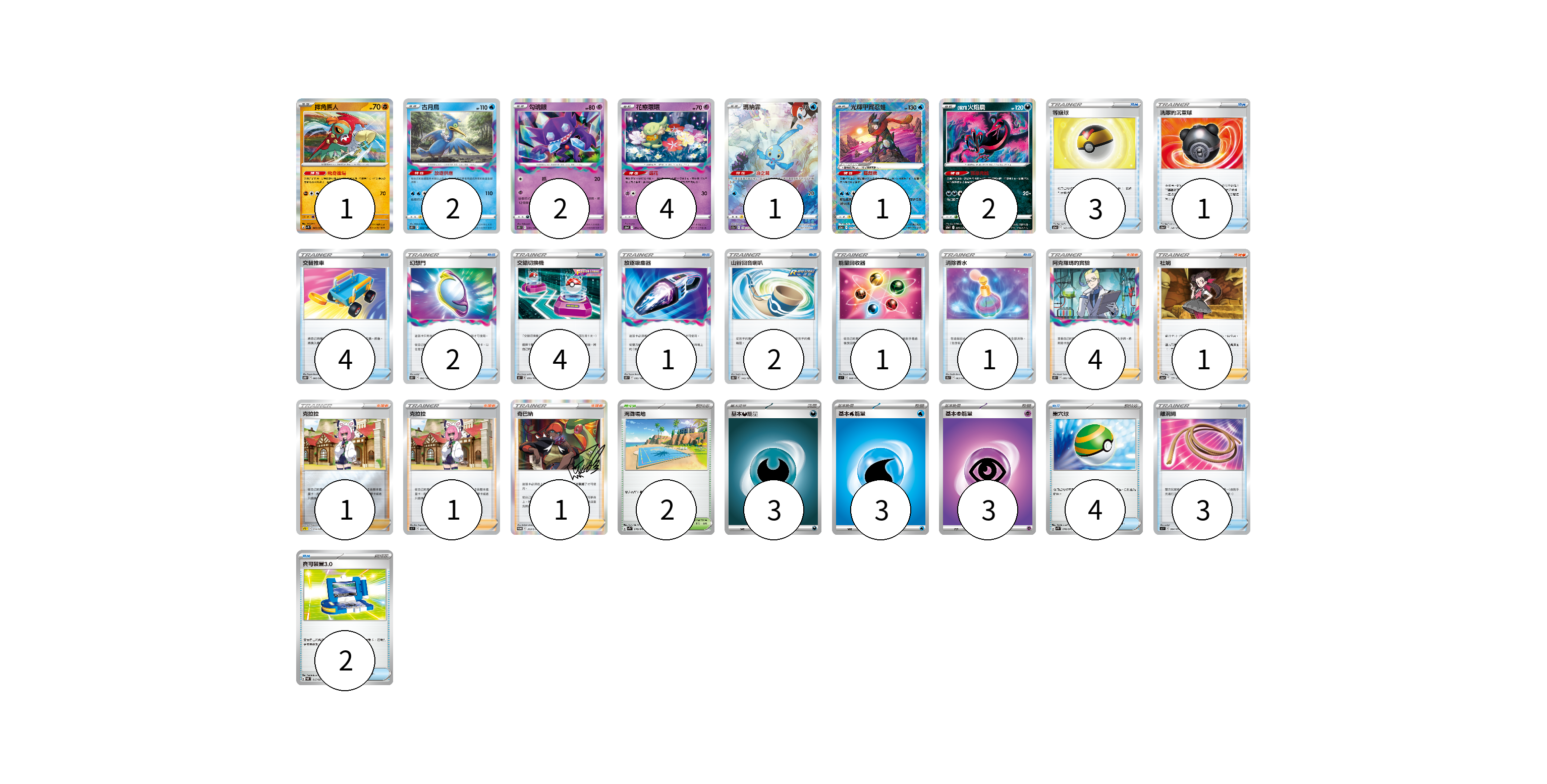 牌組構築方案 以此牌組為基礎新構築牌組 顯示卡面 顯示列表 寶可夢卡(13) 1 2 2 4 1 1 2 物品卡(28) 3 1 4 2 4 1 2 1 1 4 3 2 支援者卡(8) 4 1 1 1 1 競技場卡(2) 2 能量卡(9) 3 3 3 寶可夢卡(13) 卡牌名稱 張數 卡牌名稱 張數 摔角鷹人 SV1S 045/078 01 古月鳥 S11 033/100 02 勾魂眼 S11 044/100 02 花療環環 S12a 064/172 04 瑪納霏 S12a 178/172 01 光輝甲賀忍蛙 S12a 033/172 01 伽勒爾 火焰鳥 S12a 079/172 02 物品卡(28) 卡牌名稱 張數 卡牌名稱 張數 等級球 S12a 143/172 03 洗翠的沉重球 S12a 140/172 01 交替推車 S10D 060/067 04 幻想門 S11 092/100 02 交錯切換機 S8 090/100 04 放逐吸塵器 S11 093/100 01 山谷回音喇叭 S8b 140/184 02 能量回收器 SI 368/414 01 消除香水 S9a 063/067 01 巢穴球 SV1S 070/078 04 離洞繩 SI 364/414 03 寶可裝置3.0 SVAL 015/021 02 支援者卡(8) 卡牌名稱 張數 卡牌名稱 張數 阿克羅瑪的實驗 S11 095/100 04 杜娟 S12a 157/172 01 克拉拉 SPZ 014/020 01 克拉拉 SI 392/414 01 奇巴納 S-P 203/S-P 01 競技場卡(2) 卡牌名稱 張數 卡牌名稱 張數 海灘場地 SV1S 078/078 02 能量卡(9) 卡牌名稱 張數 卡牌名稱 張數 基本惡能量 sv-p DAR 03 基本【水】能量 SVAW WAT 03 基本【超】能量 SVAW PSY 03 以此牌組為基礎新構築牌組 牌組編碼 cDzKNw-SnQugp-GKleYW copy 列印牌組單 牌組編碼已複製 分享至SNS