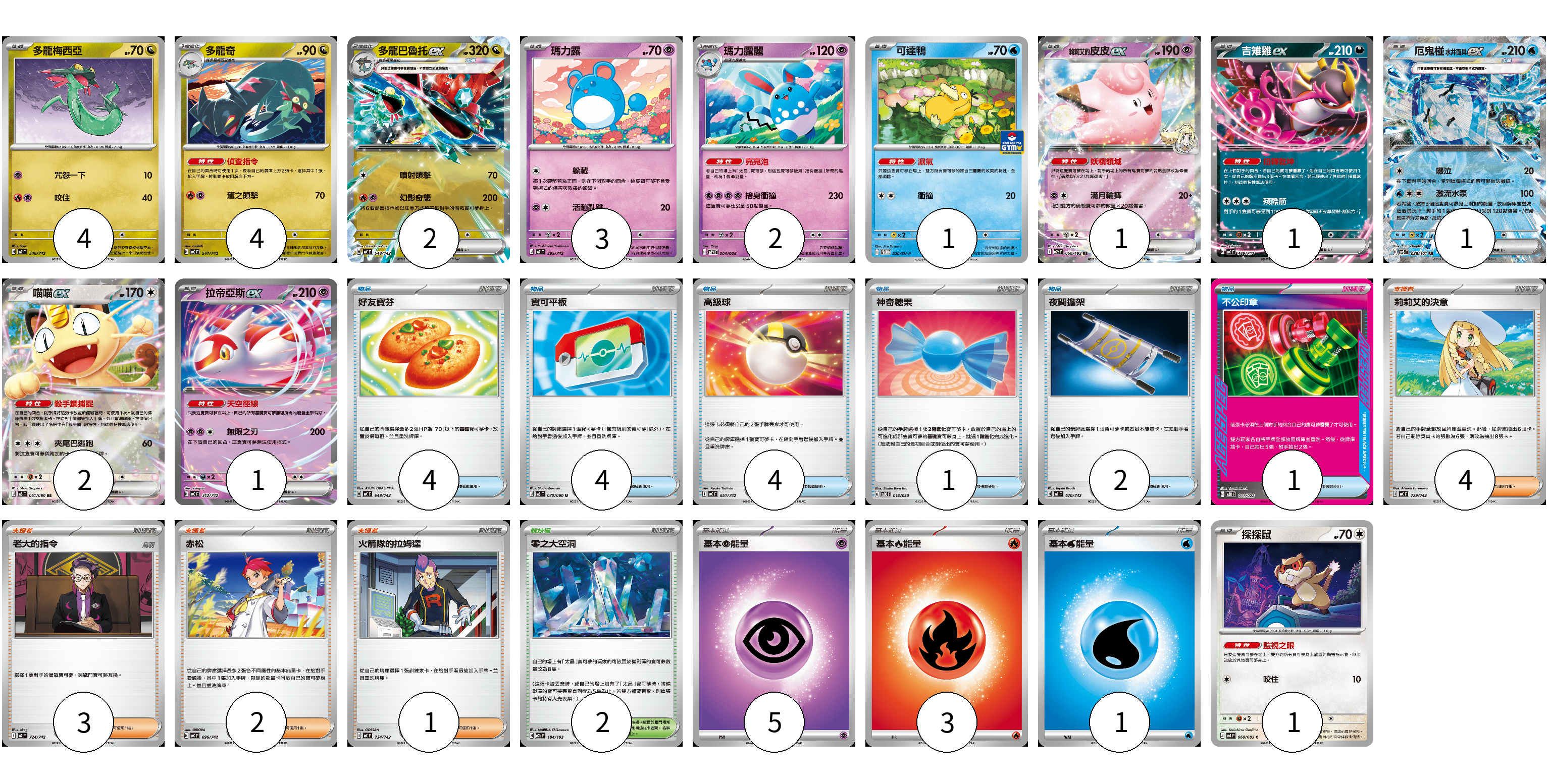 牌組構築方案 以此牌組為基礎新構築牌組 顯示卡面 顯示列表 寶可夢卡(23) 4 4 2 3 2 1 1 1 1 2 1 1 物品卡(16) 4 4 4 1 2 1 支援者卡(10) 4 3 2 1 競技場卡(2) 2 能量卡(9) 5 3 1 寶可夢卡(23) 卡牌名稱 張數 卡牌名稱 張數 多龍梅西亞 MC 546/742 04 多龍奇 MC 547/742 04 多龍巴魯托ex MC 548/742 02 瑪力露 MC 295/742 03 瑪力露麗 SVPN 004/008 02 可達鴨 SV-P 220/SV-P 01 莉莉艾的皮皮ex M2a 060/193 01 吉雉雞ex MC 489/742 01 厄鬼椪 水井面具ex SV6 038/101 01 喵喵ex M3 061/080 02 拉帝亞斯ex MC 312/742 01 探探鼠 M4 068/083 01 物品卡(16) 卡牌名稱 張數 卡牌名稱 張數 好友寶芬 MC 648/742 04 寶可平板 M3 070/080 04 高級球 MC 651/742 04 神奇糖果 SVOD 013/020 01 夜間擔架 MC 670/742 02 不公印章 MBD 011/022 01 支援者卡(10) 卡牌名稱 張數 卡牌名稱 張數 莉莉艾的決意 MC 729/742 04 老大的指令 MC 724/742 03 赤松 MC 696/742 02 火箭隊的拉姆達 MC 734/742 01 競技場卡(2) 卡牌名稱 張數 卡牌名稱 張數 零之大空洞 M2a 184/193 02 能量卡(9) 卡牌名稱 張數 卡牌名稱 張數 基本【超】能量 MC PSY 05 基本【火】能量 MC FIR 03 基本【水】能量 MC WAT 01 以此牌組為基礎新構築牌組 牌組編碼 cFdusu-sKIAzD-LhXwlB copy 列印牌組單 牌組編碼已複製 分享至SNS