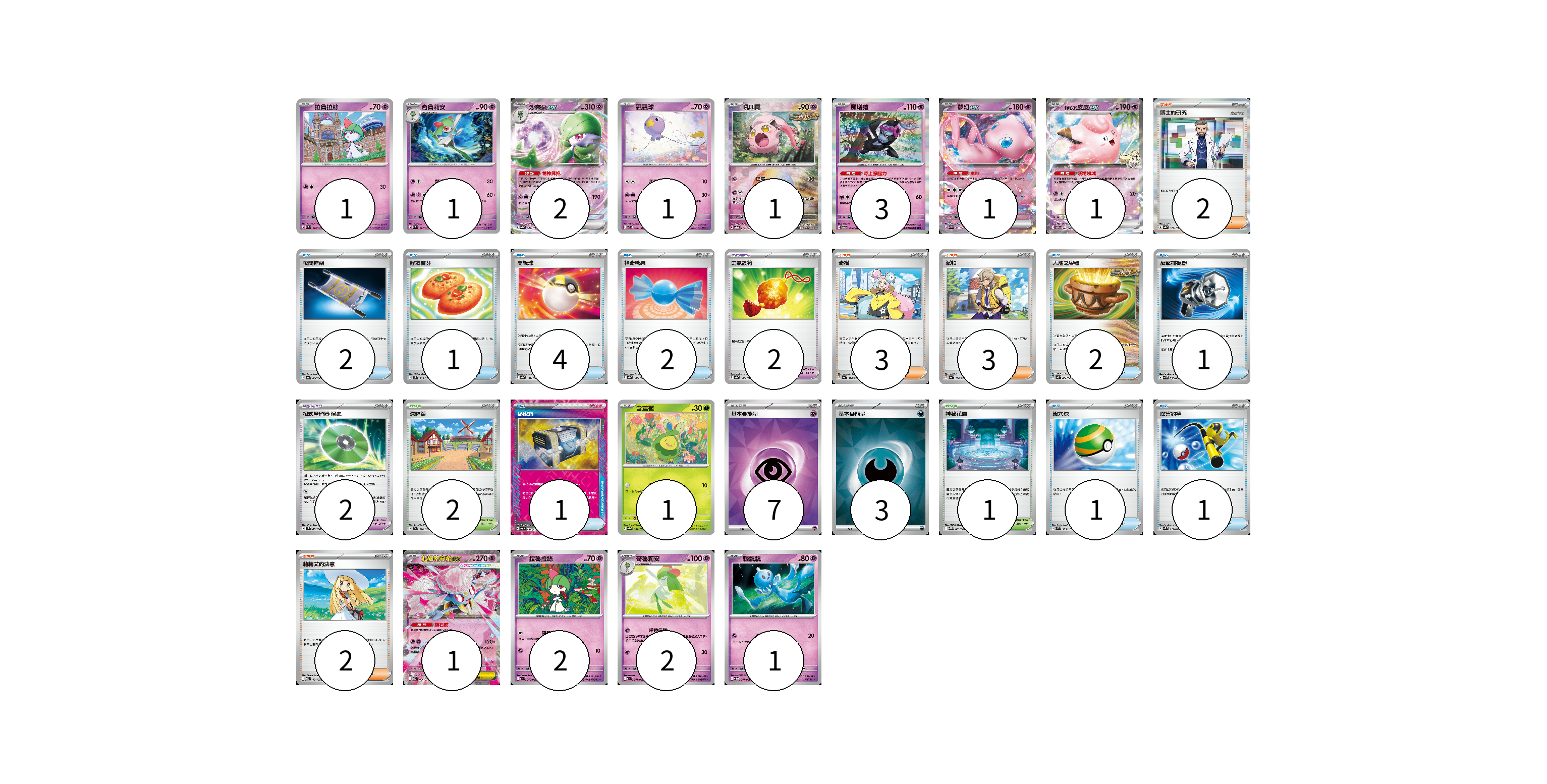 牌組構築方案 以此牌組為基礎新構築牌組 顯示卡面 顯示列表 寶可夢卡(18) 1 1 2 1 1 3 1 1 1 1 2 2 1 寶可夢道具(4) 2 2 物品卡(15) 2 1 4 2 2 1 1 1 1 支援者卡(10) 2 3 3 2 競技場卡(3) 2 1 能量卡(10) 7 3 寶可夢卡(18) 卡牌名稱 張數 卡牌名稱 張數 拉魯拉絲 SV1S 026/078 01 奇魯莉安 SV1S 027/078 01 沙奈朵ex SV4a 082/190 02 飄飄球 SVD 052/139 01 吼叫尾 SV8a 071/187 01 願增猿 SV6 055/101 03 夢幻ex SVK 001/042 01 莉莉艾的皮皮ex SV9 033/100 01 含羞苞 SV8a 001/187 01 超級蒂安希ex MBD 006/022 01 拉魯拉絲 M1S 040/063 02 奇魯莉安 M1S 041/063 02 輕飄飄 SV11W 041/086 01 寶可夢道具(4) 卡牌名稱 張數 卡牌名稱 張數 勇氣護符 SV4a 169/190 02 招式學習器 演進 SV4M 063/066 02 物品卡(15) 卡牌名稱 張數 卡牌名稱 張數 夜間擔架 SV6a 056/064 02 好友寶芬 SV5K 063/071 01 高級球 SV4a 161/190 04 神奇糖果 SV4a 163/190 02 大地之容器 SV4K 060/066 02 反擊捕捉器 SV4M 059/066 01 秘密箱 SV6 092/101 01 巢穴球 SVM 133/175 01 厲害釣竿 SVK 011/042 01 支援者卡(10) 卡牌名稱 張數 卡牌名稱 張數 博士的研究 SV4a 177/190 02 奇樹 SV4a 174/190 03 派帕 SV4a 180/190 03 莉莉艾的決意 MBD 021/022 02 競技場卡(3) 卡牌名稱 張數 卡牌名稱 張數 深缽鎮 SV1a 070/073 02 神秘花園 M1S 063/063 01 能量卡(10) 卡牌名稱 張數 卡牌名稱 張數 基本【超】能量 SVOD PSY 07 基本【惡】能量 SVOM DAR 03 以此牌組為基礎新構築牌組 牌組編碼 cHjhPF-YjNtQt-MaFDjN copy 列印牌組單 牌組編碼已複製 分享至SNS