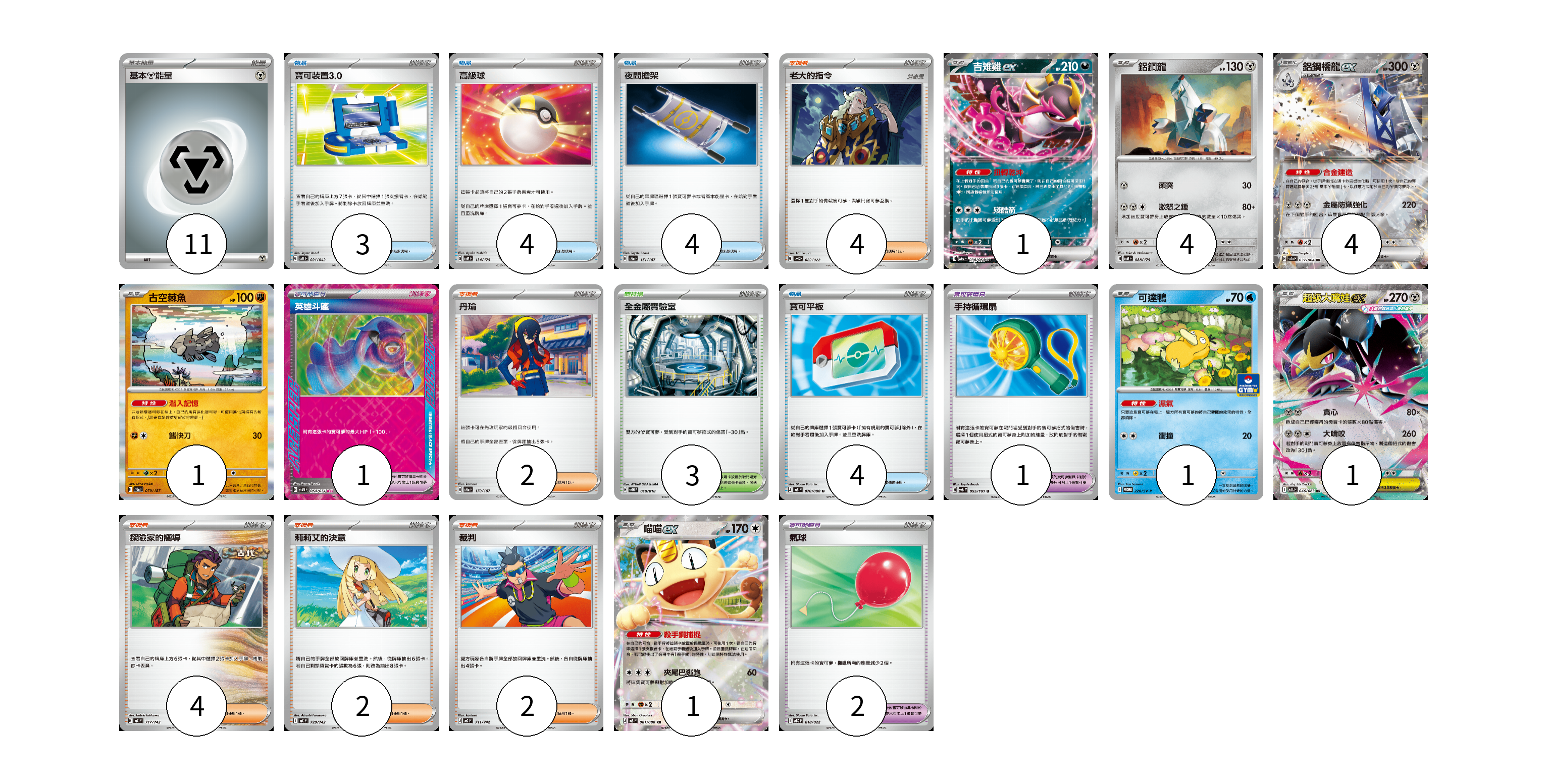 牌組構築方案 以此牌組為基礎新構築牌組 顯示卡面 顯示列表 寶可夢卡(13) 1 4 4 1 1 1 1 寶可夢道具(2) 1 1 物品卡(17) 3 4 4 4 2 支援者卡(14) 4 2 4 2 2 競技場卡(3) 3 能量卡(11) 11 寶可夢卡(13) 卡牌名稱 張數 卡牌名稱 張數 吉雉雞ex SV6a 038/064 01 鋁鋼龍 SVM 088/175 04 鋁鋼橋龍ex SV7a 037/064 04 古空棘魚 SV8a 079/187 01 可達鴨 SV-P 220/SV-P 01 超級大嘴娃ex M1L 046/063 01 喵喵ex M3 061/080 01 寶可夢道具(2) 卡牌名稱 張數 卡牌名稱 張數 英雄斗篷 SV5M 064/071 01 手持循環扇 SV6 095/101 01 物品卡(17) 卡牌名稱 張數 卡牌名稱 張數 寶可裝置3.0 SVK 021/042 03 高級球 SVM 134/175 04 夜間擔架 SV8a 151/187 04 寶可平板 M3 070/080 04 氣球 MBD 018/022 02 支援者卡(14) 卡牌名稱 張數 卡牌名稱 張數 老大的指令 SVHK 022/022 04 丹瑜 SV8a 170/187 02 探險家的嚮導 MC 717/742 04 莉莉艾的決意 MC 729/742 02 裁判 MC 711/742 02 競技場卡(3) 卡牌名稱 張數 卡牌名稱 張數 全金屬實驗室 SVTH 018/018 03 能量卡(11) 卡牌名稱 張數 卡牌名稱 張數 基本鋼能量 sv-p MET 11 以此牌組為基礎新構築牌組 牌組編碼 cLWmzE-DoNuFv-vDyjzV copy 列印牌組單 牌組編碼已複製 分享至SNS