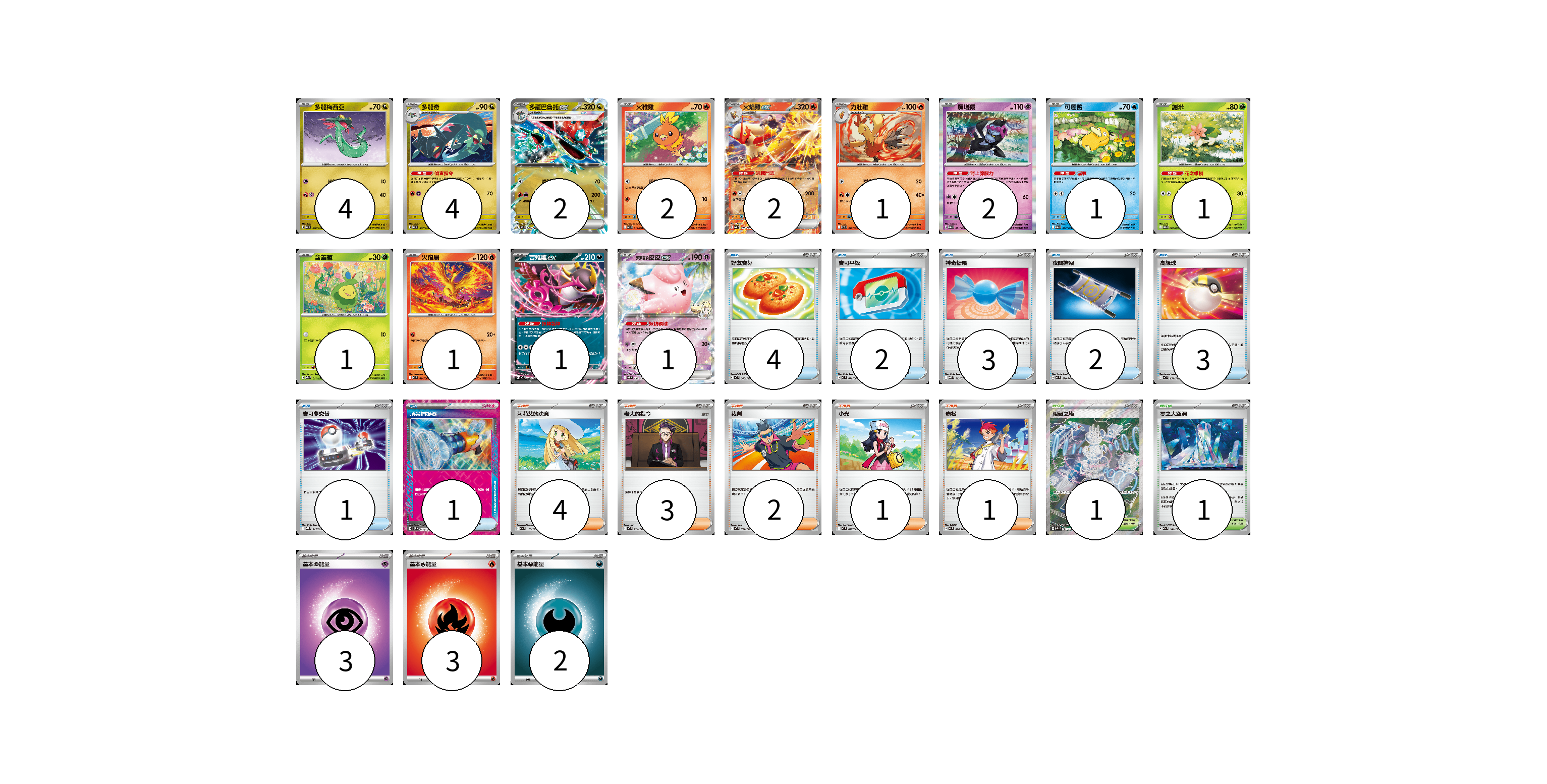 牌組構築方案 以此牌組為基礎新構築牌組 顯示卡面 顯示列表 寶可夢卡(23) 4 4 2 2 2 1 2 1 1 1 1 1 1 物品卡(16) 4 2 3 2 3 1 1 支援者卡(11) 4 3 2 1 1 競技場卡(2) 1 1 能量卡(8) 3 3 2 寶可夢卡(23) 卡牌名稱 張數 卡牌名稱 張數 多龍梅西亞 MC 546/742 04 多龍奇 MC 547/742 04 多龍巴魯托ex MC 548/742 02 火稚雞 SV10 018/098 02 火焰雞ex SVM 016/175 02 力壯雞 SV10 019/098 01 願增猿 M2a 081/193 02 可達鴨 M2a 032/193 01 謝米 SV9a 006/063 01 含羞苞 M2a 011/193 01 火焰鳥 M2 014/080 01 吉雉雞ex MC 489/742 01 莉莉艾的皮皮ex SV9 033/100 01 物品卡(16) 卡牌名稱 張數 卡牌名稱 張數 好友寶芬 MC 648/742 04 寶可平板 M3 070/080 02 神奇糖果 MBG 013/022 03 夜間擔架 MC 670/742 02 高級球 MC 651/742 03 寶可夢交替 MBG 015/022 01 頂尖捕捉器 SV5M 062/071 01 支援者卡(11) 卡牌名稱 張數 卡牌名稱 張數 莉莉艾的決意 M2a 175/193 04 老大的指令 MC 724/742 03 裁判 MC 711/742 02 小光 M2 077/080 01 赤松 MC 696/742 01 競技場卡(2) 卡牌名稱 張數 卡牌名稱 張數 阻礙之塔 M2a 222/193 01 零之大空洞 M2a 184/193 01 能量卡(8) 卡牌名稱 張數 卡牌名稱 張數 基本【超】能量 MBD PSY 03 基本【火】能量 MC FIR 03 基本【惡】能量 MBG DAR 02 以此牌組為基礎新構築牌組 牌組編碼 cNOCQq-vLDnli-YVNOGn copy 列印牌組單 牌組編碼已複製 分享至SNS