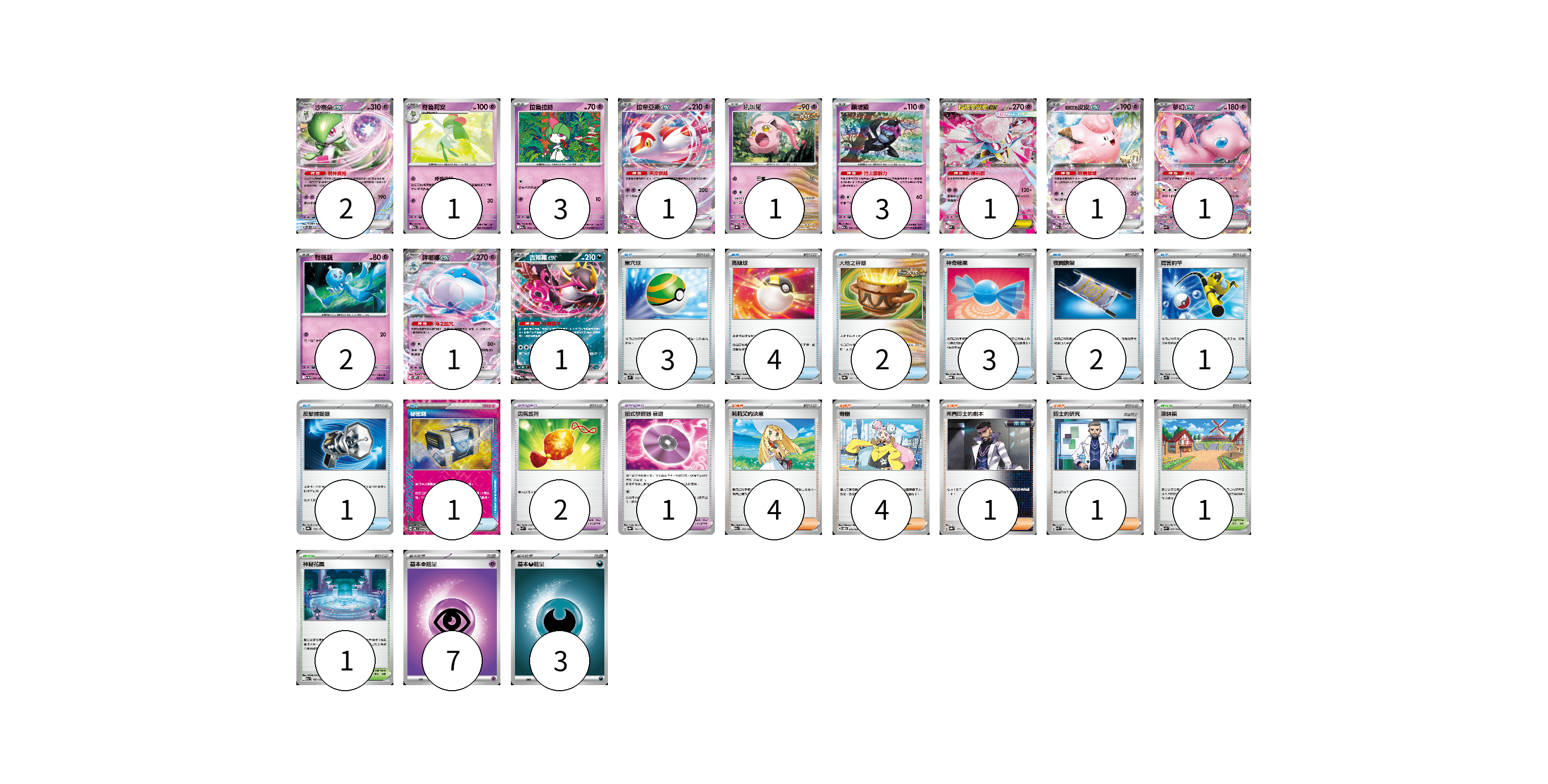 牌組構築方案 以此牌組為基礎新構築牌組 顯示卡面 顯示列表 寶可夢卡(18) 2 1 3 1 1 3 1 1 1 2 1 1 寶可夢道具(3) 2 1 物品卡(17) 3 4 2 3 2 1 1 1 支援者卡(10) 4 4 1 1 競技場卡(2) 1 1 能量卡(10) 7 3 寶可夢卡(18) 卡牌名稱 張數 卡牌名稱 張數 沙奈朵ex SVTS 004/022 02 奇魯莉安 M2a 070/193 01 拉魯拉絲 M2a 069/193 03 拉帝亞斯ex M2a 075/193 01 吼叫尾 SV8a 071/187 01 願增猿 M2a 081/193 03 超級蒂安希ex MBD 006/022 01 莉莉艾的皮皮ex M2a 060/193 01 夢幻ex SVK 001/042 01 輕飄飄 SV11W 041/086 02 胖嘟嘟ex SV11W 042/086 01 吉雉雞ex M2a 114/193 01 寶可夢道具(3) 卡牌名稱 張數 卡牌名稱 張數 勇氣護符 SVM 142/175 02 招式學習器 衰退 SV8a 161/187 01 物品卡(17) 卡牌名稱 張數 卡牌名稱 張數 巢穴球 SVM 133/175 03 高級球 MBD 014/022 04 大地之容器 SV8a 143/187 02 神奇糖果 MBG 013/022 03 夜間擔架 M2a 159/193 02 厲害釣竿 SVK 011/042 01 反擊捕捉器 SV8a 139/187 01 秘密箱 SV6 092/101 01 支援者卡(10) 卡牌名稱 張數 卡牌名稱 張數 莉莉艾的決意 M2a 175/193 04 奇樹 SVOD 016/020 04 弗圖博士的劇本 SV8a 175/187 01 博士的研究 SVK 033/042 01 競技場卡(2) 卡牌名稱 張數 卡牌名稱 張數 深缽鎮 SVK 039/042 01 神秘花園 M2a 187/193 01 能量卡(10) 卡牌名稱 張數 卡牌名稱 張數 基本【超】能量 MBD PSY 07 基本【惡】能量 MBG DAR 03 以此牌組為基礎新構築牌組 牌組編碼 cPcXxM-MoeZPm-Wpirvl copy 列印牌組單 牌組編碼已複製 分享至SNS