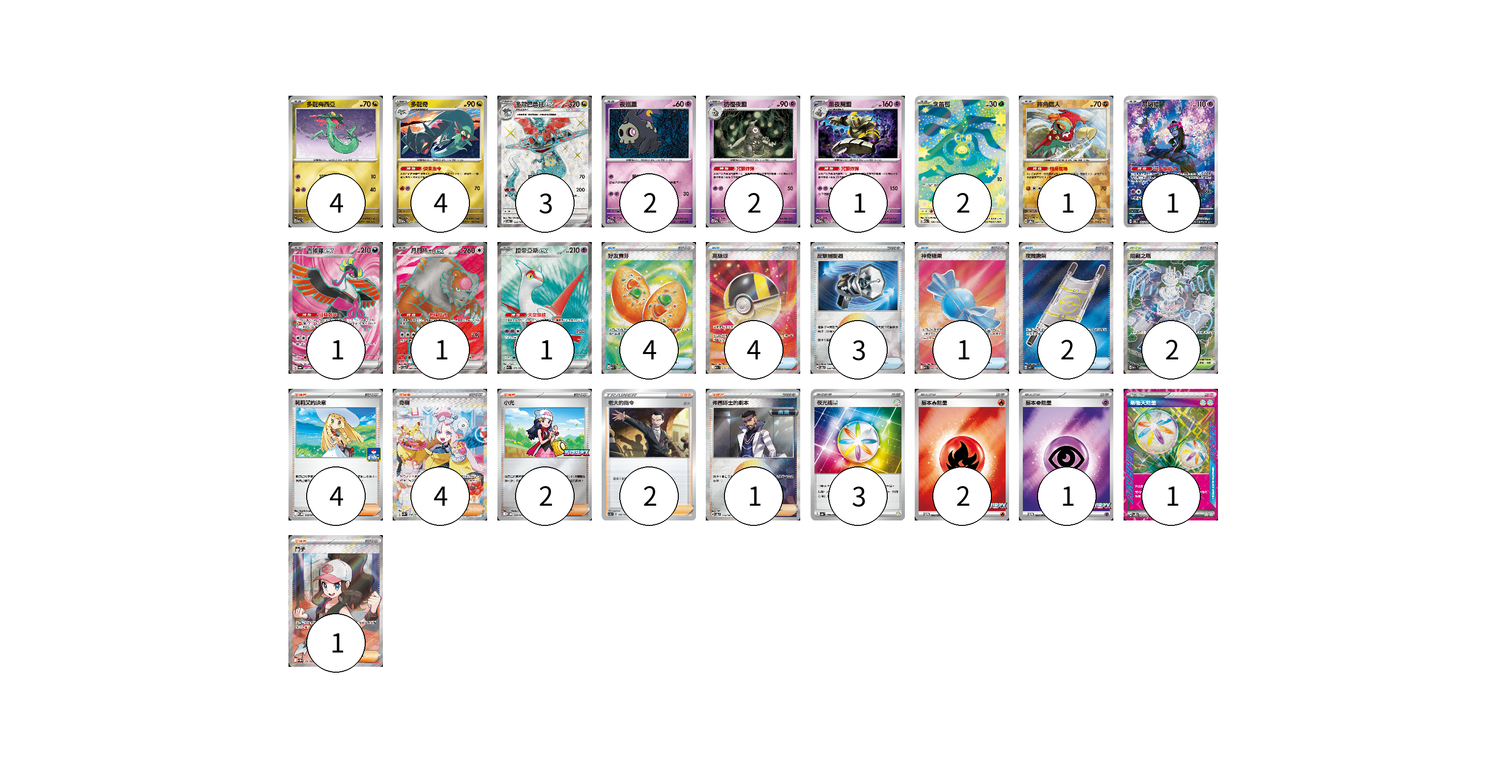 牌組構築方案 以此牌組為基礎新構築牌組 顯示卡面 顯示列表 寶可夢卡(23) 4 4 3 2 2 1 2 1 1 1 1 1 物品卡(14) 4 4 3 1 2 支援者卡(14) 4 4 2 2 1 1 競技場卡(2) 2 能量卡(7) 3 2 1 1 寶可夢卡(23) 卡牌名稱 張數 卡牌名稱 張數 多龍梅西亞 M2a 132/193 04 多龍奇 M2a 133/193 04 多龍巴魯托ex SV6 120/101 03 夜巡靈 M2a 072/193 02 彷徨夜靈 M2a 073/193 02 黑夜魔靈 M2a 074/193 01 含羞苞 M2a 196/193 02 摔角鷹人 SV8a 084/187 01 願增猿 SV6 107/101 01 吉雉雞ex SV6a 081/064 01 月月熊 赫月 ex SV5a 084/066 01 拉帝亞斯ex SV7a 078/064 01 物品卡(14) 卡牌名稱 張數 卡牌名稱 張數 好友寶芬 M1S 081/063 04 高級球 M2a 216/193 04 反擊捕捉器 SV8a 139/187 03 神奇糖果 M1S 082/063 01 夜間擔架 M1L 083/063 02 支援者卡(14) 卡牌名稱 張數 卡牌名稱 張數 莉莉艾的決意 M-P 018/M-P 04 奇樹 SV2D 096/071 04 小光 M-P 028/M-P 02 老大的指令(坂木) SC1b 148/153 02 弗圖博士的劇本 SV8a 175/187 01 鬥子 SV11W 166/086 01 競技場卡(2) 卡牌名稱 張數 卡牌名稱 張數 阻礙之塔 M2a 222/193 02 能量卡(7) 卡牌名稱 張數 卡牌名稱 張數 夜光能量 SV4a 190/190 03 基本【火】能量 M-P 032/M-P 02 基本【超】能量 M-P 033/M-P 01 新衝天能量 SV5K 071/071 01 以此牌組為基礎新構築牌組 牌組編碼 cRDyiy-PaxCoS-SzlkKF copy 列印牌組單 牌組編碼已複製 分享至SNS