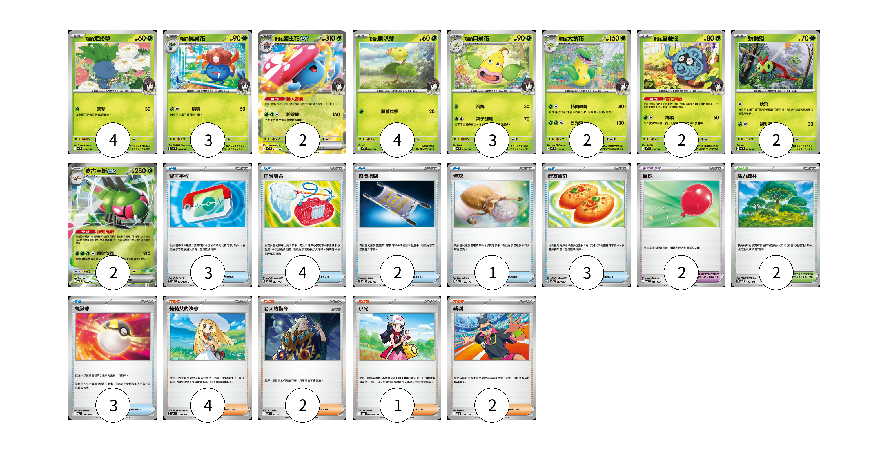 牌組構築方案 以此牌組為基礎新構築牌組 顯示卡面 顯示列表 寶可夢卡(24) 4 3 2 4 3 2 2 2 2 寶可夢道具(2) 2 物品卡(16) 3 4 2 1 3 3 支援者卡(9) 4 2 1 2 競技場卡(2) 2 寶可夢卡(24) 卡牌名稱 張數 卡牌名稱 張數 莉佳的走路草 MC 001/742 04 莉佳的臭臭花 MC 002/742 03 莉佳的霸王花ex MC 003/742 02 莉佳的喇叭芽 MC 006/742 04 莉佳的口呆花 MC 007/742 03 莉佳的大食花 MC 008/742 02 莉佳的蔓藤怪 MC 014/742 02 蜻蜻蜓 MC 021/742 02 遠古巨蜓ex MC 022/742 02 寶可夢道具(2) 卡牌名稱 張數 卡牌名稱 張數 氣球 M2a 165/193 02 物品卡(16) 卡牌名稱 張數 卡牌名稱 張數 寶可平板 M3 070/080 03 捕蟲組合 MC 667/742 04 夜間擔架 MC 670/742 02 聖灰 M2a 150/193 01 好友寶芬 M2a 153/193 03 高級球 MBD 014/022 03 支援者卡(9) 卡牌名稱 張數 卡牌名稱 張數 莉莉艾的決意 MC 729/742 04 老大的指令 MBG 021/022 02 小光 M2 077/080 01 裁判 MC 711/742 02 競技場卡(2) 卡牌名稱 張數 卡牌名稱 張數 活力森林 M2a 182/193 02 以此牌組為基礎新構築牌組 牌組編碼 cYQmPu-RhFWrr-HYSybJ copy 列印牌組單 牌組編碼已複製 分享至SNS