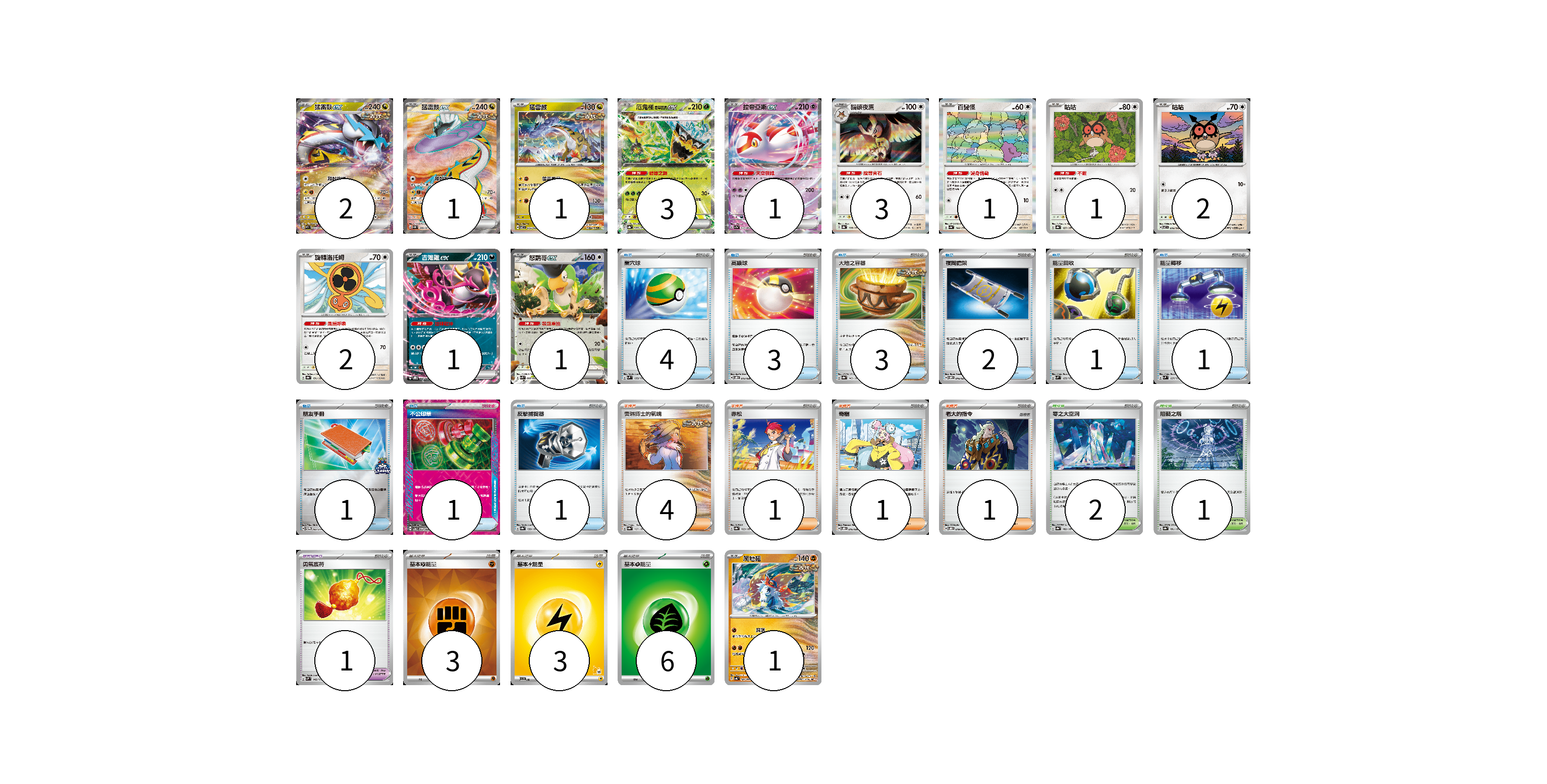 牌組構築方案 以此牌組為基礎新構築牌組 顯示卡面 顯示列表 寶可夢卡(20) 2 1 1 3 1 3 1 1 2 2 1 1 1 寶可夢道具(1) 1 物品卡(17) 4 3 3 2 1 1 1 1 1 支援者卡(7) 4 1 1 1 競技場卡(3) 2 1 能量卡(12) 3 3 6 寶可夢卡(20) 卡牌名稱 張數 卡牌名稱 張數 猛雷鼓ex SV5K 053/071 02 猛雷鼓ex SV5K 089/071 01 猛雷鼓 SV7 075/102 01 厄鬼椪 碧草面具ex SV8a 020/187 03 拉帝亞斯ex SV7a 019/064 01 貓頭夜鷹 SV8a 128/187 03 百變怪 SV4a 144/190 01 咕咕 SV8a 127/187 01 咕咕 SV7 076/102 02 旋轉洛托姆 SV8a 131/187 02 吉雉雞ex SVOD 004/020 01 怒鸚哥ex SVK 006/042 01 爬地翅 SV4K 041/066 01 寶可夢道具(1) 卡牌名稱 張數 卡牌名稱 張數 勇氣護符 SVM 142/175 01 物品卡(17) 卡牌名稱 張數 卡牌名稱 張數 巢穴球 SVM 133/175 04 高級球 SVOD 012/020 03 大地之容器 SV8a 143/187 03 夜間擔架 SVOM 016/021 02 能量回收 SVM 125/175 01 能量轉移 SVM 127/175 01 朋友手冊 SV-P 182/SV-P 01 不公印章 SV5a 053/066 01 反擊捕捉器 SV8a 139/187 01 支援者卡(7) 卡牌名稱 張數 卡牌名稱 張數 奧琳博士的氣魄 SV8a 167/187 04 赤松 SV8a 163/187 01 奇樹 SVOD 016/020 01 老大的指令 SVOD 019/020 01 競技場卡(3) 卡牌名稱 張數 卡牌名稱 張數 零之大空洞 SV8a 182/187 02 阻礙之塔 SV8a 181/187 01 能量卡(12) 卡牌名稱 張數 卡牌名稱 張數 基本【鬥】能量 SVK FIG 03 基本【雷】能量 SVI LIG 03 基本【草】能量 SVTM GRA 06 以此牌組為基礎新構築牌組 牌組編碼 caJueL-jkvkCN-cXXilu copy 列印牌組單 牌組編碼已複製 分享至SNS