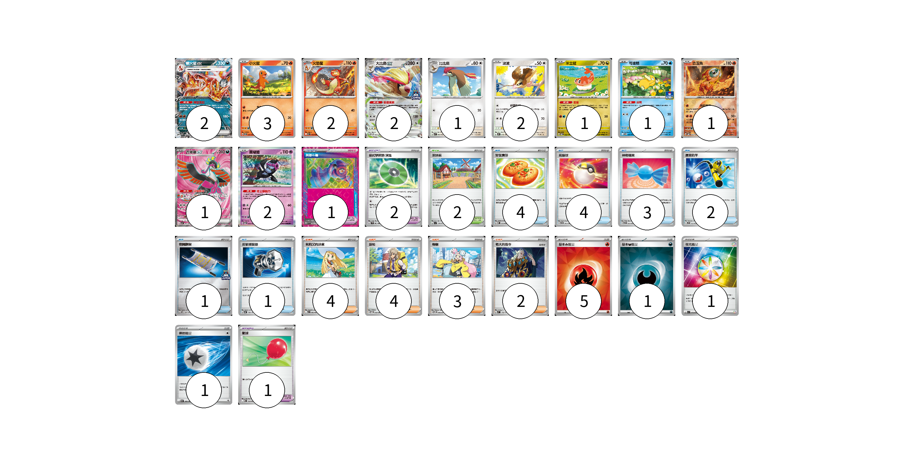 牌組構築方案 以此牌組為基礎新構築牌組 顯示卡面 顯示列表 寶可夢卡(18) 2 3 2 2 1 2 1 1 1 1 2 寶可夢道具(3) 1 2 物品卡(16) 4 4 3 2 1 1 1 支援者卡(13) 4 4 3 2 競技場卡(2) 2 能量卡(8) 5 1 1 1 寶可夢卡(18) 卡牌名稱 張數 卡牌名稱 張數 噴火龍ex SVTL 006/021 02 小火龍 SVTL 001/021 03 火恐龍 M2 012/080 02 大比鳥ex SV-P 183/SV-P 02 比比鳥 SVK 004/042 01 波波 SV2a 016/165 02 米立龍 SV6 082/101 01 可達鴨 SV-P 220/SV-P 01 古玉魚 SV8a 025/187 01 吉雉雞ex SV6a 081/064 01 願增猿 SV6 055/101 02 寶可夢道具(3) 卡牌名稱 張數 卡牌名稱 張數 英雄斗篷 SV5M 064/071 01 招式學習器 演進 SV4M 063/066 02 物品卡(16) 卡牌名稱 張數 卡牌名稱 張數 好友寶芬 MBD 013/022 04 高級球 SVTH 011/018 04 神奇糖果 SVTS 015/022 03 厲害釣竿 SVF 013/038 02 夜間擔架 SV-P 204/SV-P 01 反擊捕捉器 SV8a 139/187 01 氣球 MBD 018/022 01 支援者卡(13) 卡牌名稱 張數 卡牌名稱 張數 莉莉艾的決意 M1L 062/063 04 派帕 SVOD 018/020 04 奇樹 SVOM 018/021 03 老大的指令 SVM 172/175 02 競技場卡(2) 卡牌名稱 張數 卡牌名稱 張數 深缽鎮 SV1a 070/073 02 能量卡(8) 卡牌名稱 張數 卡牌名稱 張數 基本【火】能量 SVM FIR 05 基本【惡】能量 SVK DAR 01 夜光能量 SV1a 073/073 01 噴射能量 SV8a 185/187 01 以此牌組為基礎新構築牌組 牌組編碼 ceHtsK-rWSJto-bzAiTe copy 列印牌組單 牌組編碼已複製 分享至SNS