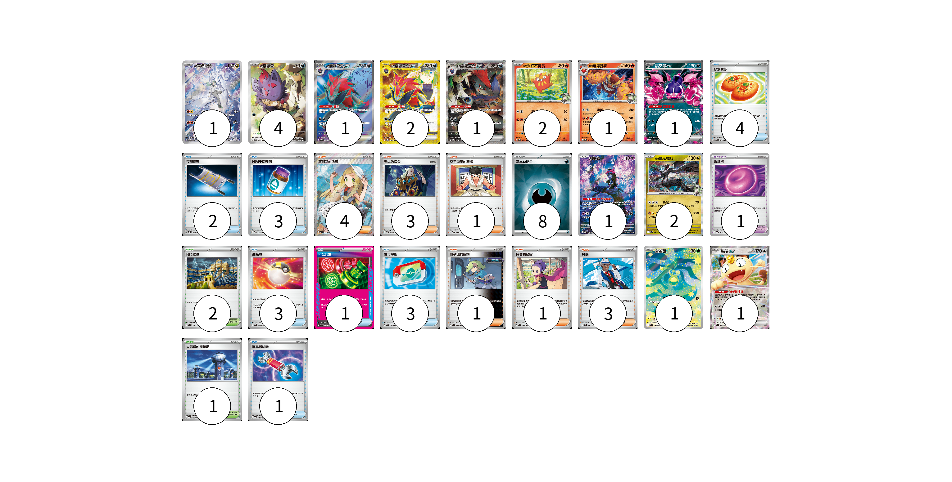 牌組構築方案 以此牌組為基礎新構築牌組 顯示卡面 顯示列表 寶可夢卡(18) 1 4 1 2 1 2 1 1 1 2 1 1 寶可夢道具(1) 1 物品卡(17) 4 2 3 3 1 3 1 支援者卡(13) 4 3 1 1 1 3 競技場卡(3) 2 1 能量卡(8) 8 寶可夢卡(18) 卡牌名稱 張數 卡牌名稱 張數 N的萊希拉姆 SV9 109/100 01 N的索羅亞 SV9 108/100 04 N的索羅亞克ex SV9 117/100 01 N的索羅亞克ex SV9 131/100 02 N的索羅亞克ex SV9 127/100 01 N的火紅不倒翁 SV9 015/100 02 N的達摩狒狒 SV9 016/100 01 桃歹郎ex MBG 009/022 01 願增猿 SV6 107/101 01 N的捷克羅姆 M2a 129/193 02 含羞苞 M2a 196/193 01 喵喵ex M3 061/080 01 寶可夢道具(1) 卡牌名稱 張數 卡牌名稱 張數 鎖鏈糬 SV8a 154/187 01 物品卡(17) 卡牌名稱 張數 卡牌名稱 張數 好友寶芬 MBD 013/022 04 夜間擔架 SV8a 151/187 02 N的PP提升劑 SV9 089/100 03 高級球 MBD 014/022 03 不公印章 MC 633/742 01 寶可平板 M3 070/080 03 道具拆除器 M2a 151/193 01 支援者卡(13) 卡牌名稱 張數 卡牌名稱 張數 莉莉艾的決意 M1L 086/063 04 老大的指令 MBG 021/022 03 空手道王的演練 SVM 143/175 01 暗碼迷的解讀 MC 698/742 01 阿杏的秘招 MC 699/742 01 席藍 SV8 102/106 03 競技場卡(3) 卡牌名稱 張數 卡牌名稱 張數 N的城堡 M2a 181/193 02 火箭隊的監視塔 M2a 189/193 01 能量卡(8) 卡牌名稱 張數 卡牌名稱 張數 基本【惡】能量 SVOM DAR 08 以此牌組為基礎新構築牌組 牌組編碼 ceJxwB-IbthkK-QCJtLA copy 列印牌組單 牌組編碼已複製 分享至SNS