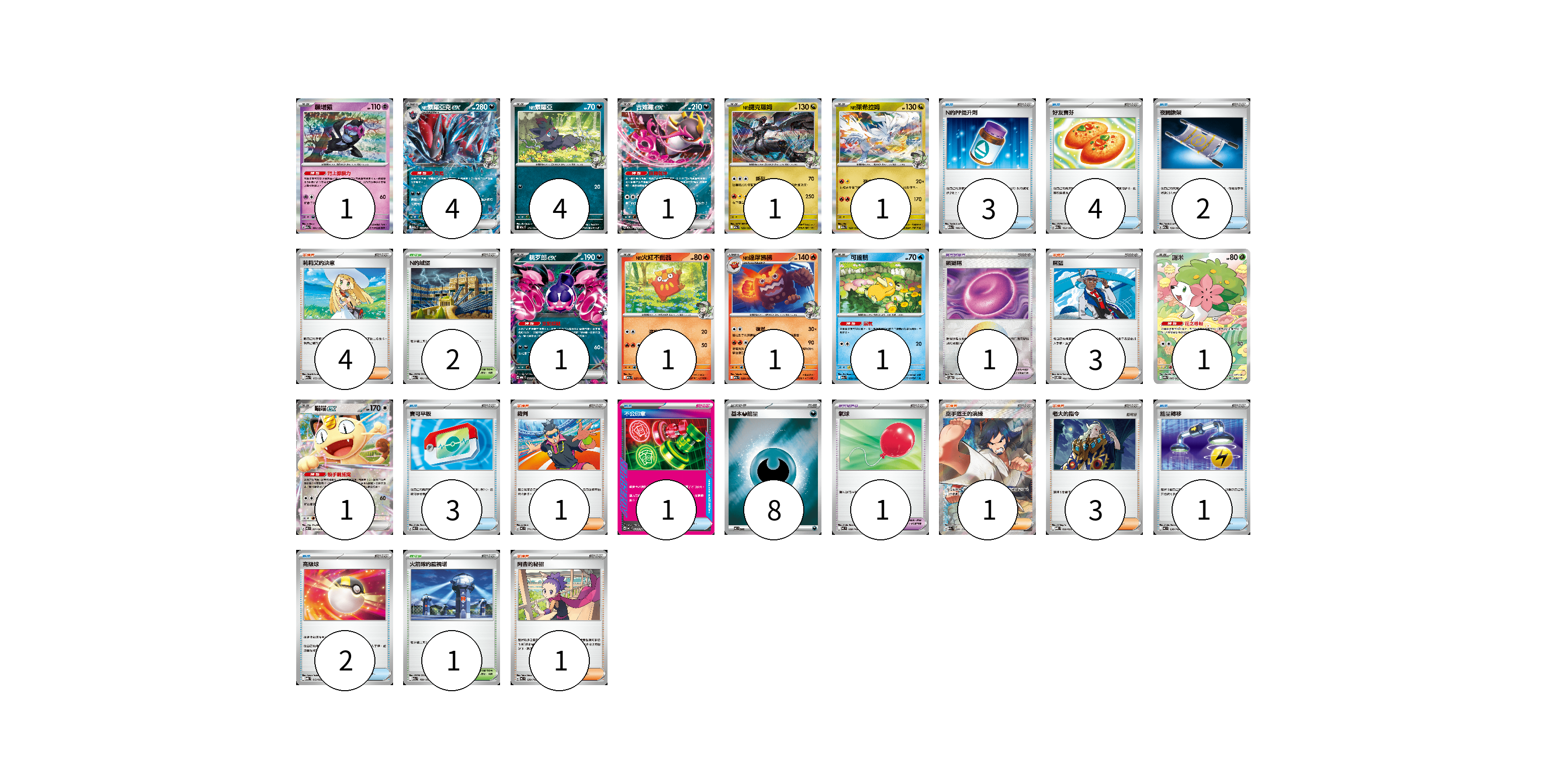 牌組構築方案 以此牌組為基礎新構築牌組 顯示卡面 顯示列表 寶可夢卡(18) 1 4 4 1 1 1 1 1 1 1 1 1 寶可夢道具(2) 1 1 物品卡(16) 3 4 2 3 1 1 2 支援者卡(13) 4 3 1 1 3 1 競技場卡(3) 2 1 能量卡(8) 8 寶可夢卡(18) 卡牌名稱 張數 卡牌名稱 張數 願增猿 M2a 081/193 01 N的索羅亞克ex M2a 112/193 04 N的索羅亞 M2a 111/193 04 吉雉雞ex M2a 114/193 01 N的捷克羅姆 M2a 129/193 01 N的萊希拉姆 M2a 128/193 01 桃歹郎ex MBG 009/022 01 N的火紅不倒翁 M2a 027/193 01 N的達摩狒狒 M2a 028/193 01 可達鴨 M2a 032/193 01 謝米 SV9a 066/063 01 喵喵ex M3 061/080 01 寶可夢道具(2) 卡牌名稱 張數 卡牌名稱 張數 鎖鏈糬 SV8a 154/187 01 氣球 MC 688/742 01 物品卡(16) 卡牌名稱 張數 卡牌名稱 張數 N的PP提升劑 M2a 146/193 03 好友寶芬 M2a 153/193 04 夜間擔架 M2a 159/193 02 寶可平板 M3 070/080 03 不公印章 MC 633/742 01 能量轉移 MC 638/742 01 高級球 MBG 012/022 02 支援者卡(13) 卡牌名稱 張數 卡牌名稱 張數 莉莉艾的決意 M2a 175/193 04 席藍 SV8 102/106 03 裁判 MC 711/742 01 空手道王的演練 M2a 220/193 01 老大的指令 MBD 020/022 03 阿杏的秘招 MC 699/742 01 競技場卡(3) 卡牌名稱 張數 卡牌名稱 張數 N的城堡 M2a 181/193 02 火箭隊的監視塔 M2a 189/193 01 能量卡(8) 卡牌名稱 張數 卡牌名稱 張數 基本【惡】能量 MC DAR 08 以此牌組為基礎新構築牌組 牌組編碼 cffcEq-BDxZXN-HhYyyp copy 列印牌組單 牌組編碼已複製 分享至SNS