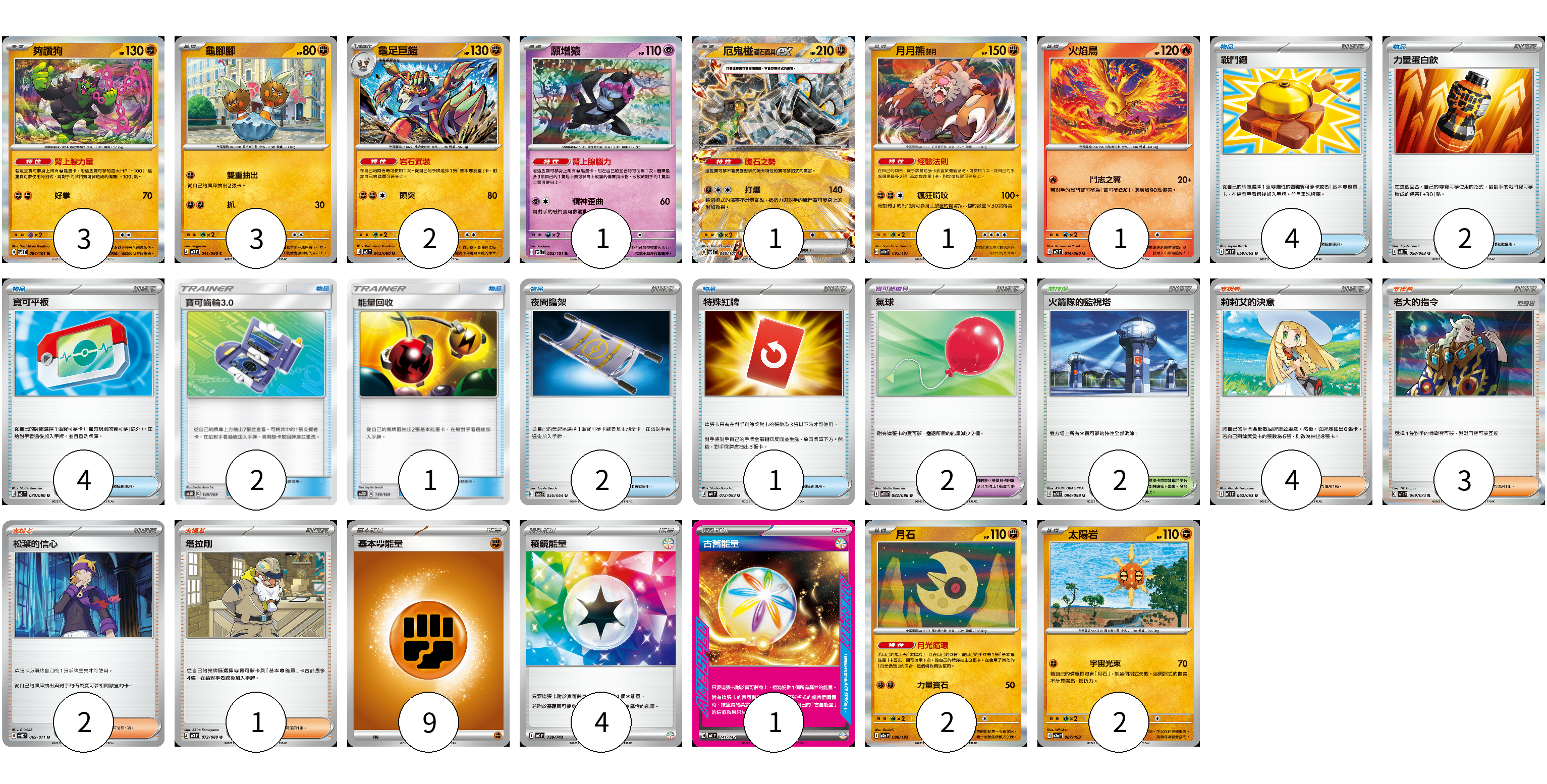 牌組構築方案 以此牌組為基礎新構築牌組 顯示卡面 顯示列表 寶可夢卡(16) 3 3 2 1 1 1 1 2 2 寶可夢道具(2) 2 物品卡(16) 4 2 4 2 1 2 1 支援者卡(10) 4 3 2 1 競技場卡(2) 2 能量卡(14) 9 4 1 寶可夢卡(16) 卡牌名稱 張數 卡牌名稱 張數 夠讚狗 SV6 064/101 03 龜腳腳 M3 041/080 03 龜足巨鎧 M3 042/080 02 願增猿 SV6 055/101 01 厄鬼椪 礎石面具ex SV6 065/101 01 月月熊 赫月 SV8a 085/187 01 火焰鳥 M2 014/080 01 月石 M2a 086/193 02 太陽岩 M2a 087/193 02 寶可夢道具(2) 卡牌名稱 張數 卡牌名稱 張數 氣球 SV11B 082/086 02 物品卡(16) 卡牌名稱 張數 卡牌名稱 張數 戰鬥鑼 M1L 059/063 04 力量蛋白飲 M1L 058/063 02 寶可平板 M3 070/080 04 寶可齒輪3.0 AS5D 149/169 02 能量回收 AS5D 139/169 01 夜間擔架 SV6a 056/064 02 特殊紅牌 M4 072/083 01 支援者卡(10) 卡牌名稱 張數 卡牌名稱 張數 莉莉艾的決意 M1L 062/063 04 老大的指令 SV1a 069/073 03 松葉的信心 SV5K 069/071 02 塔拉剛 M3 073/080 01 競技場卡(2) 卡牌名稱 張數 卡牌名稱 張數 火箭隊的監視塔 SV10 096/098 02 能量卡(14) 卡牌名稱 張數 卡牌名稱 張數 基本【鬥】能量 MC FIG 09 稜鏡能量 MC 739/742 04 古舊能量 MC 741/742 01 以此牌組為基礎新構築牌組 牌組編碼 cfsVip-HPsHdl-GUPIwC copy 列印牌組單 牌組編碼已複製 分享至SNS