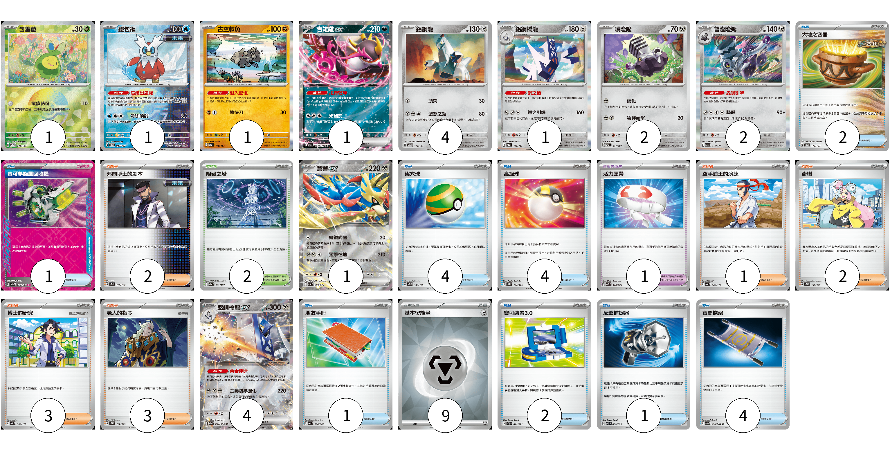 牌組構築方案 以此牌組為基礎新構築牌組 顯示卡面 顯示列表 寶可夢卡(18) 1 1 1 1 4 1 2 2 1 4 寶可夢道具(1) 1 物品卡(19) 2 1 4 4 1 2 1 4 支援者卡(11) 2 1 2 3 3 競技場卡(2) 2 能量卡(9) 9 寶可夢卡(18) 卡牌名稱 張數 卡牌名稱 張數 含羞苞 SV8a 001/187 01 鐵包袱 SV8a 047/187 01 古空棘魚 SV8a 079/187 01 吉雉雞ex SV8a 104/187 01 鋁鋼龍 SV8a 112/187 04 鋁鋼橋龍 SV8a 113/187 01 噗隆隆 SV8a 114/187 02 普隆隆姆 SV8a 115/187 02 蒼響ex SVM 089/175 01 鋁鋼橋龍ex SV7a 037/064 04 寶可夢道具(1) 卡牌名稱 張數 卡牌名稱 張數 活力頭帶 SVM 140/175 01 物品卡(19) 卡牌名稱 張數 卡牌名稱 張數 大地之容器 SV8a 143/187 02 寶可夢旋風回收機 SV8a 149/187 01 巢穴球 SVM 133/175 04 高級球 SVM 134/175 04 朋友手冊 SVK 014/042 01 寶可裝置3.0 SVTL 014/021 02 反擊捕捉器 SVTS 009/022 01 夜間擔架 SV6a 056/064 04 支援者卡(11) 卡牌名稱 張數 卡牌名稱 張數 弗圖博士的劇本 SV8a 175/187 02 空手道王的演練 SVM 148/175 01 奇樹 SVM 160/175 02 博士的研究 SVM 167/175 03 老大的指令 SVM 172/175 03 競技場卡(2) 卡牌名稱 張數 卡牌名稱 張數 阻礙之塔 SV8a 181/187 02 能量卡(9) 卡牌名稱 張數 卡牌名稱 張數 基本【鋼】能量 SVK MET 09 以此牌組為基礎新構築牌組 牌組編碼 ckosOf-vUlyit-ZwWOrg copy 列印牌組單 牌組編碼已複製 分享至SNS