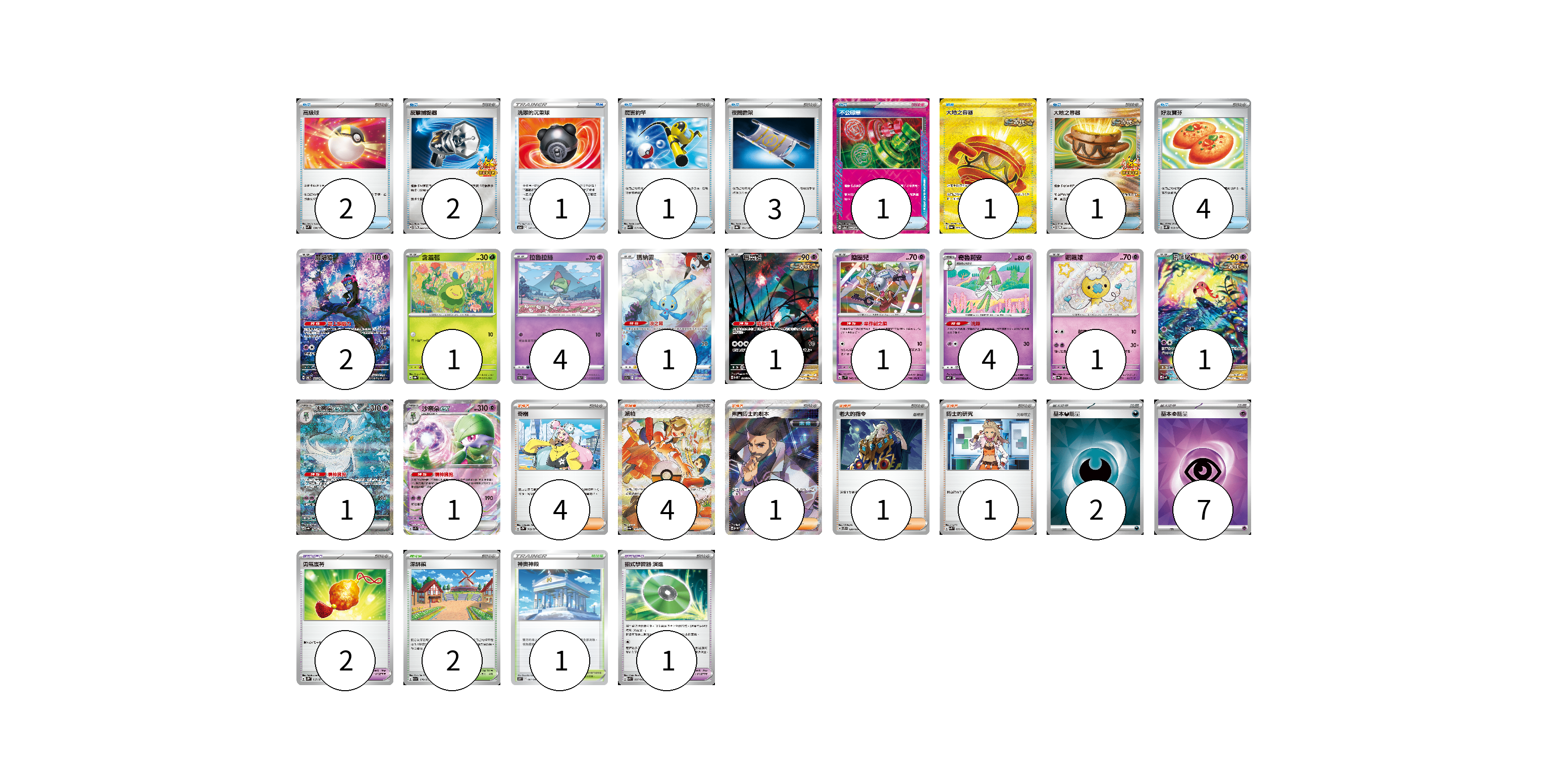 牌組構築方案 以此牌組為基礎新構築牌組 顯示卡面 顯示列表 寶可夢卡(18) 2 1 4 1 1 1 4 1 1 1 1 寶可夢道具(3) 2 1 物品卡(16) 2 2 1 1 3 1 1 1 4 支援者卡(11) 4 4 1 1 1 競技場卡(3) 2 1 能量卡(9) 2 7 寶可夢卡(18) 卡牌名稱 張數 卡牌名稱 張數 願增猿 SV6 107/101 02 含羞苞 SV8a 001/187 01 拉魯拉絲 S9a 032/067 04 瑪納霏 S12a 178/172 01 振翼髮 SV5K 076/071 01 鑰圈兒 SV1V 045/078 01 奇魯莉安 SVTS 003/022 04 飄飄球 SV4a 260/190 01 吼叫尾 SV4K 071/066 01 沙奈朵ex SV4a 348/190 01 沙奈朵ex SV1S 028/078 01 寶可夢道具(3) 卡牌名稱 張數 卡牌名稱 張數 勇氣護符 SV2D 067/071 02 招式學習器 演進 SVK 025/042 01 物品卡(16) 卡牌名稱 張數 卡牌名稱 張數 高級球 SVM 134/175 02 反擊捕捉器 SV-P 083/SV-P 02 洗翠的沉重球 S12a 140/172 01 厲害釣竿 SVK 011/042 01 夜間擔架 SV8a 151/187 03 不公印章 SV5a 053/066 01 大地之容器 SV6a 093/064 01 大地之容器 SV-P 084/SV-P 01 好友寶芬 SV5K 063/071 04 支援者卡(11) 卡牌名稱 張數 卡牌名稱 張數 奇樹 SV2D 069/071 04 派帕 SV4a 353/190 04 弗圖博士的劇本 SV4M 086/066 01 老大的指令 SVTS 020/022 01 博士的研究 SVK 032/042 01 競技場卡(3) 卡牌名稱 張數 卡牌名稱 張數 深缽鎮 SV1a 070/073 02 神奧神殿 S10P 067/067 01 能量卡(9) 卡牌名稱 張數 卡牌名稱 張數 基本【惡】能量 SVK DAR 02 基本【超】能量 SVK PSY 07 以此牌組為基礎新構築牌組 牌組編碼 clAyNu-gjBtLI-bWmhUB copy 列印牌組單 牌組編碼已複製 分享至SNS