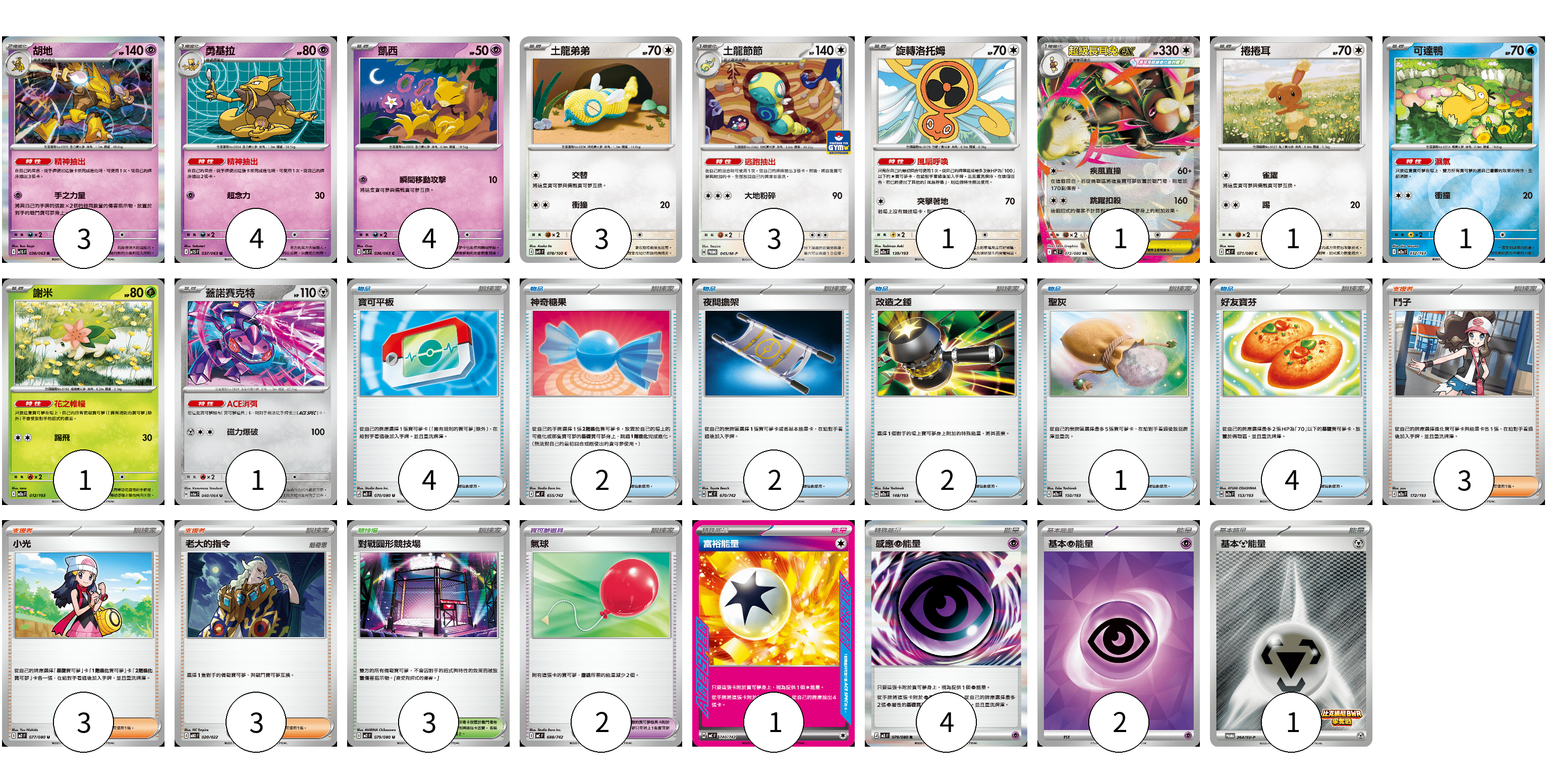 牌組構築方案 以此牌組為基礎新構築牌組 顯示卡面 顯示列表 寶可夢卡(23) 3 4 4 3 3 1 1 1 1 1 1 寶可夢道具(2) 2 物品卡(15) 4 2 2 2 1 4 支援者卡(9) 3 3 3 競技場卡(3) 3 能量卡(8) 1 4 2 1 寶可夢卡(23) 卡牌名稱 張數 卡牌名稱 張數 胡地 M1S 038/063 03 勇基拉 M1S 037/063 04 凱西 M1S 036/063 04 土龍弟弟 SV9 078/100 03 土龍節節 M-P 045/M-P 03 旋轉洛托姆 M2a 139/193 01 超級長耳兔ex M2 072/080 01 捲捲耳 M2 071/080 01 可達鴨 M2a 032/193 01 謝米 M2a 012/193 01 蓋諾賽克特 SV6a 040/064 01 寶可夢道具(2) 卡牌名稱 張數 卡牌名稱 張數 氣球 MC 688/742 02 物品卡(15) 卡牌名稱 張數 卡牌名稱 張數 寶可平板 M3 070/080 04 神奇糖果 MC 655/742 02 夜間擔架 MC 670/742 02 改造之錘 M2a 148/193 02 聖灰 M2a 150/193 01 好友寶芬 M2a 153/193 04 支援者卡(9) 卡牌名稱 張數 卡牌名稱 張數 鬥子 M2a 172/193 03 小光 M2 077/080 03 老大的指令 MBD 020/022 03 競技場卡(3) 卡牌名稱 張數 卡牌名稱 張數 對戰圓形競技場 M2 079/080 03 能量卡(8) 卡牌名稱 張數 卡牌名稱 張數 富裕能量 MC 740/742 01 感應【超】能量 M3 079/080 04 基本【超】能量 SVOD PSY 02 基本【鋼】能量 SV-P 264/SV-P 01 以此牌組為基礎新構築牌組 牌組編碼 cpbdPa-oBXCjX-GAEFrX copy 列印牌組單 牌組編碼已複製 分享至SNS