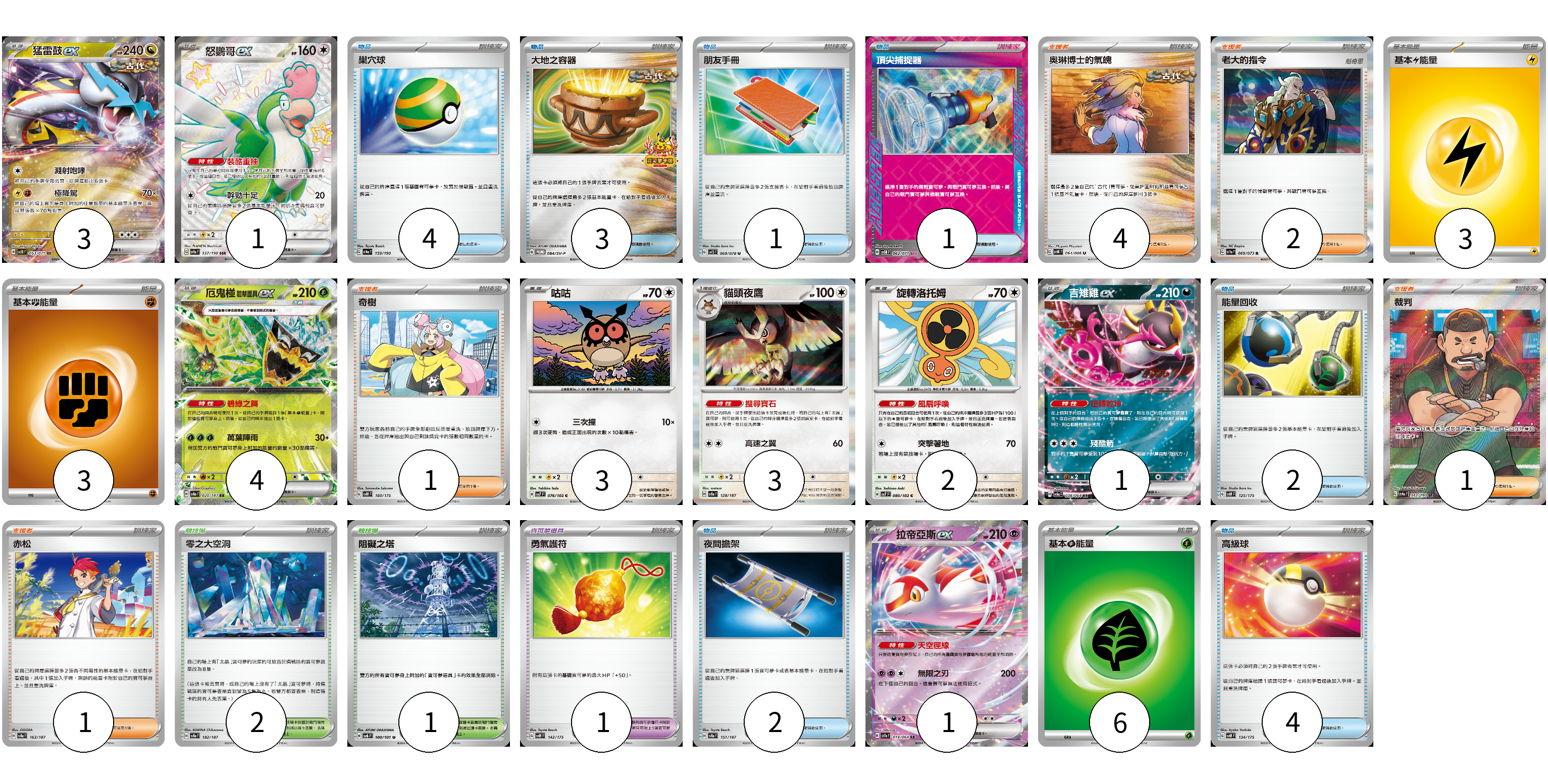 牌組構築方案 以此牌組為基礎新構築牌組 顯示卡面 顯示列表 寶可夢卡(18) 3 1 4 3 3 2 1 1 寶可夢道具(1) 1 物品卡(17) 4 3 1 1 2 2 4 支援者卡(9) 4 2 1 1 1 競技場卡(3) 2 1 能量卡(12) 3 3 6 寶可夢卡(18) 卡牌名稱 張數 卡牌名稱 張數 猛雷鼓ex SV5K 053/071 03 怒鸚哥ex SV4a 337/190 01 厄鬼椪 碧草面具ex SV8a 020/187 04 咕咕 SV7 076/102 03 貓頭夜鷹 SV8a 128/187 03 旋轉洛托姆 SV7 080/102 02 吉雉雞ex SV6a 038/064 01 拉帝亞斯ex SV7a 019/064 01 寶可夢道具(1) 卡牌名稱 張數 卡牌名稱 張數 勇氣護符 SVM 142/175 01 物品卡(17) 卡牌名稱 張數 卡牌名稱 張數 巢穴球 SV4a 159/190 04 大地之容器 SV-P 084/SV-P 03 朋友手冊 SV1S 069/078 01 頂尖捕捉器 SV5M 062/071 01 能量回收 SVM 125/175 02 夜間擔架 SV8a 151/187 02 高級球 SVM 134/175 04 支援者卡(9) 卡牌名稱 張數 卡牌名稱 張數 奧琳博士的氣魄 SV4K 064/066 04 老大的指令 SV1a 069/073 02 奇樹 SVM 160/175 01 裁判 SV4a 342/190 01 赤松 SV8a 163/187 01 競技場卡(3) 卡牌名稱 張數 卡牌名稱 張數 零之大空洞 SV8a 182/187 02 阻礙之塔 SV6 100/101 01 能量卡(12) 卡牌名稱 張數 卡牌名稱 張數 基本【雷】能量 SVHM LIG 03 基本【鬥】能量 SVHK FIG 03 基本【草】能量 SVAM GRA 06 以此牌組為基礎新構築牌組 牌組編碼 cqTNwP-tTmpmI-DceNmO copy 列印牌組單 牌組編碼已複製 分享至SNS