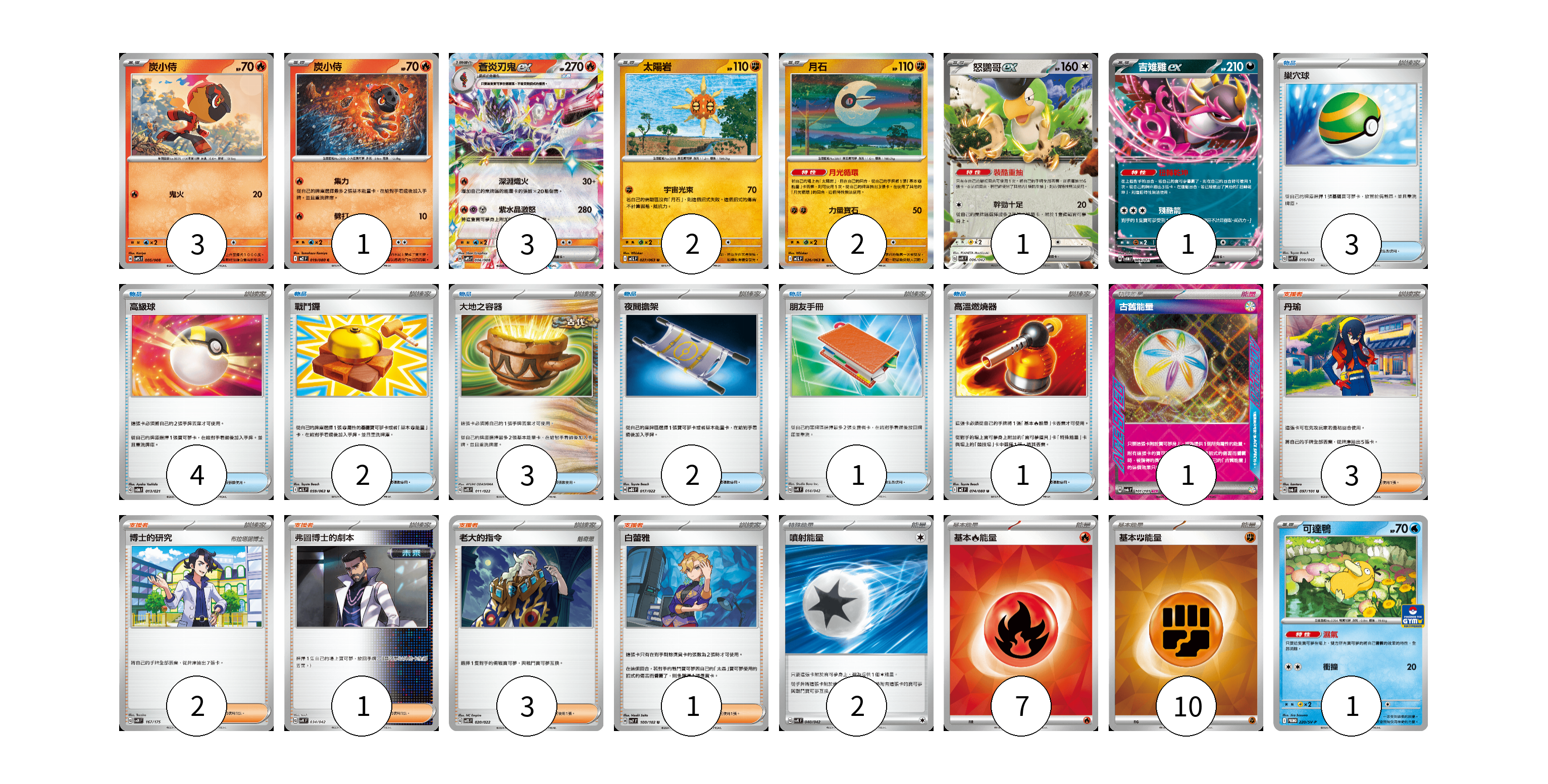 牌組構築方案 以此牌組為基礎新構築牌組 顯示卡面 顯示列表 寶可夢卡(14) 3 1 3 2 2 1 1 1 物品卡(16) 3 4 2 3 2 1 1 支援者卡(10) 3 2 1 3 1 能量卡(20) 1 2 7 10 寶可夢卡(14) 卡牌名稱 張數 卡牌名稱 張數 炭小侍 SVPS 005/008 03 炭小侍 M2 019/080 01 蒼炎刃鬼ex SVPS 006/008 03 太陽岩 M1L 027/063 02 月石 M1L 026/063 02 怒鸚哥ex SVK 006/042 01 吉雉雞ex SVOM 009/021 01 可達鴨 SV-P 220/SV-P 01 物品卡(16) 卡牌名稱 張數 卡牌名稱 張數 巢穴球 SVK 016/042 03 高級球 SVOM 013/021 04 戰鬥鑼 M1L 059/063 02 大地之容器 SVTS 011/022 03 夜間擔架 MBG 017/022 02 朋友手冊 SVK 014/042 01 高溫燃燒器 M2 074/080 01 支援者卡(10) 卡牌名稱 張數 卡牌名稱 張數 丹瑜 SV6 097/101 03 博士的研究 SVM 167/175 02 弗圖博士的劇本 SVK 034/042 01 老大的指令 SVTS 020/022 03 白蕾雅 SV7 100/102 01 能量卡(20) 卡牌名稱 張數 卡牌名稱 張數 古舊能量 SV6 101/101 01 噴射能量 SVK 040/042 02 基本【火】能量 SVK FIR 07 基本【鬥】能量 SVK FIG 10 以此牌組為基礎新構築牌組 牌組編碼 cstCGF-zsfFwC-QpFTMv copy 列印牌組單 牌組編碼已複製 分享至SNS