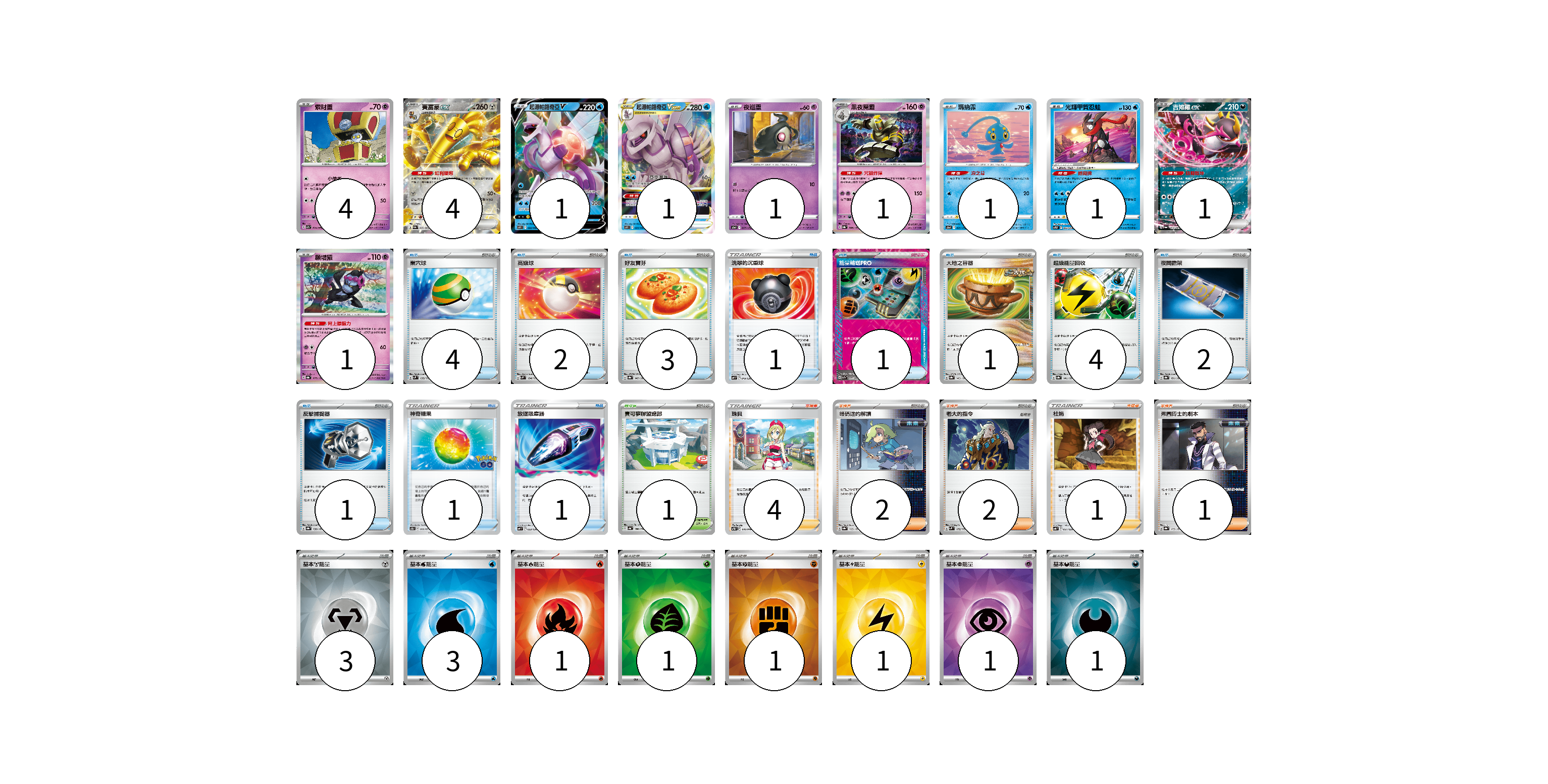 牌組構築方案 以此牌組為基礎新構築牌組 顯示卡面 顯示列表 寶可夢卡(16) 4 4 1 1 1 1 1 1 1 1 物品卡(21) 4 2 3 1 1 1 4 2 1 1 1 支援者卡(10) 4 2 2 1 1 競技場卡(1) 1 能量卡(12) 3 3 1 1 1 1 1 1 寶可夢卡(16) 卡牌名稱 張數 卡牌名稱 張數 索財靈 SV7a 024/064 04 賽富豪ex SV3a 050/062 04 起源帕路奇亞V S10P 022/067 01 起源帕路奇亞VSTAR S10P 023/067 01 夜巡靈 S12a 057/172 01 黑夜魔靈 SV8a 066/187 01 瑪納霏 S12a 029/172 01 光輝甲賀忍蛙 SVTG 002/019 01 吉雉雞ex SV6a 038/064 01 願增猿 SV8a 075/187 01 物品卡(21) 卡牌名稱 張數 卡牌名稱 張數 巢穴球 SVM 133/175 04 高級球 SVM 134/175 02 好友寶芬 SV8a 147/187 03 洗翠的沉重球 SVF 019/038 01 能量輸送PRO SV7a 052/064 01 大地之容器 SV8a 143/187 01 超級能量回收 SV8a 141/187 04 夜間擔架 SV8a 151/187 02 反擊捕捉器 SV8a 139/187 01 神奇糖果 S10b 066/071 01 放逐吸塵器 SVF 023/038 01 支援者卡(10) 卡牌名稱 張數 卡牌名稱 張數 珠貝 SVTG 016/019 04 暗碼迷的解讀 SV8a 165/187 02 老大的指令 SVM 172/175 02 杜娟 SVB 021/028 01 弗圖博士的劇本 SV8a 175/187 01 競技場卡(1) 卡牌名稱 張數 卡牌名稱 張數 寶可夢聯盟總部 SV4a 186/190 01 能量卡(12) 卡牌名稱 張數 卡牌名稱 張數 基本【鋼】能量 SVK MET 03 基本【水】能量 SVK WAT 03 基本【火】能量 SVK FIR 01 基本【草】能量 SVK GRA 01 基本【鬥】能量 SVK FIG 01 基本【雷】能量 SVK LIG 01 基本【超】能量 SVK PSY 01 基本【惡】能量 SVK DAR 01 以此牌組為基礎新構築牌組 牌組編碼 ctRKeK-jQRbbN-mvraJc copy 列印牌組單 牌組編碼已複製 分享至SNS
