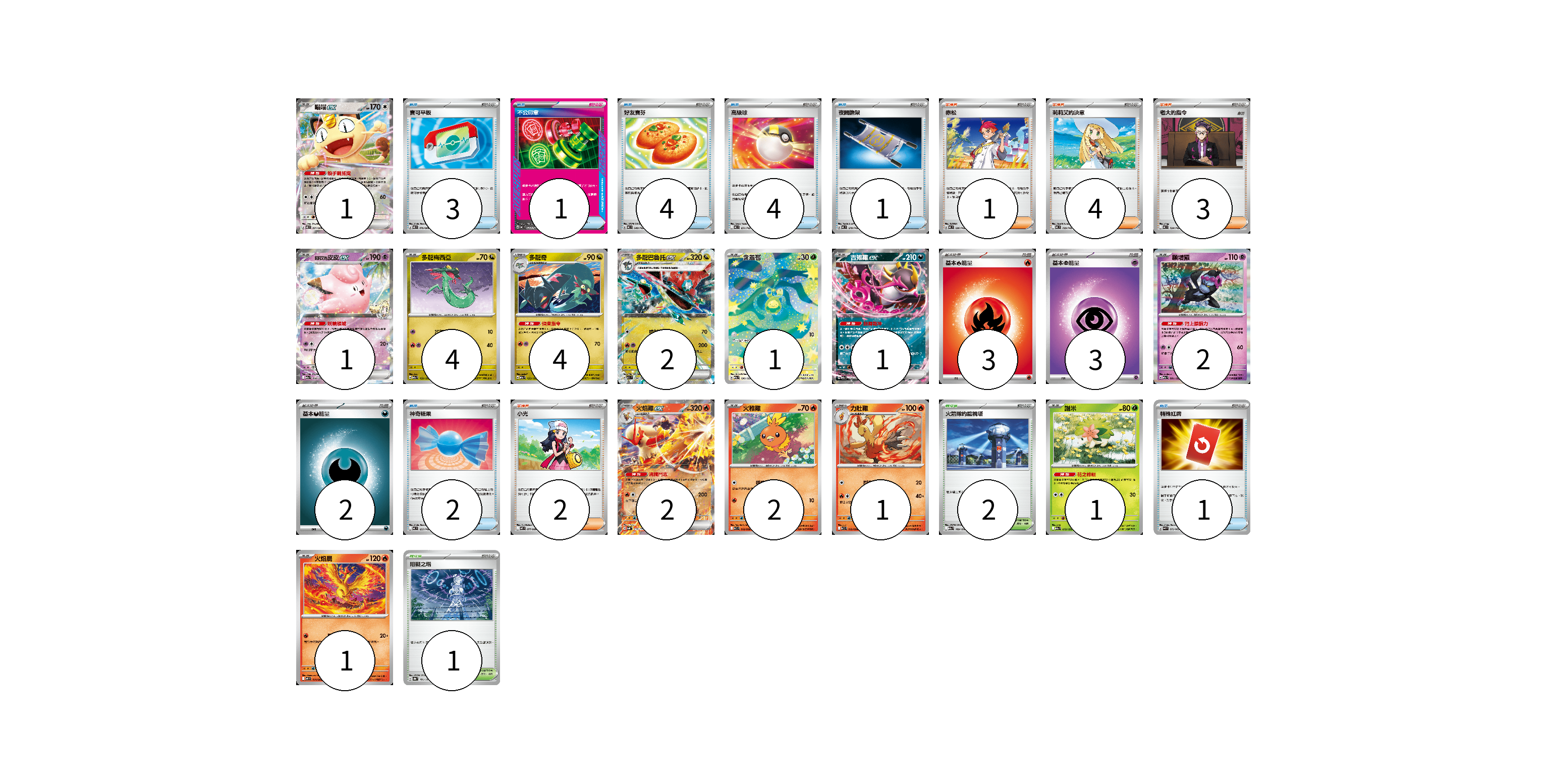 牌組構築方案 以此牌組為基礎新構築牌組 顯示卡面 顯示列表 寶可夢卡(23) 1 1 4 4 2 1 1 2 2 2 1 1 1 物品卡(16) 3 1 4 4 1 2 1 支援者卡(10) 1 4 3 2 競技場卡(3) 2 1 能量卡(8) 3 3 2 寶可夢卡(23) 卡牌名稱 張數 卡牌名稱 張數 喵喵ex M3 061/080 01 莉莉艾的皮皮ex M2a 060/193 01 多龍梅西亞 M2a 132/193 04 多龍奇 M2a 133/193 04 多龍巴魯托ex M2a 134/193 02 含羞苞 M2a 196/193 01 吉雉雞ex M2a 114/193 01 願增猿 M2a 081/193 02 火焰雞ex SVM 016/175 02 火稚雞 SV10 018/098 02 力壯雞 SV10 019/098 01 謝米 M2a 012/193 01 火焰鳥 M2 014/080 01 物品卡(16) 卡牌名稱 張數 卡牌名稱 張數 寶可平板 M3 070/080 03 不公印章 MC 633/742 01 好友寶芬 MC 648/742 04 高級球 MC 651/742 04 夜間擔架 MC 670/742 01 神奇糖果 MC 655/742 02 特殊紅牌 M4 072/083 01 支援者卡(10) 卡牌名稱 張數 卡牌名稱 張數 赤松 MC 696/742 01 莉莉艾的決意 MC 729/742 04 老大的指令 MC 724/742 03 小光 M2 077/080 02 競技場卡(3) 卡牌名稱 張數 卡牌名稱 張數 火箭隊的監視塔 M2a 189/193 02 阻礙之塔 SV8a 181/187 01 能量卡(8) 卡牌名稱 張數 卡牌名稱 張數 基本【火】能量 MC FIR 03 基本【超】能量 MC PSY 03 基本【惡】能量 MC DAR 02 以此牌組為基礎新構築牌組 牌組編碼 cuPtRd-MLtPRn-GKAlfi copy 列印牌組單 牌組編碼已複製 分享至SNS