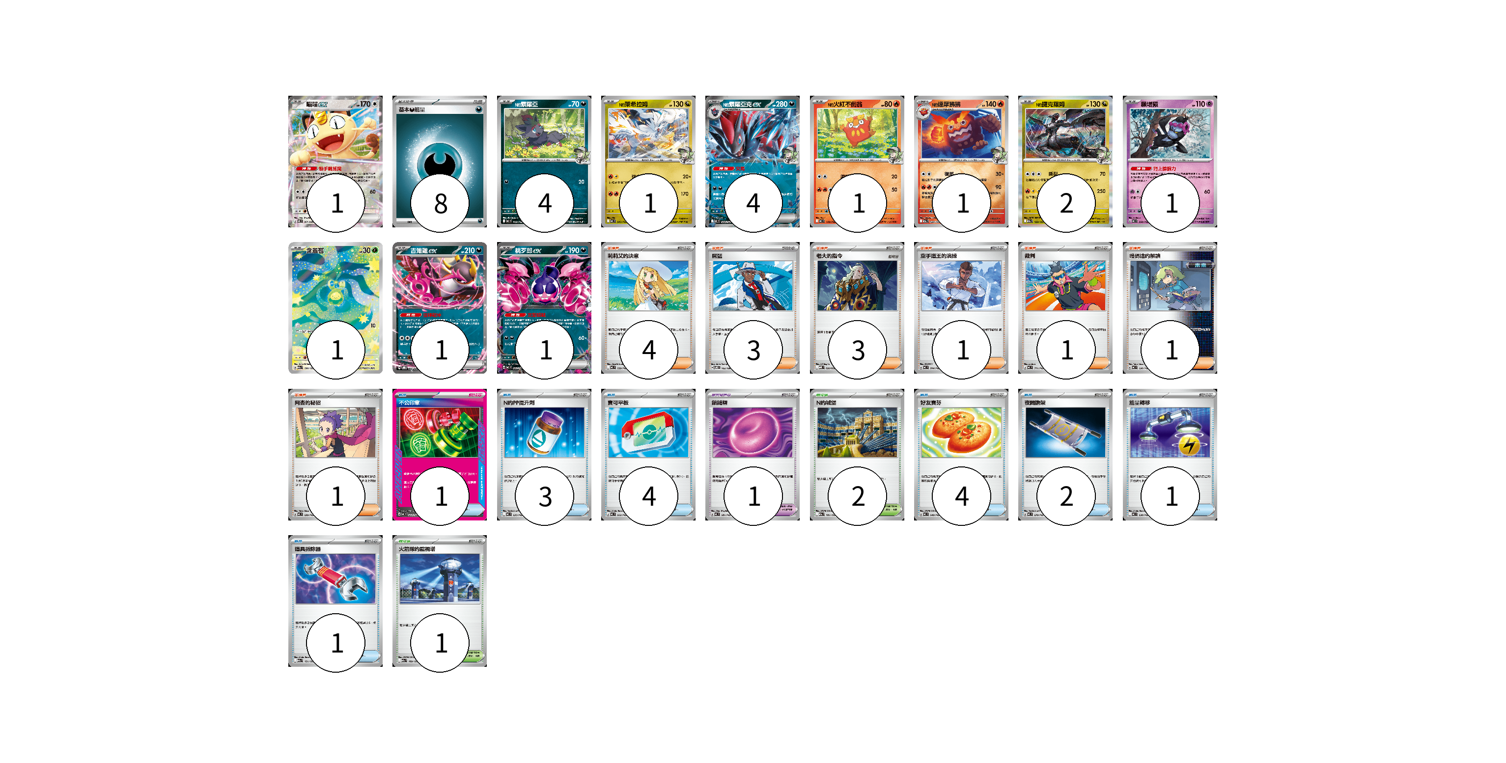 牌組構築方案 以此牌組為基礎新構築牌組 顯示卡面 顯示列表 寶可夢卡(18) 1 4 1 4 1 1 2 1 1 1 1 寶可夢道具(1) 1 物品卡(16) 1 3 4 4 2 1 1 支援者卡(14) 4 3 3 1 1 1 1 競技場卡(3) 2 1 能量卡(8) 8 寶可夢卡(18) 卡牌名稱 張數 卡牌名稱 張數 喵喵ex M3 061/080 01 N的索羅亞 MC 469/742 04 N的萊希拉姆 MC 545/742 01 N的索羅亞克ex MC 470/742 04 N的火紅不倒翁 MC 118/742 01 N的達摩狒狒 M2a 028/193 01 N的捷克羅姆 M2a 129/193 02 願增猿 MC 358/742 01 含羞苞 M2a 196/193 01 吉雉雞ex SVOD 004/020 01 桃歹郎ex MC 491/742 01 寶可夢道具(1) 卡牌名稱 張數 卡牌名稱 張數 鎖鏈糬 MC 681/742 01 物品卡(16) 卡牌名稱 張數 卡牌名稱 張數 不公印章 MC 633/742 01 N的PP提升劑 MC 635/742 03 寶可平板 MC 662/742 04 好友寶芬 MC 648/742 04 夜間擔架 MC 670/742 02 能量轉移 MC 638/742 01 道具拆除器 M2a 151/193 01 支援者卡(14) 卡牌名稱 張數 卡牌名稱 張數 莉莉艾的決意 MC 729/742 04 席藍 SV8 102/106 03 老大的指令 MBD 020/022 03 空手道王的演練 MC 704/742 01 裁判 MC 711/742 01 暗碼迷的解讀 MC 698/742 01 阿杏的秘招 MC 699/742 01 競技場卡(3) 卡牌名稱 張數 卡牌名稱 張數 N的城堡 M2a 181/193 02 火箭隊的監視塔 M2a 189/193 01 能量卡(8) 卡牌名稱 張數 卡牌名稱 張數 基本【惡】能量 MC DAR 08 以此牌組為基礎新構築牌組 牌組編碼 dDFqAH-MAiLcA-UYESEB copy 列印牌組單 牌組編碼已複製 分享至SNS