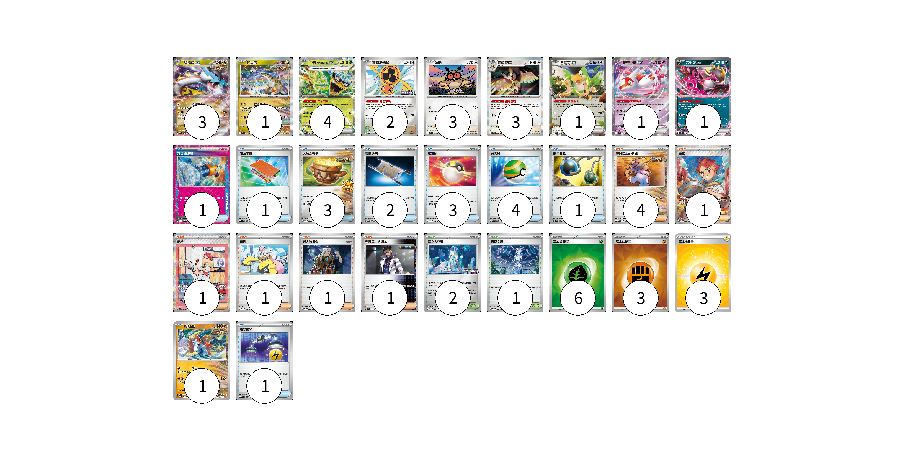 牌組構築方案 以此牌組為基礎新構築牌組 顯示卡面 顯示列表 寶可夢卡(20) 3 1 4 2 3 3 1 1 1 1 物品卡(16) 1 1 3 2 3 4 1 1 支援者卡(9) 4 1 1 1 1 1 競技場卡(3) 2 1 能量卡(12) 6 3 3 寶可夢卡(20) 卡牌名稱 張數 卡牌名稱 張數 猛雷鼓ex SV5K 053/071 03 猛雷鼓 SV7 075/102 01 厄鬼椪 碧草面具ex SV8a 020/187 04 旋轉洛托姆 SV-P 146/SV-P 02 咕咕 SV7 076/102 03 貓頭夜鷹 SV7 077/102 03 怒鸚哥ex SVK 006/042 01 拉帝亞斯ex SV7a 019/064 01 吉雉雞ex SVOM 009/021 01 爬地翅 SV4K 041/066 01 物品卡(16) 卡牌名稱 張數 卡牌名稱 張數 頂尖捕捉器 SV5M 062/071 01 朋友手冊 SV1S 069/078 01 大地之容器 SV-P 084/SV-P 03 夜間擔架 SV8a 151/187 02 高級球 SVOM 013/021 03 巢穴球 SVK 016/042 04 能量回收 SVM 125/175 01 能量轉移 SVK 008/042 01 支援者卡(9) 卡牌名稱 張數 卡牌名稱 張數 奧琳博士的氣魄 SVHK 017/022 04 赤松 SV7 123/102 01 赤松 SV8a 227/187 01 奇樹 SVOM 018/021 01 老大的指令 SVOM 020/021 01 弗圖博士的劇本 SVK 034/042 01 競技場卡(3) 卡牌名稱 張數 卡牌名稱 張數 零之大空洞 SV-P 151/SV-P 02 阻礙之塔 SV6 100/101 01 能量卡(12) 卡牌名稱 張數 卡牌名稱 張數 基本【草】能量 SVK GRA 06 基本【鬥】能量 SVK FIG 03 基本【雷】能量 SI LIG 03 以此牌組為基礎新構築牌組 牌組編碼 dDzqmA-LkomVh-AojGYX copy 列印牌組單 牌組編碼已複製 分享至SNS