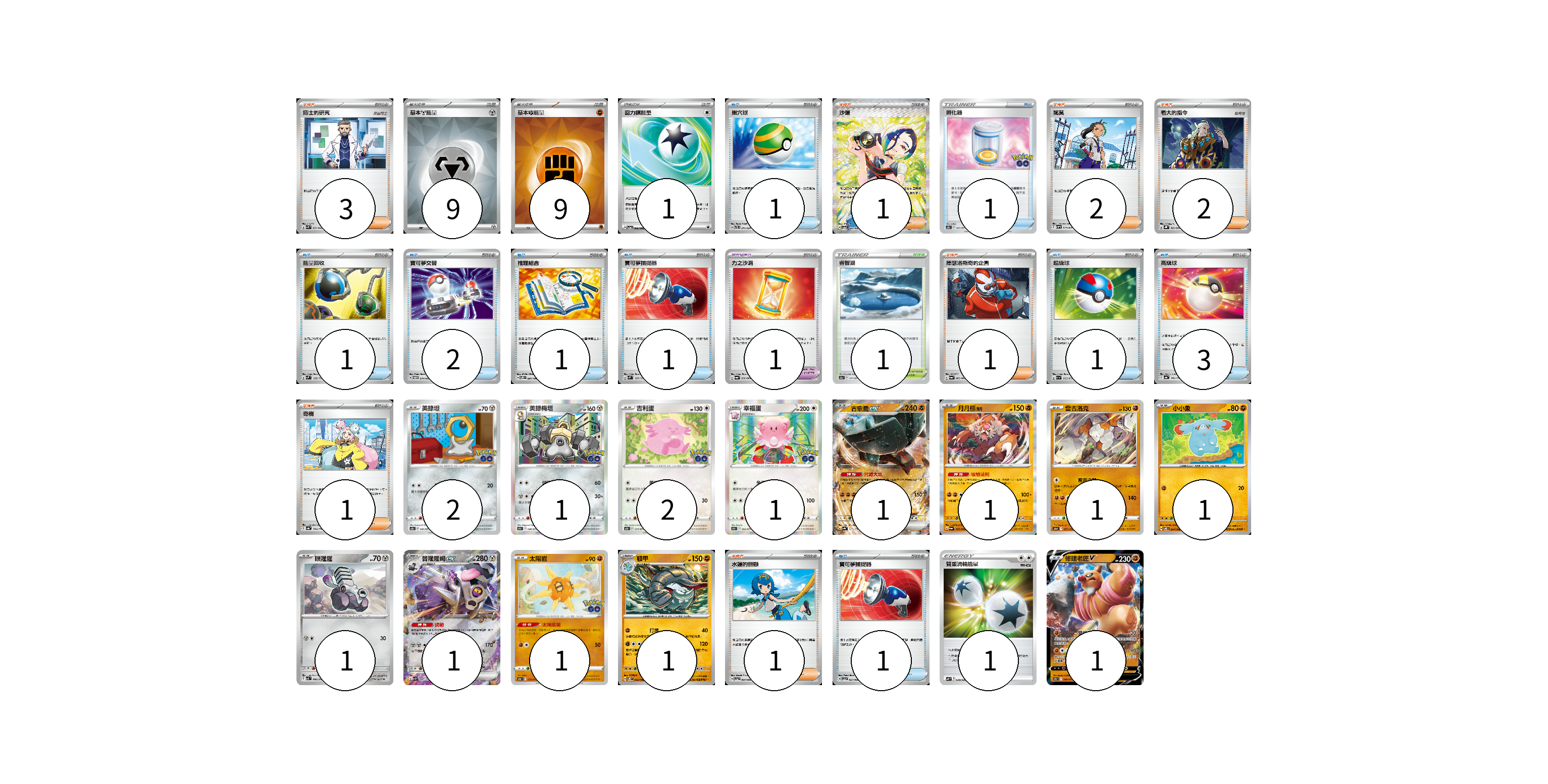 牌組構築方案 以此牌組為基礎新構築牌組 顯示卡面 顯示列表 寶可夢卡(15) 2 1 2 1 1 1 1 1 1 1 1 1 1 寶可夢道具(1) 1 物品卡(12) 1 1 1 2 1 1 1 3 1 支援者卡(11) 3 1 2 2 1 1 1 競技場卡(1) 1 能量卡(20) 9 9 1 1 寶可夢卡(15) 卡牌名稱 張數 卡牌名稱 張數 美錄坦 S10b 045/071 02 美錄梅塔 S10b 046/071 01 吉利蛋 S10b 051/071 02 幸福蛋 S10b 052/071 01 古鼎鹿ex SV4a 113/190 01 月月熊 赫月 SV6a 025/064 01 雷吉洛克 S12a 075/172 01 小小象 SV8 064/106 01 噗隆隆 SV3 084/108 01 普隆隆姆ex SV3 085/108 01 太陽岩 S10b 039/071 01 頓甲 SV8 065/106 01 修建老匠V S10b 040/071 01 寶可夢道具(1) 卡牌名稱 張數 卡牌名稱 張數 力之沙漏 SV6a 058/064 01 物品卡(12) 卡牌名稱 張數 卡牌名稱 張數 巢穴球 SVTL 011/021 01 孵化器 S10b 065/071 01 能量回收 SVM 125/175 01 寶可夢交替 SVTM 014/022 02 推理組合 SV8 094/106 01 寶可夢捕捉器 SVM 137/175 01 超級球 SV1a 065/073 01 高級球 SV4a 161/190 03 寶可夢捕捉器 SV5a 057/066 01 支援者卡(11) 卡牌名稱 張數 卡牌名稱 張數 博士的研究 SVK 033/042 03 沙儷 SV5a 092/066 01 妮莫 SVHM 019/022 02 老大的指令 SVHK 022/022 02 庫瑟洛斯奇的企圖 SV6a 062/064 01 奇樹 SV4a 174/190 01 水蓮的照顧 SV5a 064/066 01 競技場卡(1) 卡牌名稱 張數 卡牌名稱 張數 睿智湖 S10a 071/071 01 能量卡(20) 卡牌名稱 張數 卡牌名稱 張數 基本【鋼】能量 SVK MET 09 基本【鬥】能量 SVK FIG 09 回力鏢能量 SV5a 066/066 01 雙重渦輪能量 SVF 038/038 01 以此牌組為基礎新構築牌組 牌組編碼 dFLVRZ-VdKyOx-MOkdbd copy 列印牌組單 牌組編碼已複製 分享至SNS