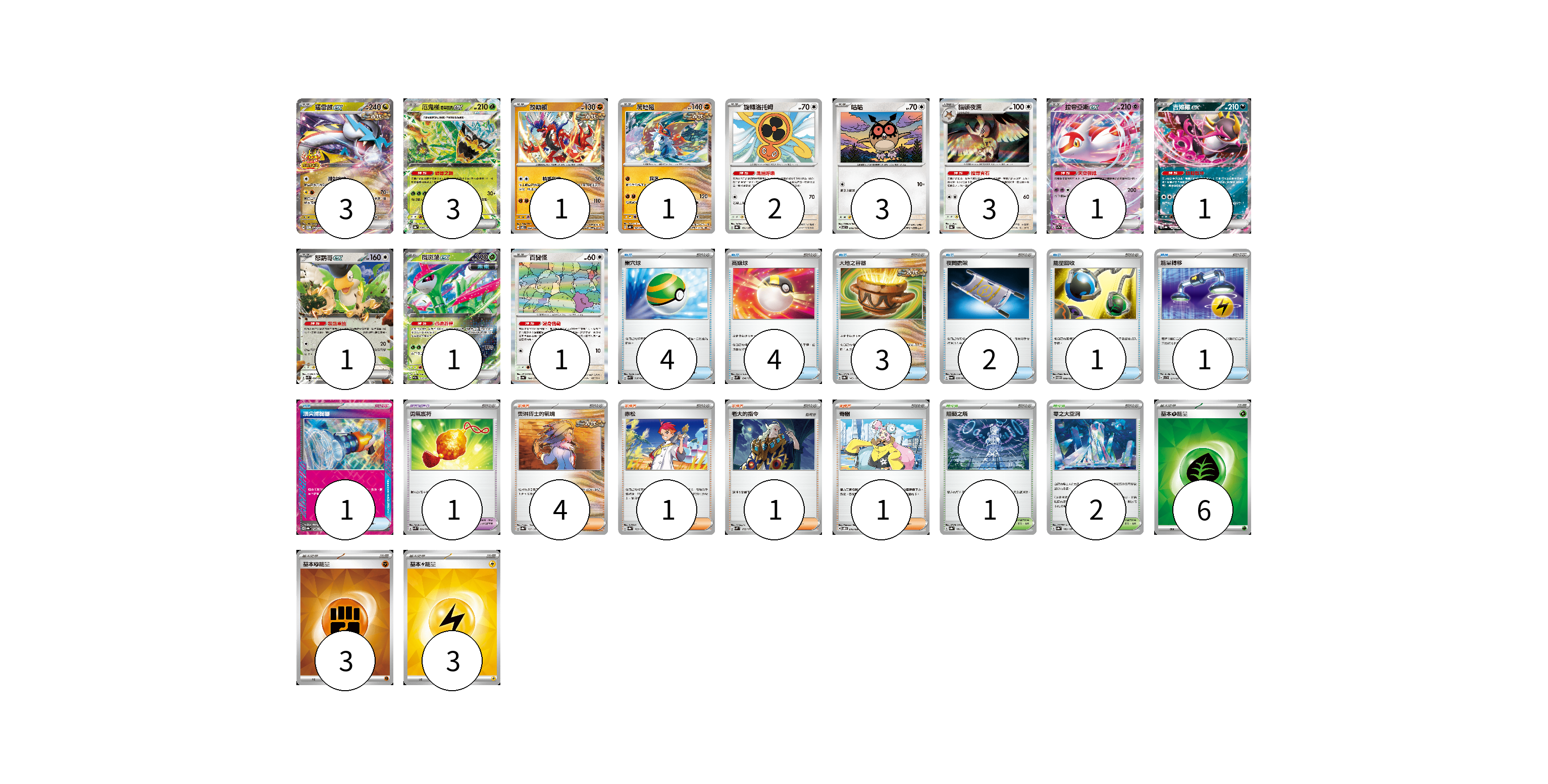 牌組構築方案 以此牌組為基礎新構築牌組 顯示卡面 顯示列表 寶可夢卡(21) 3 3 1 1 2 3 3 1 1 1 1 1 寶可夢道具(1) 1 物品卡(16) 4 4 3 2 1 1 1 支援者卡(7) 4 1 1 1 競技場卡(3) 1 2 能量卡(12) 6 3 3 寶可夢卡(21) 卡牌名稱 張數 卡牌名稱 張數 猛雷鼓ex SV-P 081/SV-P 03 厄鬼椪 碧草面具ex SV8a 020/187 03 故勒頓 SV8 069/106 01 爬地翅 SV4K 041/066 01 旋轉洛托姆 SV8a 131/187 02 咕咕 SV7 076/102 03 貓頭夜鷹 SV8a 128/187 03 拉帝亞斯ex SV7a 019/064 01 吉雉雞ex SV8a 104/187 01 怒鸚哥ex SVK 006/042 01 鐵斑葉ex SV5M 016/071 01 百變怪 SV4a 144/190 01 寶可夢道具(1) 卡牌名稱 張數 卡牌名稱 張數 勇氣護符 SVK 024/042 01 物品卡(16) 卡牌名稱 張數 卡牌名稱 張數 巢穴球 SVK 016/042 04 高級球 SVM 134/175 04 大地之容器 SV8a 143/187 03 夜間擔架 SV6a 056/064 02 能量回收 SVTM 009/022 01 能量轉移 SVC 011/021 01 頂尖捕捉器 SV8a 148/187 01 支援者卡(7) 卡牌名稱 張數 卡牌名稱 張數 奧琳博士的氣魄 SV8a 167/187 04 赤松 SV8a 163/187 01 老大的指令 SVM 172/175 01 奇樹 SVOD 016/020 01 競技場卡(3) 卡牌名稱 張數 卡牌名稱 張數 阻礙之塔 SV8a 181/187 01 零之大空洞 SV8a 182/187 02 能量卡(12) 卡牌名稱 張數 卡牌名稱 張數 基本【草】能量 SVK GRA 06 基本【鬥】能量 SVK FIG 03 基本【雷】能量 SVK LIG 03 以此牌組為基礎新構築牌組 牌組編碼 dFQGwS-xSsIPq-DHDrqz copy 列印牌組單 牌組編碼已複製 分享至SNS