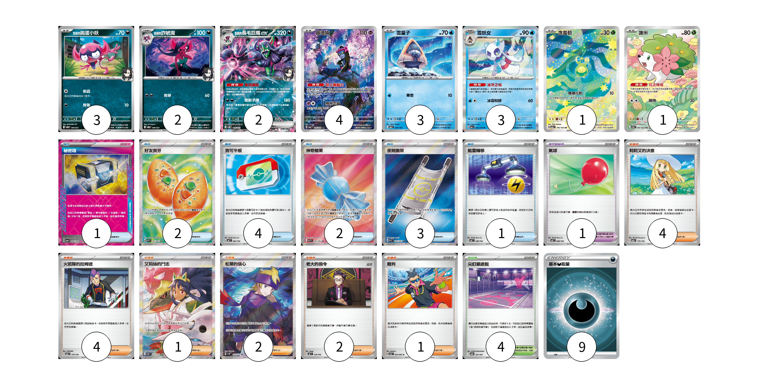 牌組構築方案 以此牌組為基礎新構築牌組 顯示卡面 顯示列表 寶可夢卡(19) 3 2 2 4 3 3 1 1 寶可夢道具(1) 1 物品卡(13) 1 2 4 2 3 1 支援者卡(14) 4 4 1 2 2 1 競技場卡(4) 4 能量卡(9) 9 寶可夢卡(19) 卡牌名稱 張數 卡牌名稱 張數 <瑪俐的>搗蛋小妖 SVOM 005/021 03 <瑪俐的>詐唬魔 SVOM 006/021 02 <瑪俐的>長毛巨魔ex SVOM 007/021 02 願增猿 SV6 107/101 04 雪童子 M2a 035/193 03 雪妖女 SV6 033/101 03 含羞苞 M2a 196/193 01 謝米 SV9a 066/063 01 寶可夢道具(1) 卡牌名稱 張數 卡牌名稱 張數 氣球 MC 688/742 01 物品卡(13) 卡牌名稱 張數 卡牌名稱 張數 秘密箱 SV6 092/101 01 好友寶芬 M1S 081/063 02 寶可平板 MC 662/742 04 神奇糖果 M1S 082/063 02 夜間擔架 M1L 083/063 03 能量轉移 MC 638/742 01 支援者卡(14) 卡牌名稱 張數 卡牌名稱 張數 莉莉艾的決意 M2a 175/193 04 火箭隊的拉姆達 M2a 179/193 04 艾莉絲的鬥志 M2a 247/193 01 松葉的信心 SV5K 092/071 02 老大的指令 MC 724/742 02 裁判 SV9a 062/063 01 競技場卡(4) 卡牌名稱 張數 卡牌名稱 張數 尖釘鎮道館 SVOM 021/021 04 能量卡(9) 卡牌名稱 張數 卡牌名稱 張數 基本惡能量 SLD DAR 09 以此牌組為基礎新構築牌組 牌組編碼 dHjgfe-WURflm-leBffB copy 列印牌組單 牌組編碼已複製 分享至SNS