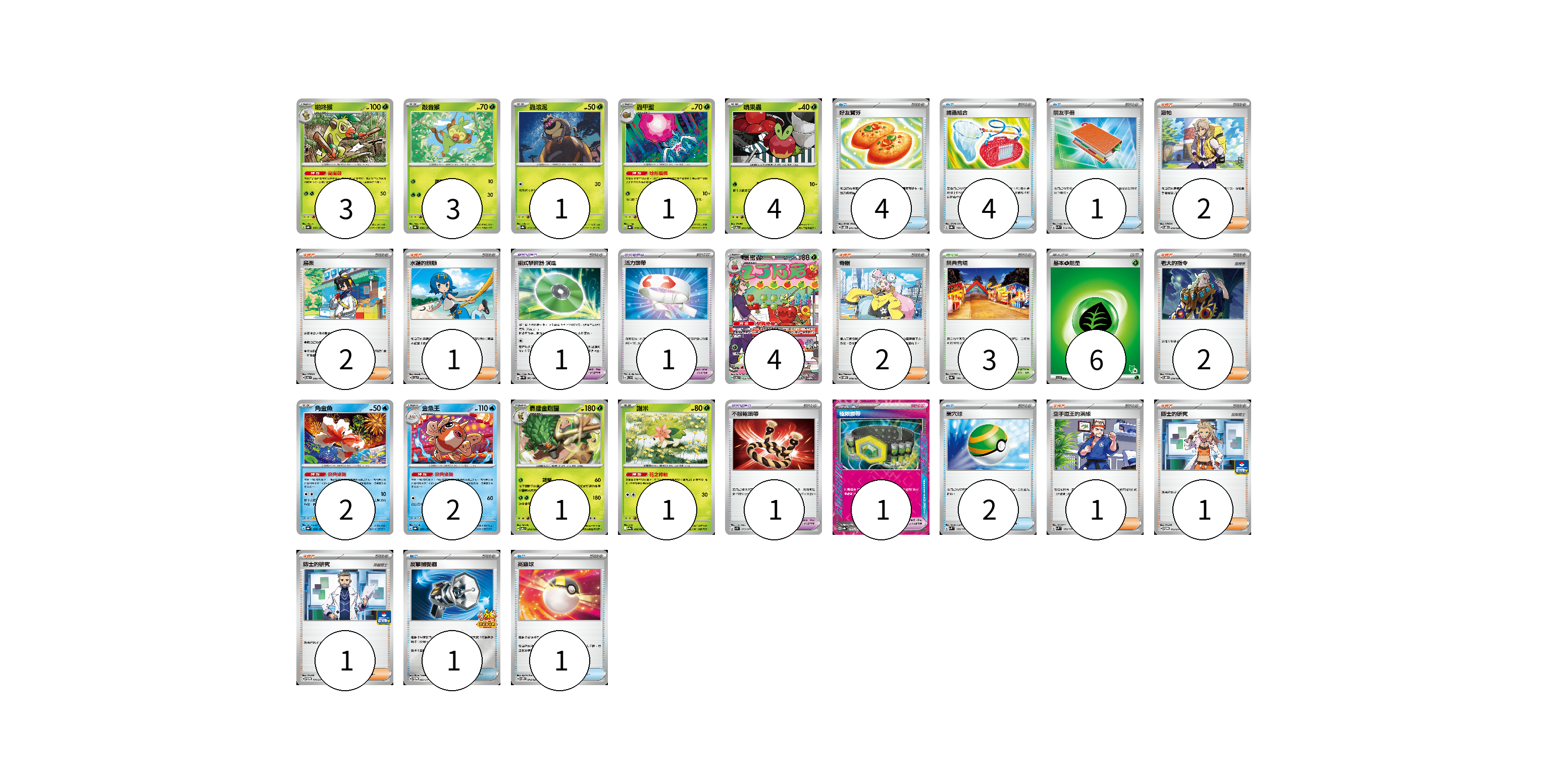 牌組構築方案 以此牌組為基礎新構築牌組 顯示卡面 顯示列表 寶可夢卡(22) 3 3 1 1 4 4 2 2 1 1 寶可夢道具(4) 1 1 1 1 物品卡(13) 4 4 1 2 1 1 支援者卡(12) 2 2 1 2 2 1 1 1 競技場卡(3) 3 能量卡(6) 6 寶可夢卡(22) 卡牌名稱 張數 卡牌名稱 張數 啪咚猴 SV8a 007/187 03 敲音猴 SV8a 006/187 03 蟲滾泥 SV8a 013/187 01 蟲甲聖 SV8a 014/187 01 啃果蟲 SV6 011/101 04 裹蜜蟲 SV6 103/101 04 角金魚 SV8a 028/187 02 金魚王 SV8a 029/187 02 轟擂金剛猩 SV6 010/101 01 謝米 SV9a 006/063 01 寶可夢道具(4) 卡牌名稱 張數 卡牌名稱 張數 招式學習器 演進 SV4M 063/066 01 活力頭帶 SVD 125/139 01 不服輸頭帶 SV1S 073/078 01 極限腰帶 SV8a 159/187 01 物品卡(13) 卡牌名稱 張數 卡牌名稱 張數 好友寶芬 SVOD 011/020 04 捕蟲組合 SV8a 150/187 04 朋友手冊 SVK 014/042 01 巢穴球 SVM 133/175 02 反擊捕捉器 SV-P 083/SV-P 01 高級球 SVOM 013/021 01 支援者卡(12) 卡牌名稱 張數 卡牌名稱 張數 派帕 SVOD 018/020 02 烏栗 SV6 096/101 02 水蓮的照顧 SV5a 064/066 01 奇樹 SVOM 018/021 02 老大的指令 SVOD 019/020 02 空手道王的演練 SVM 150/175 01 博士的研究 SV-P 113/SV-P 01 博士的研究 SV-P 114/SV-P 01 競技場卡(3) 卡牌名稱 張數 卡牌名稱 張數 祭典會場 SV8a 180/187 03 能量卡(6) 卡牌名稱 張數 卡牌名稱 張數 基本【草】能量 SVI GRA 06 以此牌組為基礎新構築牌組 牌組編碼 dHjqIK-NEayaY-kJhjAO copy 列印牌組單 牌組編碼已複製 分享至SNS