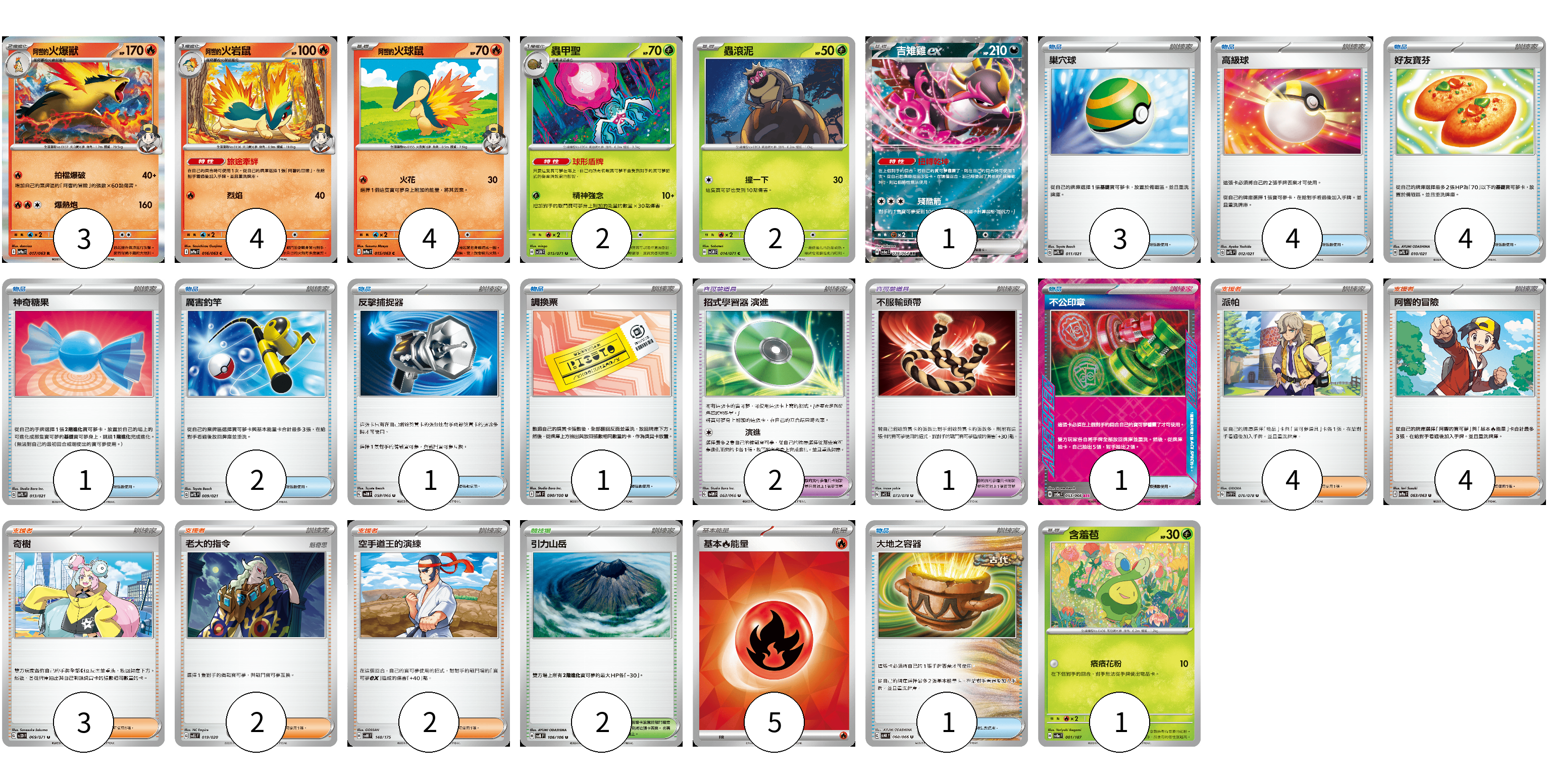 牌組構築方案 以此牌組為基礎新構築牌組 顯示卡面 顯示列表 寶可夢卡(17) 3 4 4 2 2 1 1 寶可夢道具(3) 2 1 物品卡(18) 3 4 4 1 2 1 1 1 1 支援者卡(15) 4 4 3 2 2 競技場卡(2) 2 能量卡(5) 5 寶可夢卡(17) 卡牌名稱 張數 卡牌名稱 張數 <阿響的>火爆獸 SV9a 017/063 03 <阿響的>火岩鼠 SV9a 016/063 04 <阿響的>火球鼠 SV9a 015/063 04 蟲甲聖 SV5M 015/071 02 蟲滾泥 SV5M 014/071 02 吉雉雞ex SV6a 038/064 01 含羞苞 SV8a 001/187 01 寶可夢道具(3) 卡牌名稱 張數 卡牌名稱 張數 招式學習器 演進 SV4M 063/066 02 不服輸頭帶 SV1S 073/078 01 物品卡(18) 卡牌名稱 張數 卡牌名稱 張數 巢穴球 SVTL 011/021 03 高級球 SVTL 012/021 04 好友寶芬 SVTL 010/021 04 神奇糖果 SVTL 013/021 01 厲害釣竿 SVTL 009/021 02 反擊捕捉器 SV4M 059/066 01 調換票 SV9 090/100 01 不公印章 SV5a 053/066 01 大地之容器 SV4K 060/066 01 支援者卡(15) 卡牌名稱 張數 卡牌名稱 張數 派帕 SV1V 076/078 04 阿響的冒險 SV9a 063/063 04 奇樹 SV2D 069/071 03 老大的指令 SVEL 019/020 02 空手道王的演練 SVM 148/175 02 競技場卡(2) 卡牌名稱 張數 卡牌名稱 張數 引力山岳 SV8 106/106 02 能量卡(5) 卡牌名稱 張數 卡牌名稱 張數 基本【火】能量 SVK FIR 05 以此牌組為基礎新構築牌組 牌組編碼 dIBusA-qalpfN-NvGJYB copy 列印牌組單 牌組編碼已複製 分享至SNS