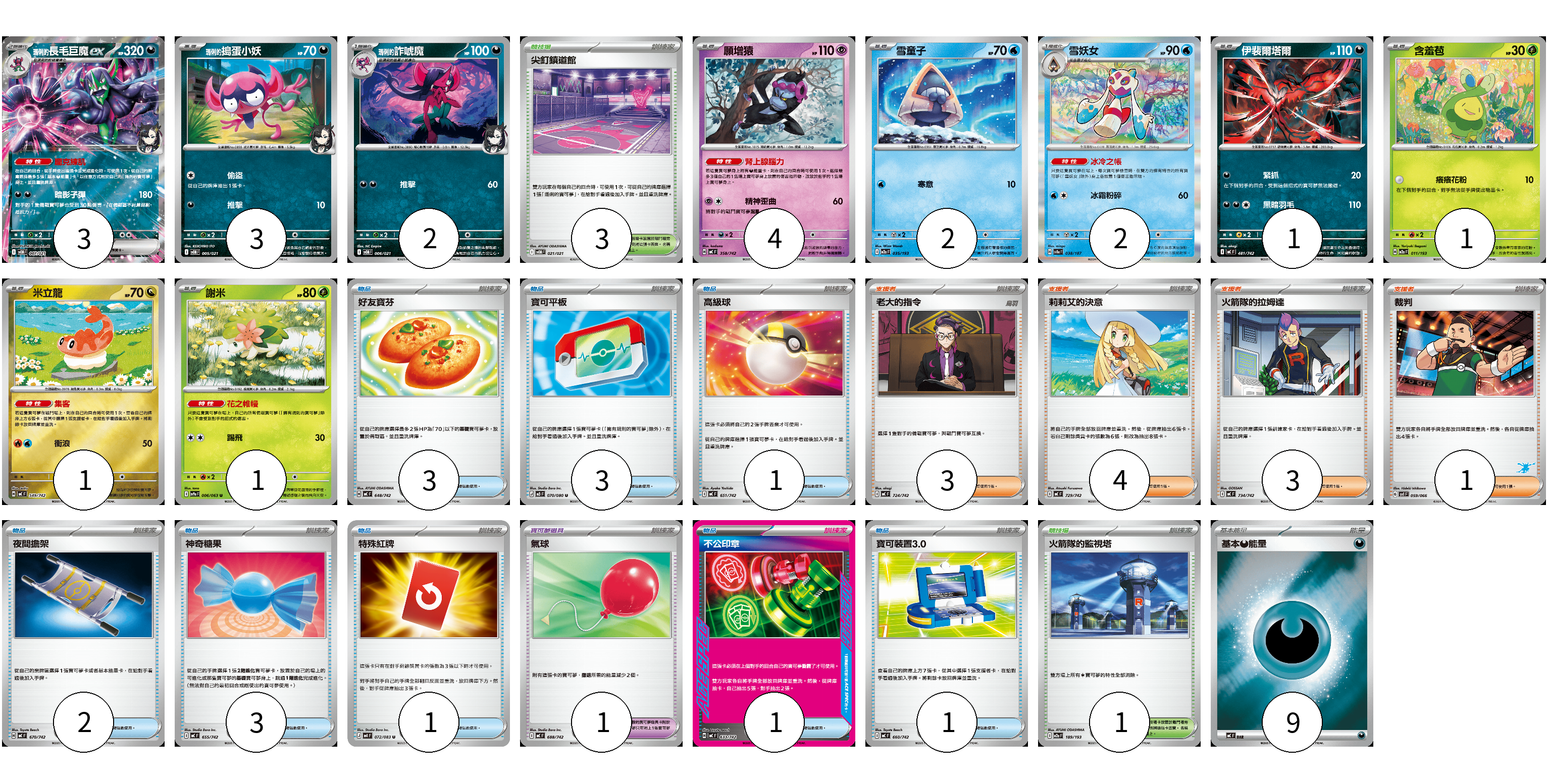 牌組構築方案 以此牌組為基礎新構築牌組 顯示卡面 顯示列表 寶可夢卡(20) 3 3 2 4 2 2 1 1 1 1 寶可夢道具(1) 1 物品卡(15) 3 3 1 2 3 1 1 1 支援者卡(11) 3 4 3 1 競技場卡(4) 3 1 能量卡(9) 9 寶可夢卡(20) 卡牌名稱 張數 卡牌名稱 張數 <瑪俐的>長毛巨魔ex SVOM 007/021 03 <瑪俐的>搗蛋小妖 SVOM 005/021 03 <瑪俐的>詐唬魔 SVOM 006/021 02 願增猿 MC 358/742 04 雪童子 M2a 035/193 02 雪妖女 SV8a 038/187 02 伊裴爾塔爾 MC 481/742 01 含羞苞 M2a 011/193 01 米立龍 MC 549/742 01 謝米 SV9a 006/063 01 寶可夢道具(1) 卡牌名稱 張數 卡牌名稱 張數 氣球 MC 688/742 01 物品卡(15) 卡牌名稱 張數 卡牌名稱 張數 好友寶芬 MC 648/742 03 寶可平板 M3 070/080 03 高級球 MC 651/742 01 夜間擔架 MC 670/742 02 神奇糖果 MC 655/742 03 特殊紅牌 M4 072/083 01 不公印章 MC 633/742 01 寶可裝置3.0 MC 660/742 01 支援者卡(11) 卡牌名稱 張數 卡牌名稱 張數 老大的指令 MC 724/742 03 莉莉艾的決意 MC 729/742 04 火箭隊的拉姆達 MC 734/742 03 裁判 SVI 059/066 01 競技場卡(4) 卡牌名稱 張數 卡牌名稱 張數 尖釘鎮道館 SVOM 021/021 03 火箭隊的監視塔 M2a 189/193 01 能量卡(9) 卡牌名稱 張數 卡牌名稱 張數 基本【惡】能量 MC DAR 09 以此牌組為基礎新構築牌組 牌組編碼 dLBCqM-oPuyhk-WoPwsV copy 列印牌組單 牌組編碼已複製 分享至SNS