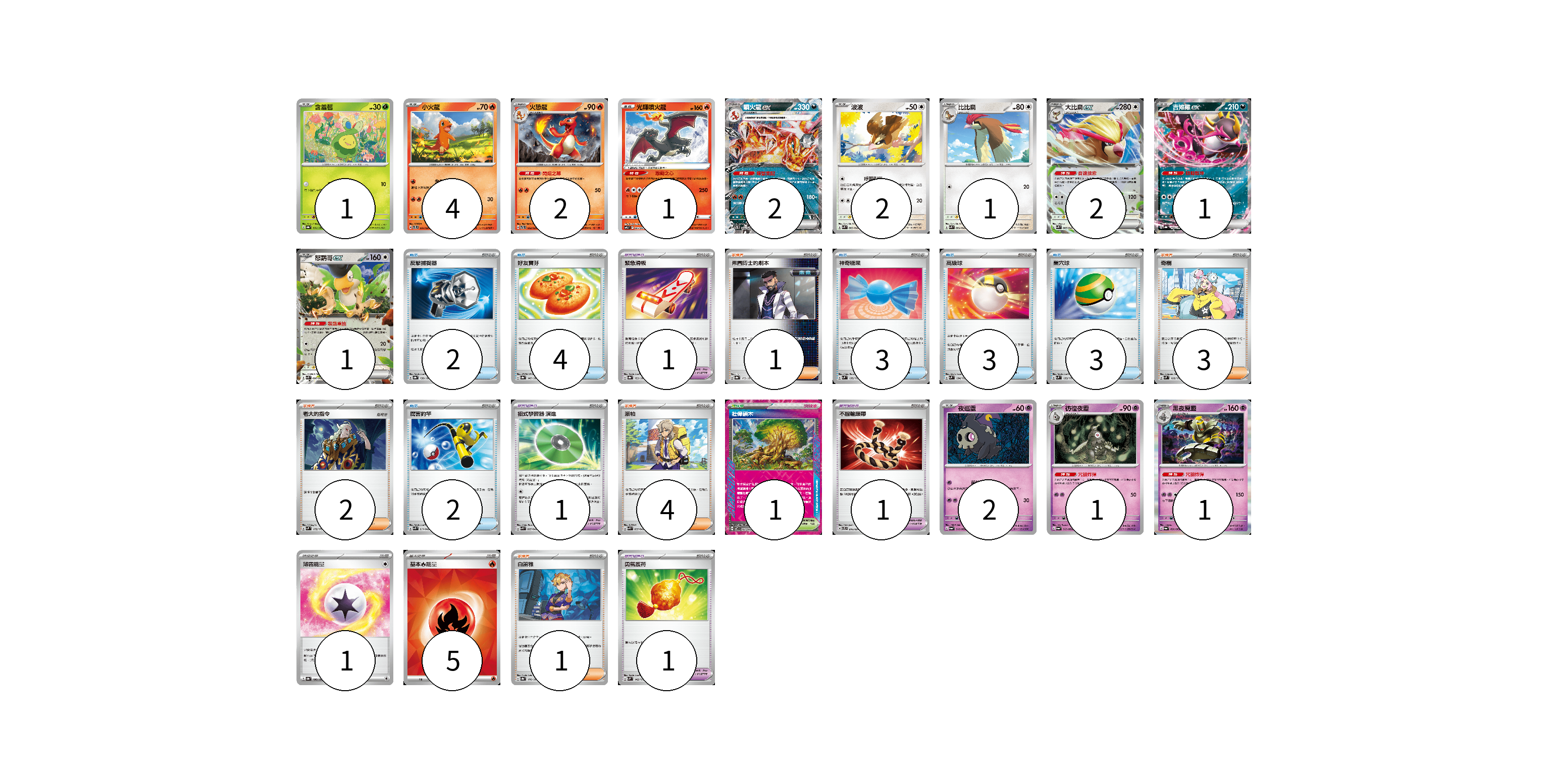 牌組構築方案 以此牌組為基礎新構築牌組 顯示卡面 顯示列表 寶可夢卡(21) 1 4 2 1 2 2 1 2 1 1 2 1 1 寶可夢道具(4) 1 1 1 1 物品卡(17) 2 4 3 3 3 2 支援者卡(11) 1 3 2 4 1 競技場卡(1) 1 能量卡(6) 1 5 寶可夢卡(21) 卡牌名稱 張數 卡牌名稱 張數 含羞苞 SV8a 001/187 01 小火龍 SVTL 001/021 04 火恐龍 SVTL 002/021 02 光輝噴火龍 SVTL 003/021 01 噴火龍ex SVTL 006/021 02 波波 SVK 003/042 02 比比鳥 SVK 004/042 01 大比鳥ex SVK 005/042 02 吉雉雞ex SV8a 104/187 01 怒鸚哥ex SVK 006/042 01 夜巡靈 SV6a 018/064 02 彷徨夜靈 SV6a 019/064 01 黑夜魔靈 SV6a 020/064 01 寶可夢道具(4) 卡牌名稱 張數 卡牌名稱 張數 緊急滑板 SV8a 153/187 01 招式學習器 演進 SVK 025/042 01 不服輸頭帶 SVTL 016/021 01 勇氣護符 SVM 142/175 01 物品卡(17) 卡牌名稱 張數 卡牌名稱 張數 反擊捕捉器 SV8a 139/187 02 好友寶芬 SV8a 147/187 04 神奇糖果 SVM 135/175 03 高級球 SVM 134/175 03 巢穴球 SVM 133/175 03 厲害釣竿 SVK 011/042 02 支援者卡(11) 卡牌名稱 張數 卡牌名稱 張數 弗圖博士的劇本 SV8a 175/187 01 奇樹 SVM 160/175 03 老大的指令 SVM 172/175 02 派帕 SVK 035/042 04 白蕾雅 SV8a 176/187 01 競技場卡(1) 卡牌名稱 張數 卡牌名稱 張數 壯偉碩木 SV7 101/102 01 能量卡(6) 卡牌名稱 張數 卡牌名稱 張數 薄霧能量 SV8a 186/187 01 基本【火】能量 SVK FIR 05 以此牌組為基礎新構築牌組 牌組編碼 dMKbWr-FmCPta-FjtBow copy 列印牌組單 牌組編碼已複製 分享至SNS