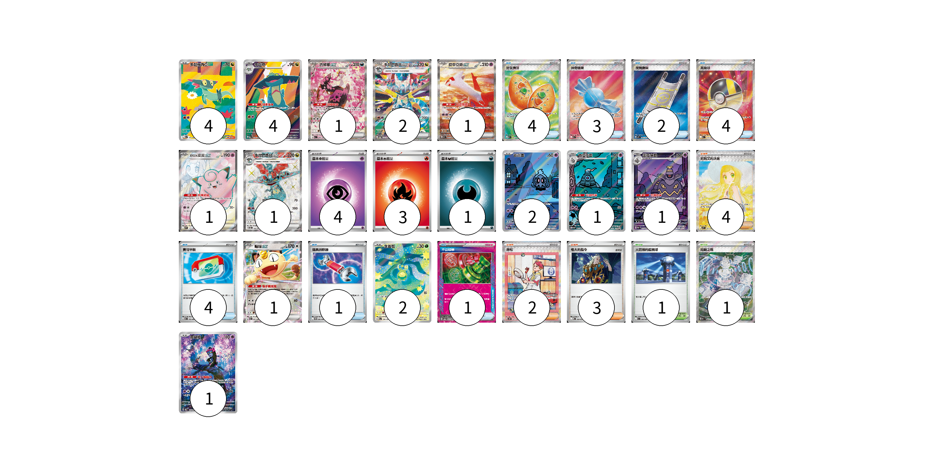 牌組構築方案 以此牌組為基礎新構築牌組 顯示卡面 顯示列表 寶可夢卡(22) 4 4 1 2 1 1 1 2 1 1 1 2 1 物品卡(19) 4 3 2 4 4 1 1 支援者卡(9) 4 2 3 競技場卡(2) 1 1 能量卡(8) 4 3 1 寶可夢卡(22) 卡牌名稱 張數 卡牌名稱 張數 多龍梅西亞 M2a 211/193 04 多龍奇 M2a 212/193 04 吉雉雞ex M2a 244/193 01 多龍巴魯托ex SV8a 221/187 02 拉帝亞斯ex SV7a 087/064 01 莉莉艾的皮皮ex SV9 115/100 01 多龍巴魯托ex SV6 120/101 01 夜巡靈 SV6a 068/064 02 彷徨夜靈 SV6a 069/064 01 黑夜魔靈 SV6a 070/064 01 喵喵ex M3 061/080 01 含羞苞 M2a 196/193 02 願增猿 SV6 107/101 01 物品卡(19) 卡牌名稱 張數 卡牌名稱 張數 好友寶芬 M1S 081/063 04 神奇糖果 M1S 082/063 03 夜間擔架 M1L 083/063 02 高級球 M2a 216/193 04 寶可平板 M3 070/080 04 道具拆除器 SV11W 080/086 01 不公印章 SV5a 053/066 01 支援者卡(9) 卡牌名稱 張數 卡牌名稱 張數 莉莉艾的決意 M1L 091/063 04 赤松 SV8a 227/187 02 老大的指令 MBD 020/022 03 競技場卡(2) 卡牌名稱 張數 卡牌名稱 張數 火箭隊的監視塔 SV10 096/098 01 阻礙之塔 M2a 222/193 01 能量卡(8) 卡牌名稱 張數 卡牌名稱 張數 基本【超】能量 MBD PSY 04 基本【火】能量 MC FIR 03 基本【惡】能量 MBG DAR 01 以此牌組為基礎新構築牌組 牌組編碼 dMgfea-hylbXC-CSLTXq copy 列印牌組單 牌組編碼已複製 分享至SNS