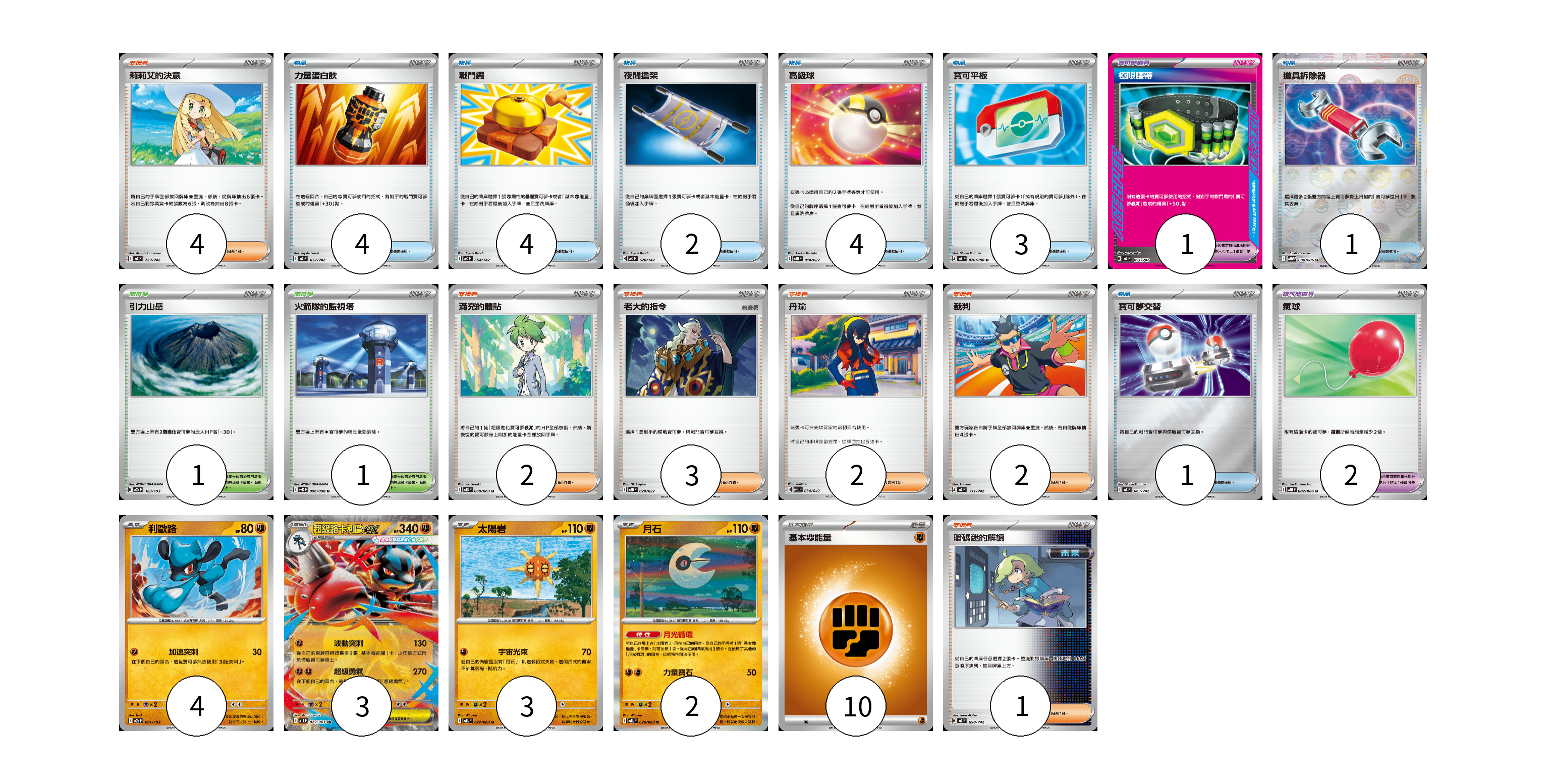 牌組構築方案 以此牌組為基礎新構築牌組 顯示卡面 顯示列表 寶可夢卡(12) 4 3 3 2 寶可夢道具(3) 1 2 物品卡(19) 4 4 2 4 3 1 1 支援者卡(14) 4 2 3 2 2 1 競技場卡(2) 1 1 能量卡(10) 10 寶可夢卡(12) 卡牌名稱 張數 卡牌名稱 張數 利歐路 M2a 091/193 04 超級路卡利歐ex M1L 029/063 03 太陽岩 M1L 027/063 03 月石 M1L 026/063 02 寶可夢道具(3) 卡牌名稱 張數 卡牌名稱 張數 極限腰帶 MC 691/742 01 氣球 SV11B 082/086 02 物品卡(19) 卡牌名稱 張數 卡牌名稱 張數 力量蛋白飲 MC 652/742 04 戰鬥鑼 MC 654/742 04 夜間擔架 MC 670/742 02 高級球 MBD 014/022 04 寶可平板 M3 070/080 03 道具拆除器 SV11W 080/086 01 寶可夢交替 MC 663/742 01 支援者卡(14) 卡牌名稱 張數 卡牌名稱 張數 莉莉艾的決意 MC 729/742 04 滿充的體貼 M1S 060/063 02 老大的指令 MBD 020/022 03 丹瑜 SVK 030/042 02 裁判 MC 711/742 02 暗碼迷的解讀 MC 698/742 01 競技場卡(2) 卡牌名稱 張數 卡牌名稱 張數 引力山岳 M2a 183/193 01 火箭隊的監視塔 SV10 096/098 01 能量卡(10) 卡牌名稱 張數 卡牌名稱 張數 基本【鬥】能量 MC FIG 10 以此牌組為基礎新構築牌組 牌組編碼 dNGRtj-nlNfut-HlXglg copy 列印牌組單 牌組編碼已複製 分享至SNS