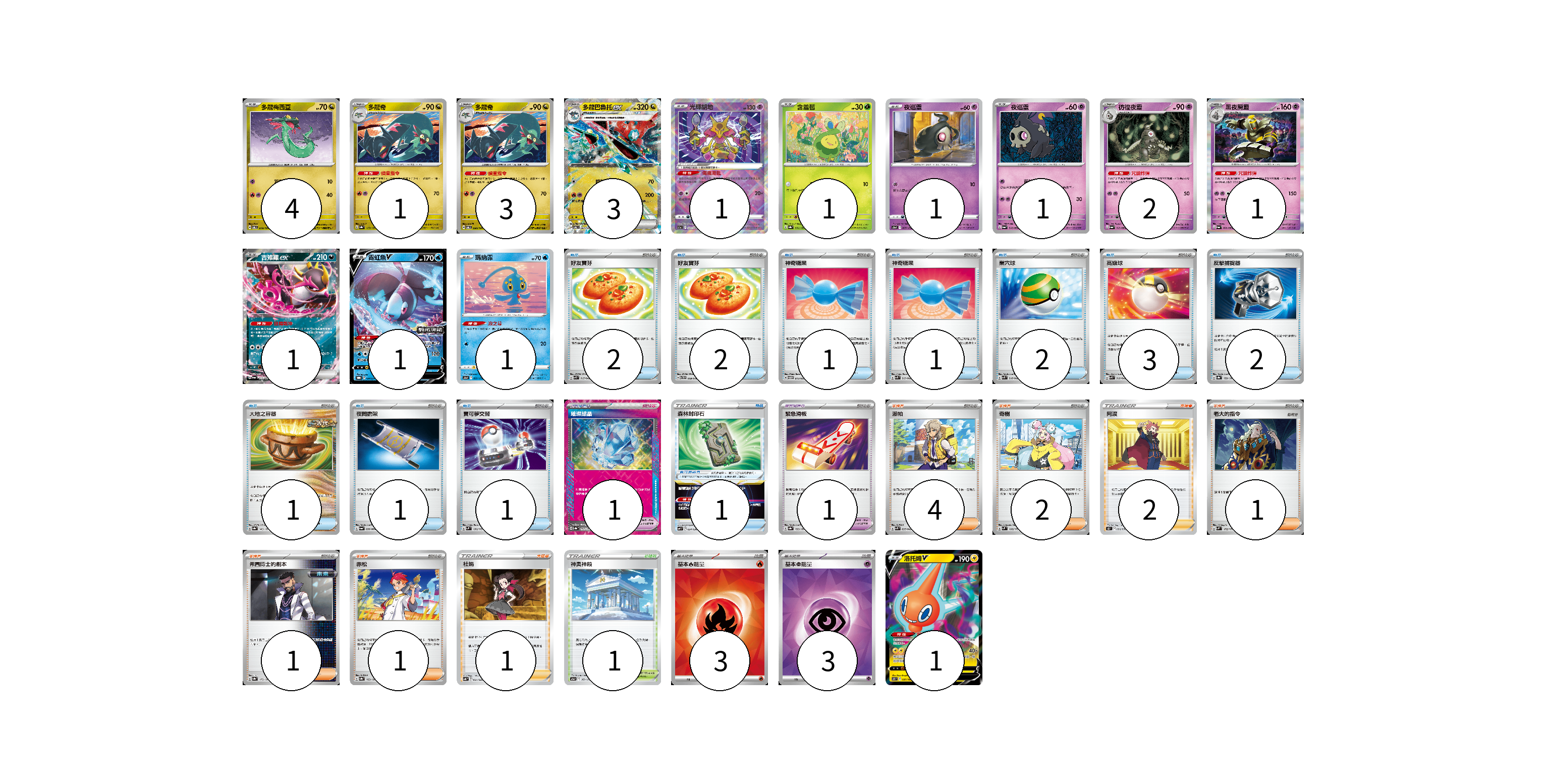 牌組構築方案 以此牌組為基礎新構築牌組 顯示卡面 顯示列表 寶可夢卡(22) 4 1 3 3 1 1 1 1 2 1 1 1 1 1 寶可夢道具(2) 1 1 物品卡(17) 2 2 1 1 2 3 2 1 1 1 1 支援者卡(12) 4 2 2 1 1 1 1 競技場卡(1) 1 能量卡(6) 3 3 寶可夢卡(22) 卡牌名稱 張數 卡牌名稱 張數 多龍梅西亞 SV6 079/101 04 多龍奇 SV8a 119/187 01 多龍奇 SV6 080/101 03 多龍巴魯托ex SV6 081/101 03 光輝胡地 S11a 031/068 01 含羞苞 SV8a 001/187 01 夜巡靈 S12a 057/172 01 夜巡靈 SV6a 018/064 01 彷徨夜靈 SV6a 019/064 02 黑夜魔靈 SV6a 020/064 01 吉雉雞ex SV6a 038/064 01 霓虹魚V SV-P 134/SV-P 01 瑪納霏 S12a 029/172 01 洛托姆V S11 037/100 01 寶可夢道具(2) 卡牌名稱 張數 卡牌名稱 張數 璀璨結晶 SV8a 152/187 01 緊急滑板 SV8a 153/187 01 物品卡(17) 卡牌名稱 張數 卡牌名稱 張數 好友寶芬 SVK 015/042 02 好友寶芬 SVTH 009/018 02 神奇糖果 SVTM 013/022 01 神奇糖果 SVK 019/042 01 巢穴球 SVK 016/042 02 高級球 SVK 018/042 03 反擊捕捉器 SV8a 139/187 02 大地之容器 SV8a 143/187 01 夜間擔架 SV6a 056/064 01 寶可夢交替 SVM 136/175 01 森林封印石 SVF 024/038 01 支援者卡(12) 卡牌名稱 張數 卡牌名稱 張數 派帕 SVK 035/042 04 奇樹 SVM 160/175 02 阿渡 S12 096/098 02 老大的指令 SVM 172/175 01 弗圖博士的劇本 SV8a 175/187 01 赤松 SV8a 163/187 01 杜娟 SVB 021/028 01 競技場卡(1) 卡牌名稱 張數 卡牌名稱 張數 神奧神殿 S12a 169/172 01 能量卡(6) 卡牌名稱 張數 卡牌名稱 張數 基本【火】能量 SVK FIR 03 基本【超】能量 SVK PSY 03 以此牌組為基礎新構築牌組 牌組編碼 dRSXMG-hXpCWM-WUrxJn copy 列印牌組單 牌組編碼已複製 分享至SNS