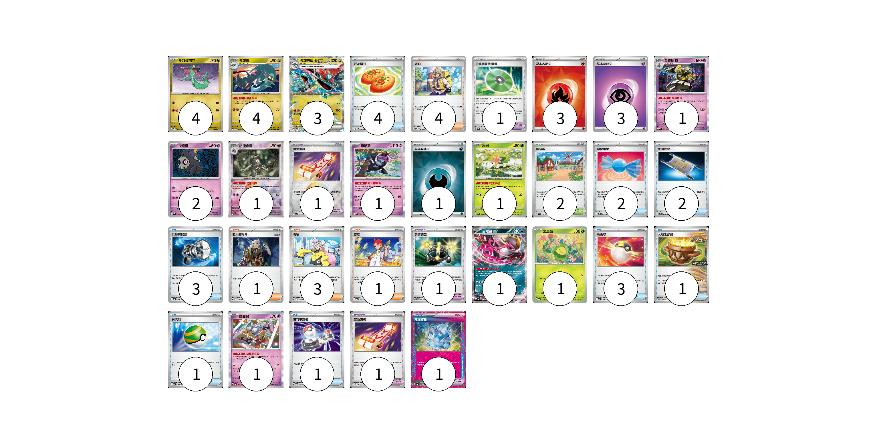 牌組構築方案 以此牌組為基礎新構築牌組 顯示卡面 顯示列表 寶可夢卡(20) 4 4 3 1 2 1 1 1 1 1 1 寶可夢道具(5) 1 1 1 1 1 物品卡(17) 4 2 2 3 3 1 1 1 支援者卡(9) 4 1 3 1 競技場卡(2) 2 能量卡(7) 3 3 1 寶可夢卡(20) 卡牌名稱 張數 卡牌名稱 張數 多龍梅西亞 SV6 079/101 04 多龍奇 SV6 080/101 04 多龍巴魯托ex SV6 081/101 03 黑夜魔靈 SV6a 020/064 01 夜巡靈 SV8a 064/187 02 彷徨夜靈 SV8a 065/187 01 願增猿 SV8a 075/187 01 謝米 SV9a 006/063 01 吉雉雞ex SV6a 038/064 01 含羞苞 SV8a 001/187 01 鑰圈兒 SV4a 087/190 01 寶可夢道具(5) 卡牌名稱 張數 卡牌名稱 張數 招式學習器 演進 SV8a 160/187 01 緊急滑板 SV8a 153/187 01 學習裝置 SVTM 016/022 01 緊急滑板 SVOD 015/020 01 璀璨結晶 SV8a 152/187 01 物品卡(17) 卡牌名稱 張數 卡牌名稱 張數 好友寶芬 SVOD 011/020 04 神奇糖果 SVOD 013/020 02 夜間擔架 SVOM 016/021 02 反擊捕捉器 SV8a 139/187 03 高級球 SVM 134/175 03 大地之容器 SV-P 137/SV-P 01 巢穴球 SVM 133/175 01 寶可夢交替 SV9a 058/063 01 支援者卡(9) 卡牌名稱 張數 卡牌名稱 張數 派帕 SVOD 018/020 04 老大的指令 SVOD 019/020 01 奇樹 SVOD 016/020 03 赤松 SV8a 163/187 01 競技場卡(2) 卡牌名稱 張數 卡牌名稱 張數 深缽鎮 SV1a 070/073 02 能量卡(7) 卡牌名稱 張數 卡牌名稱 張數 基本【火】能量 SVK FIR 03 基本【超】能量 SVTS PSY 03 基本【惡】能量 SVOM DAR 01 以此牌組為基礎新構築牌組 牌組編碼 dSDJCA-wtCACT-RkogvK copy 列印牌組單 牌組編碼已複製 分享至SNS