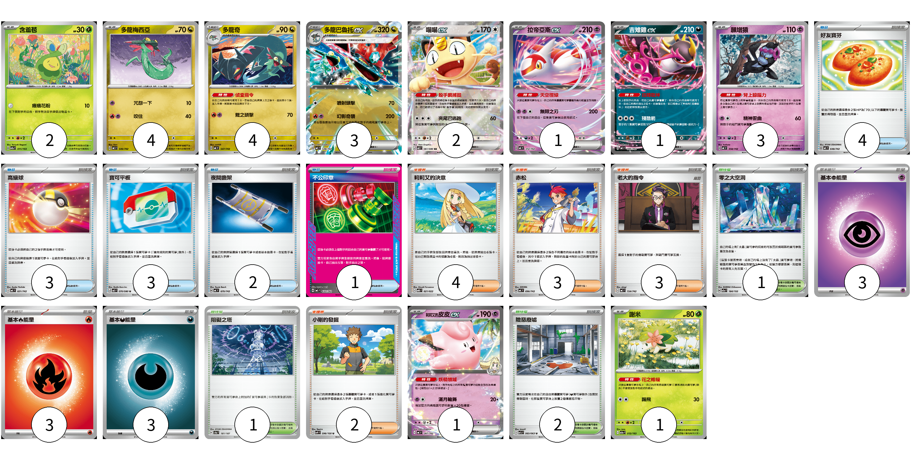 牌組構築方案 以此牌組為基礎新構築牌組 顯示卡面 顯示列表 寶可夢卡(22) 2 4 4 3 2 1 1 3 1 1 物品卡(13) 4 3 3 2 1 支援者卡(12) 4 3 3 2 競技場卡(4) 1 1 2 能量卡(9) 3 3 3 寶可夢卡(22) 卡牌名稱 張數 卡牌名稱 張數 含羞苞 M2a 011/193 02 多龍梅西亞 MC 546/742 04 多龍奇 MC 547/742 04 多龍巴魯托ex MC 548/742 03 喵喵ex M3 061/080 02 拉帝亞斯ex MC 312/742 01 吉雉雞ex MC 489/742 01 願增猿 MC 358/742 03 莉莉艾的皮皮ex MC 287/742 01 謝米 M2a 012/193 01 物品卡(13) 卡牌名稱 張數 卡牌名稱 張數 好友寶芬 MC 648/742 04 高級球 MC 651/742 03 寶可平板 M3 070/080 03 夜間擔架 MC 670/742 02 不公印章 MC 633/742 01 支援者卡(12) 卡牌名稱 張數 卡牌名稱 張數 莉莉艾的決意 MBD 021/022 04 赤松 MC 696/742 03 老大的指令 MC 724/742 03 小剛的發掘 SV9 096/100 02 競技場卡(4) 卡牌名稱 張數 卡牌名稱 張數 零之大空洞 M2a 184/193 01 阻礙之塔 SV8a 181/187 01 險惡廢墟 M1L 063/063 02 能量卡(9) 卡牌名稱 張數 卡牌名稱 張數 基本【超】能量 M-P PSY 03 基本【火】能量 MC FIR 03 基本【惡】能量 MC DAR 03 以此牌組為基礎新構築牌組 牌組編碼 dSHhjd-eHwzxr-wCBvjl copy 列印牌組單 牌組編碼已複製 分享至SNS
